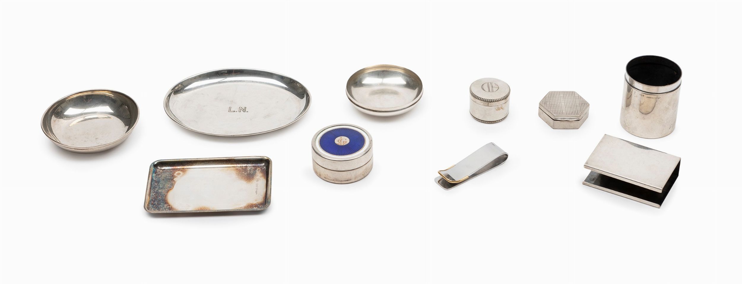 XX secolo tre scatole, un fermasoldi, un portafiammiferi, quattro piattini e un porta spilli.