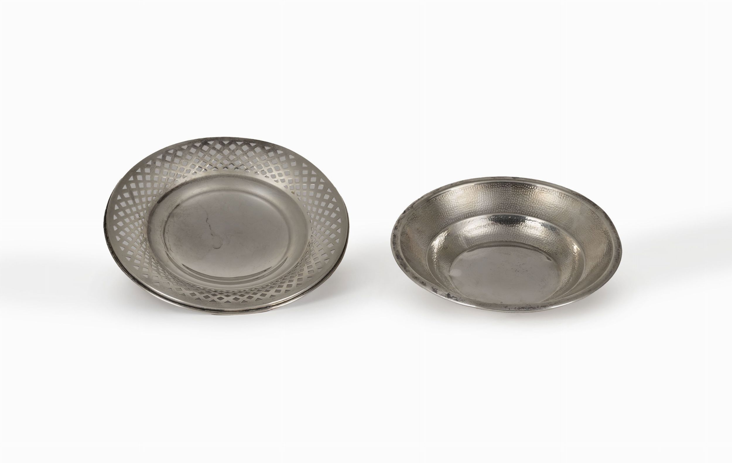 Italia, XX secolo un cestino a decoro martellato ed un cestino con bordo traforato poggiante su tre piedini.