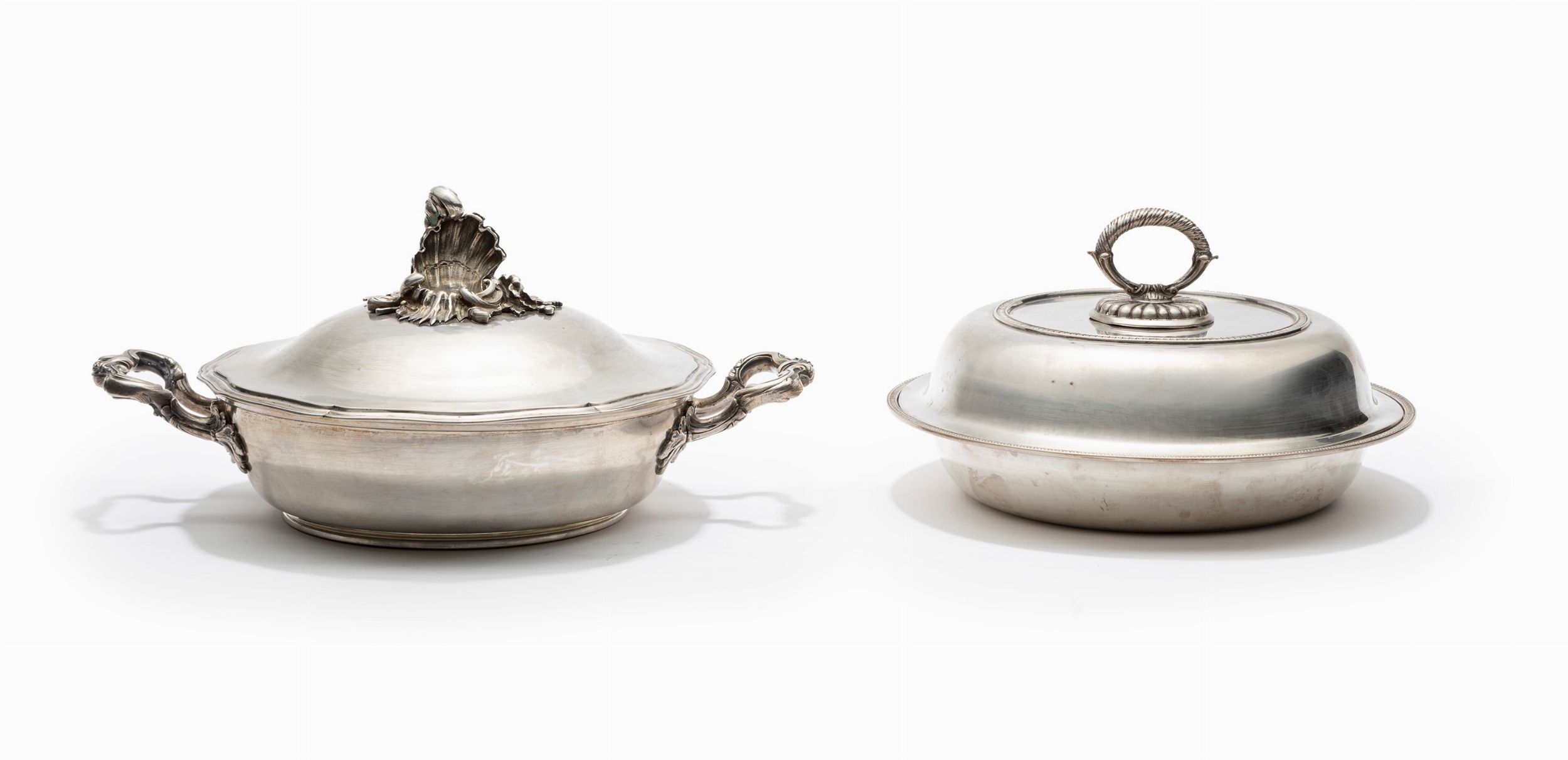 XX secolo di forma rotonda, una con decoro Impero e presa a maniglia e una con decoro floreale con coperchio polilobato e presa a foglie e fiori.