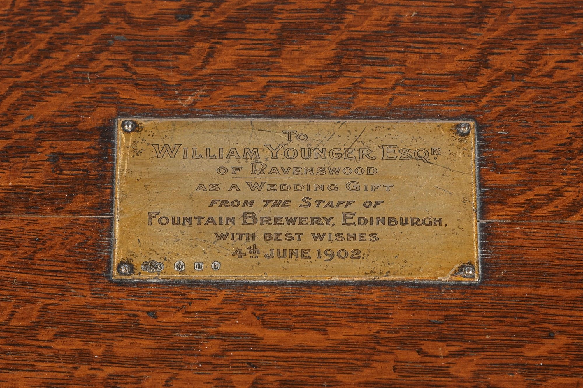 Città di Sheffield, 1887 riccamente sbalzato e dorato, composto da quattro candelieri con diffusori, quattro vassoi ovali con piedini e cinque alzate di misure diverse, in baule di rovere (cm 100x50x33) con placca in argento con dedica.
