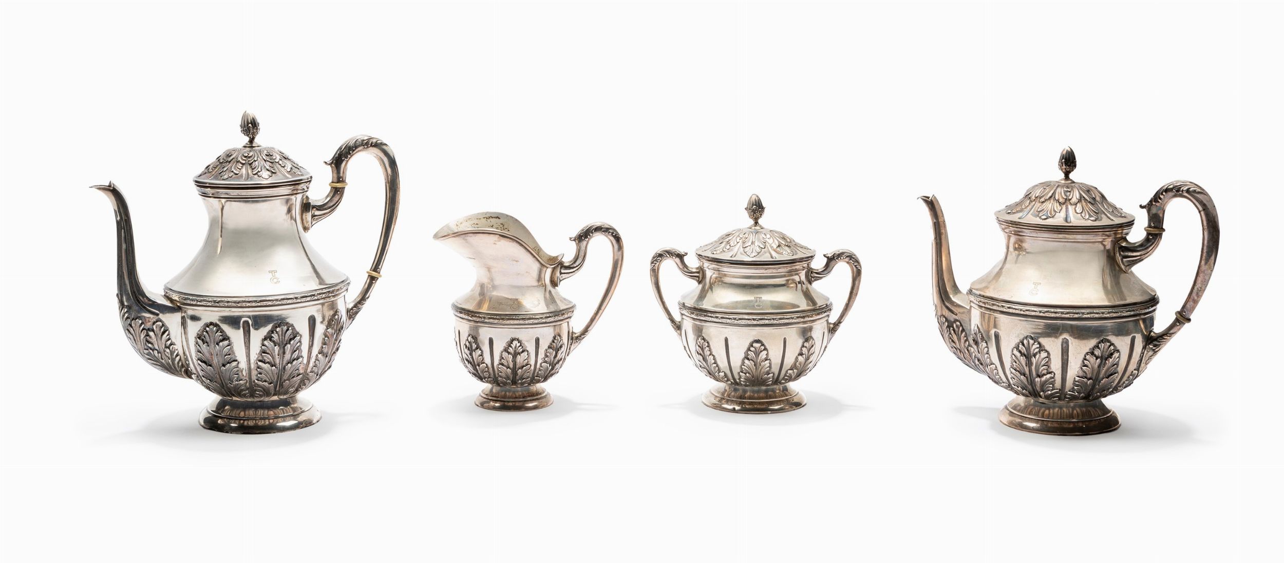 XX secolo composto da teiera, caffettiera, zuccheriera e lattiera con base rotonda, corpo con decoro a foglie, reca iniziali T.C.