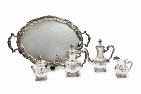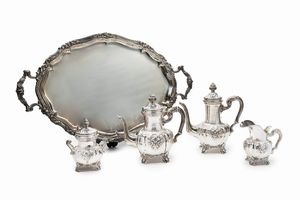 Italia, XX secolo composto da caffettiera, teiera, lattiera e zuccheriera con interno in vermeil, e vassoio a due manici, riccamente decorati a sbalzo.