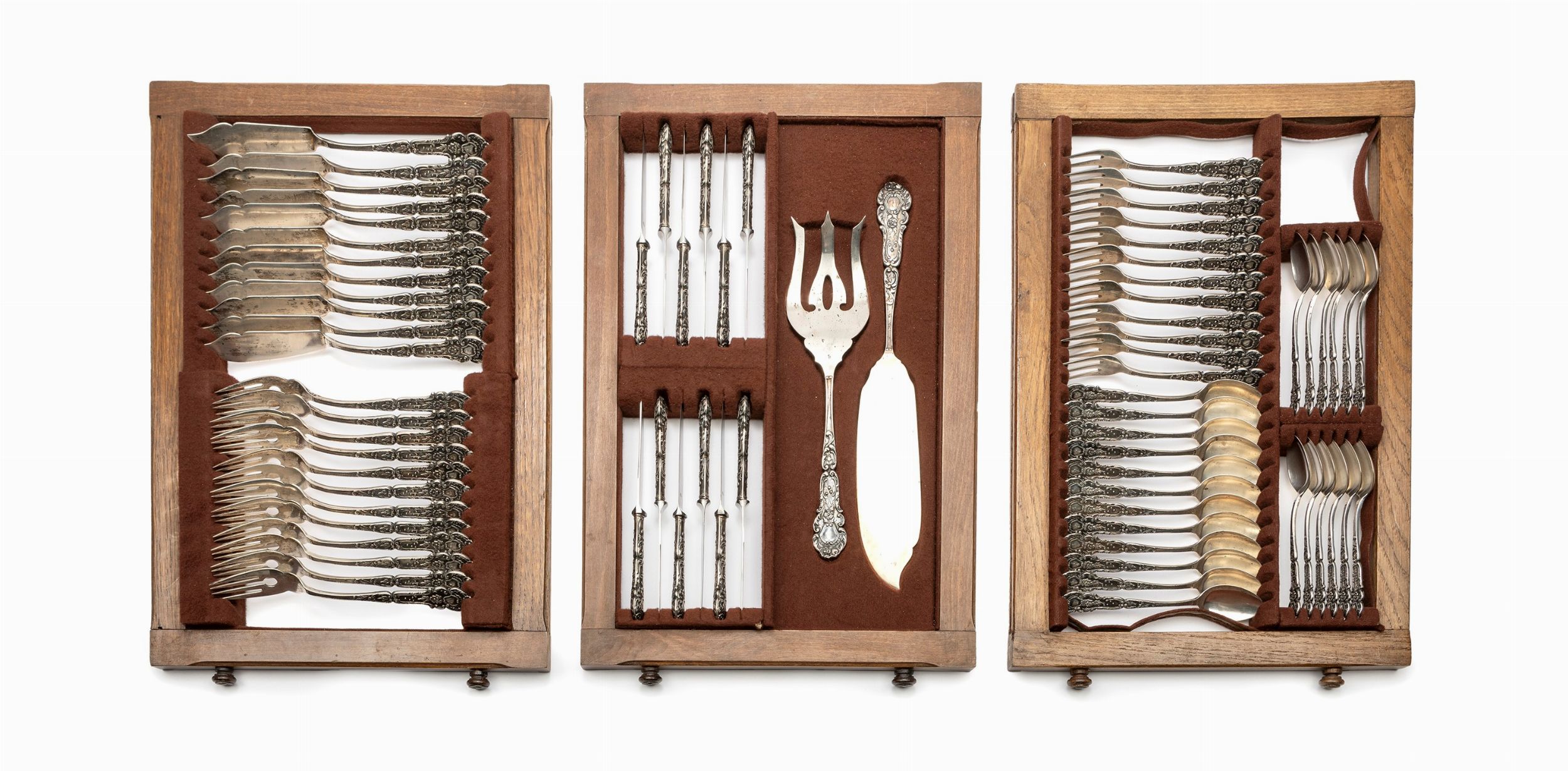12 forchette da esce, 12 coltelli da pesce, 12 cucchiaini da dolce, 12 forchettine da dolce, 12 cucchiaini piccoli, 12 coltellini piccoli e 2 serviti, in tre cassetti in legno.