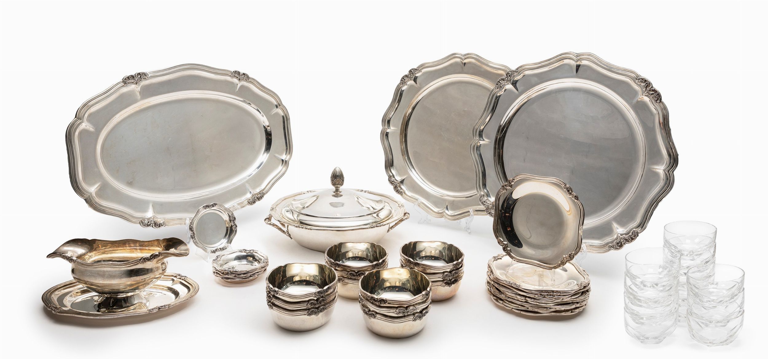 Egitto, XX secolo composto da 2 grandi piatti, 1 vassoio ovale, 1 zuppiera, 1 salsiera, 12 piattini, 6 sottobicchieri, 12 ciotole con cristalli.