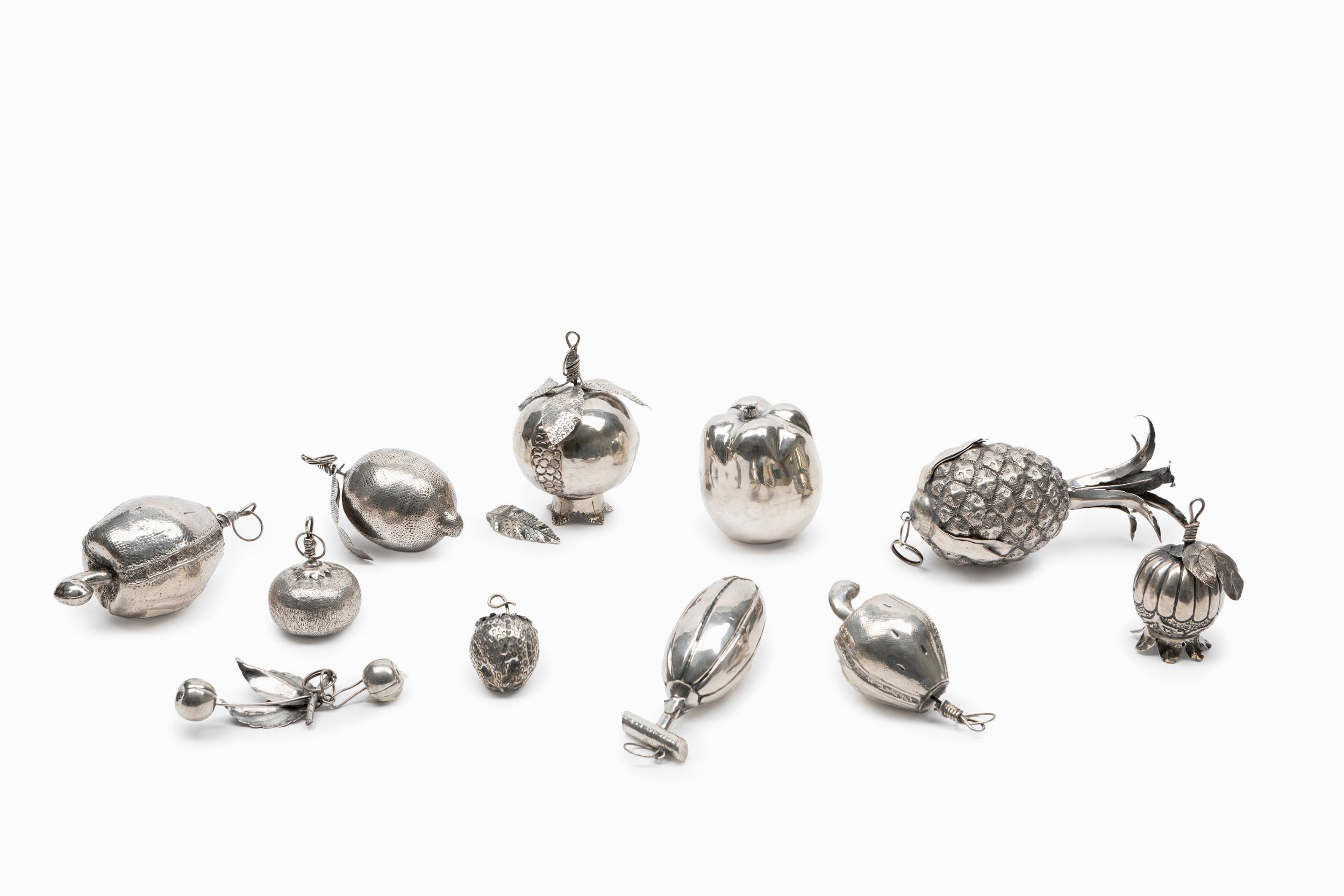 raffiguranti ananas, anacardo, fragola, ciliegie, melograno, mandarino, limone e cacao, di diverse dimensioni, difetti (mancanze).