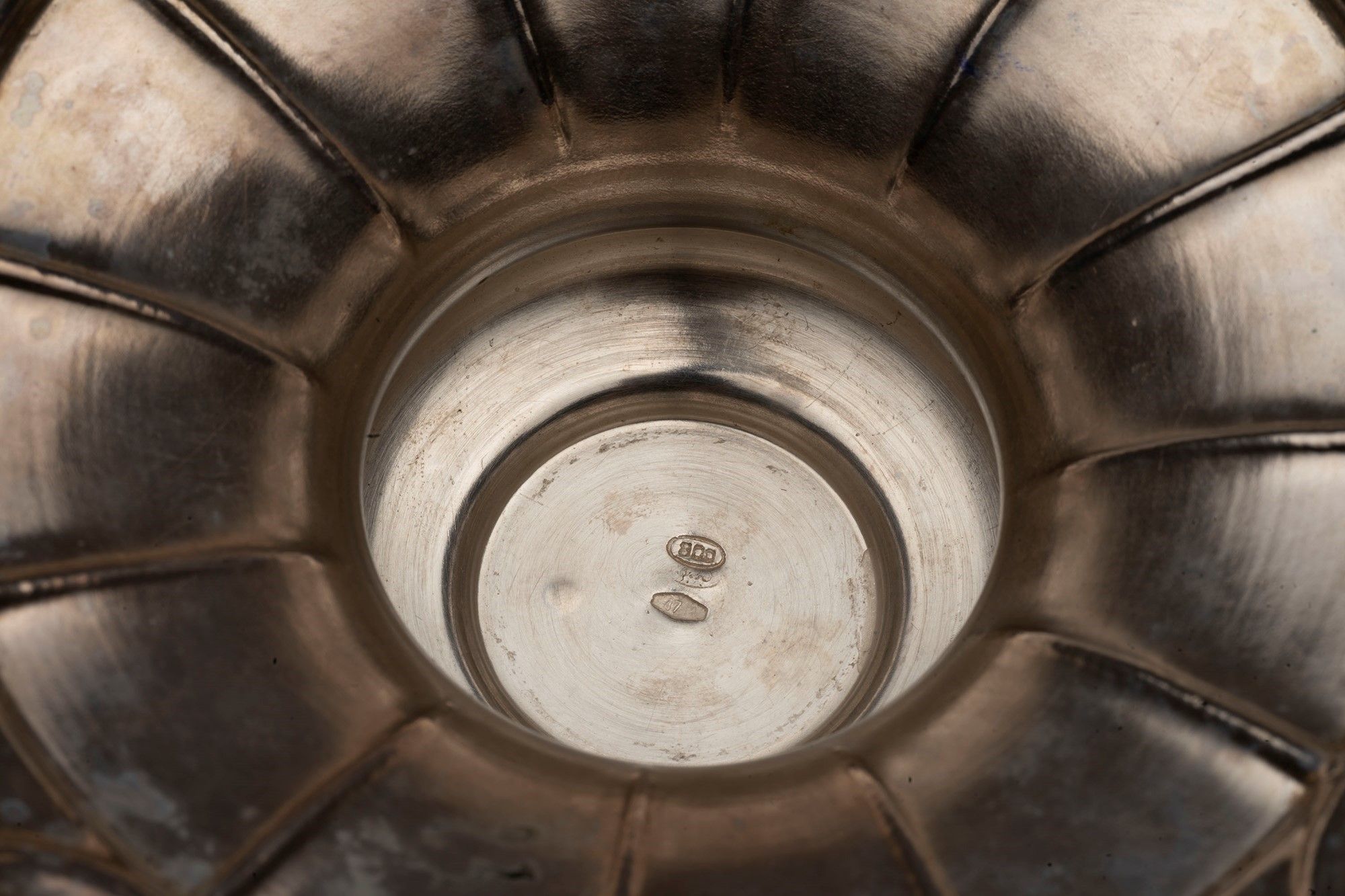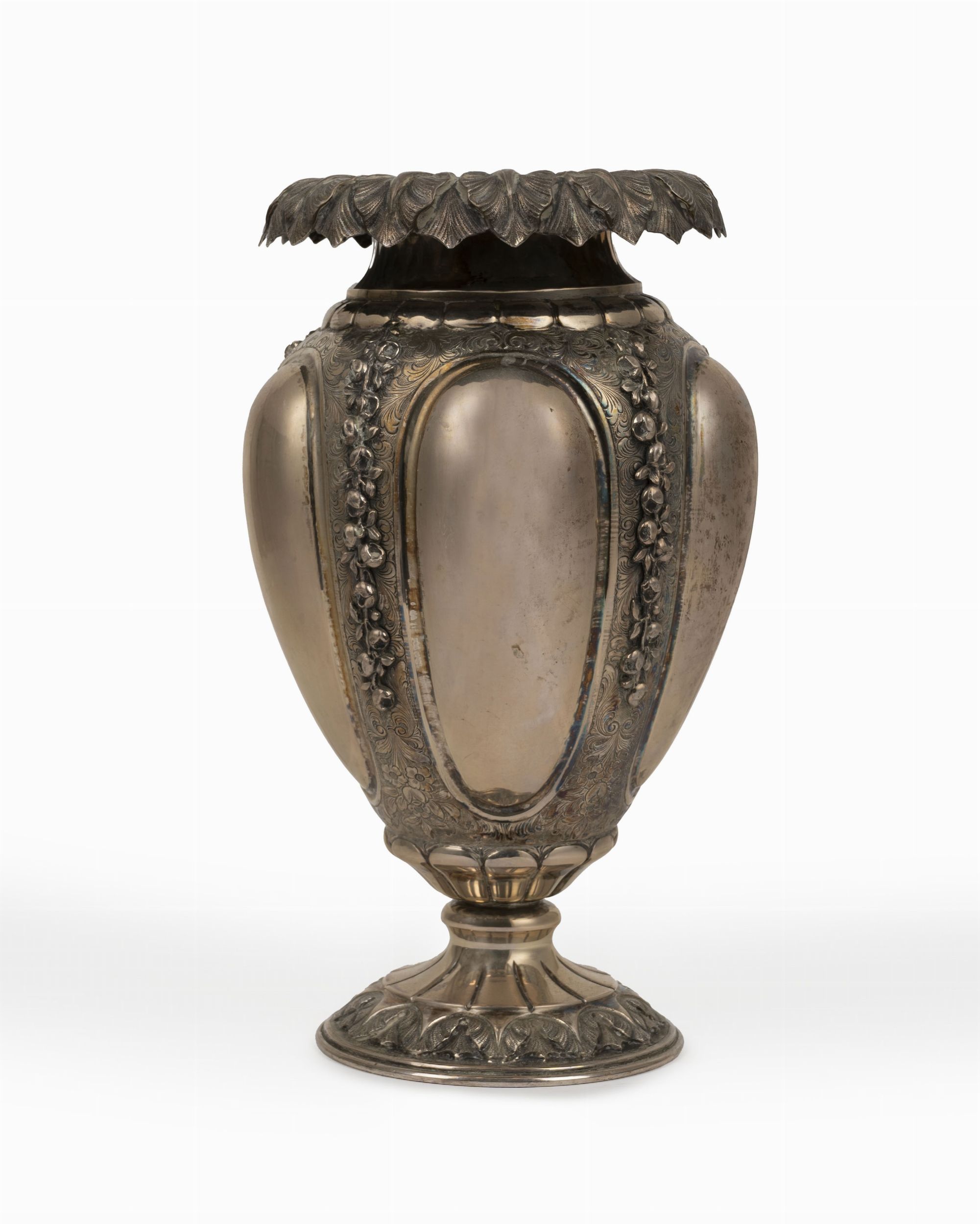 Italia, XX secolo a base rotonda, fusto ovale con decoro floreale cesellato e a rilievo.