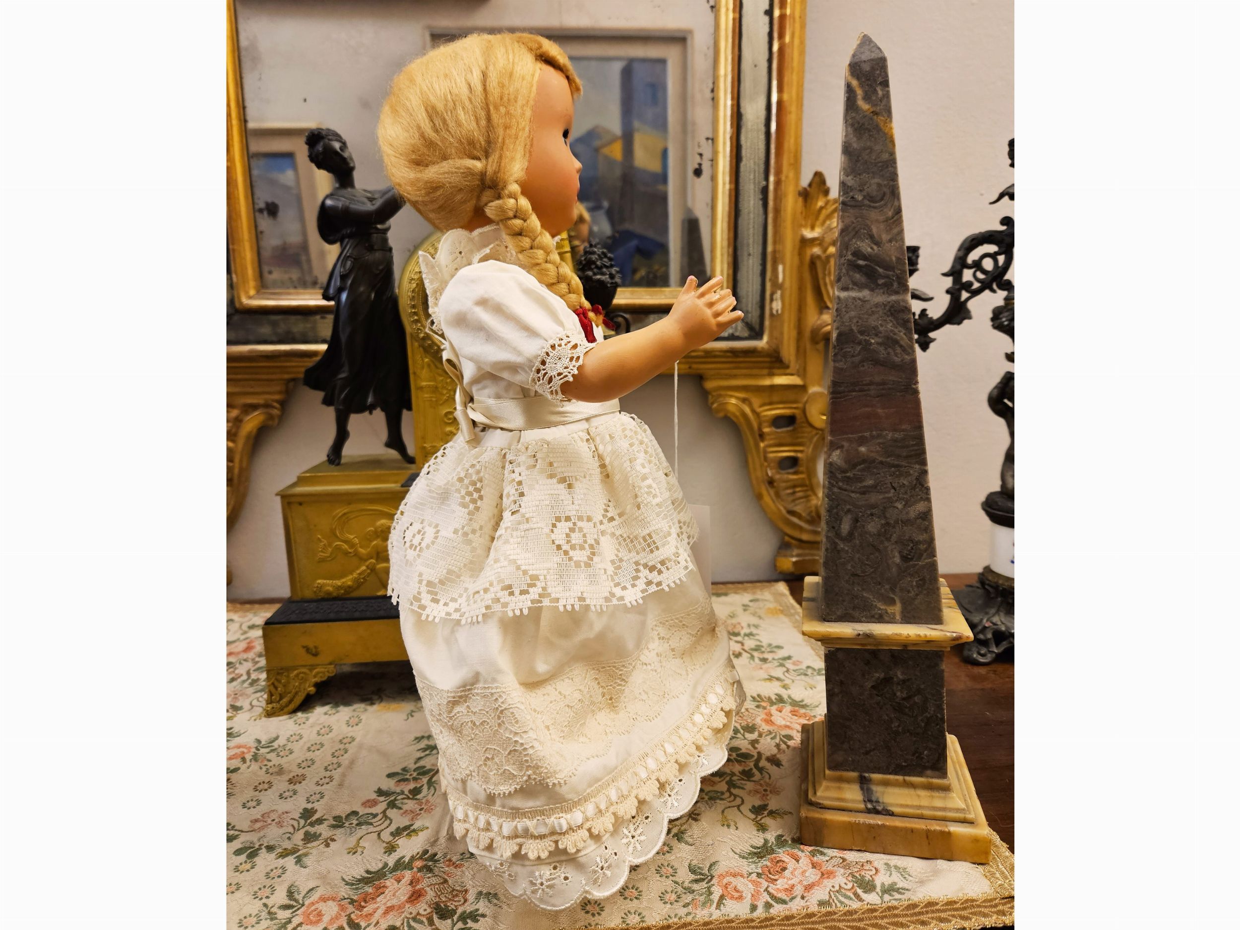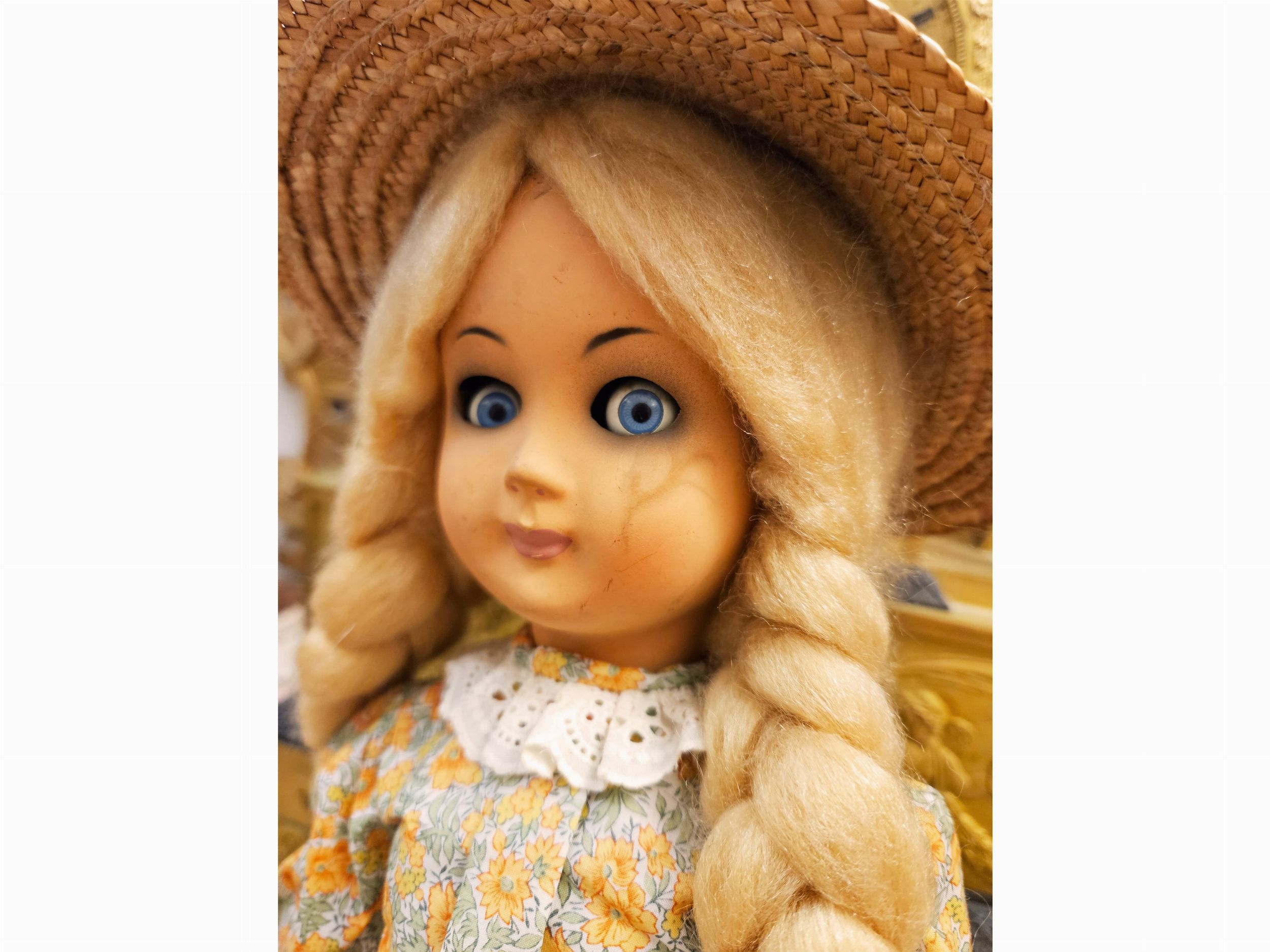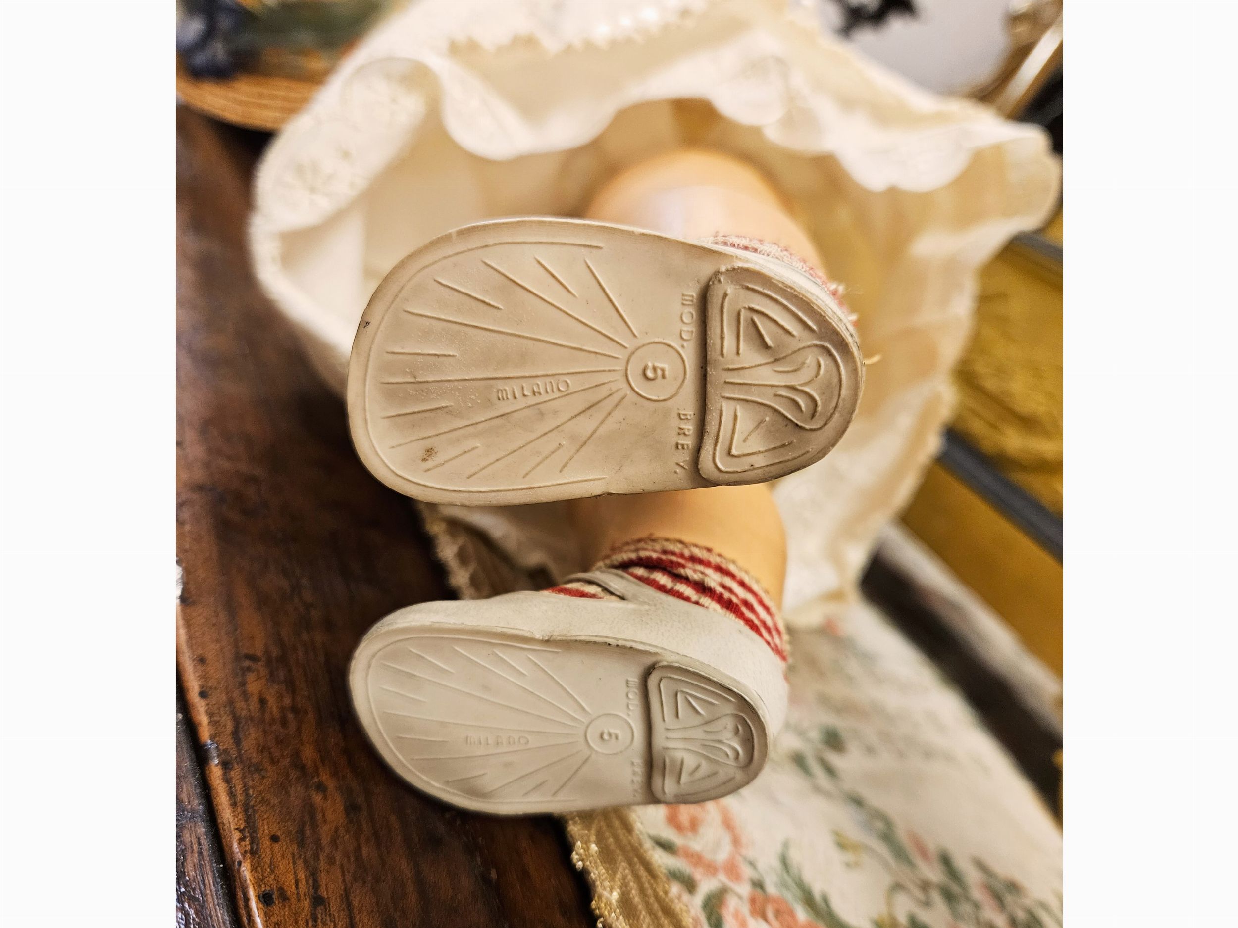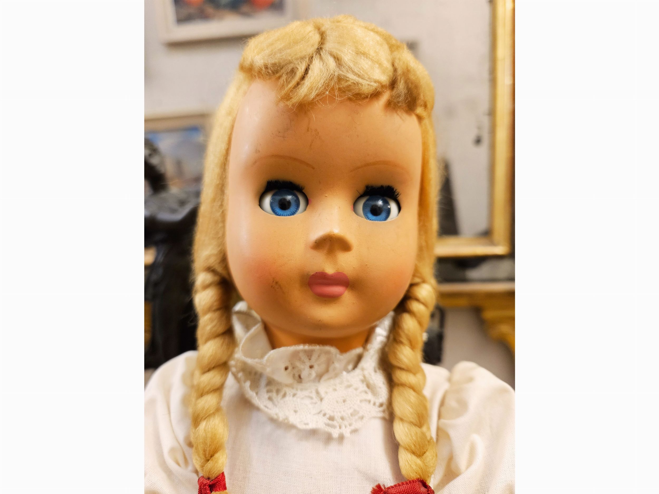 Italia, Anni Cinquanta Atena in polistirolo dipinto, occhi mobili in vetro con ciglia applicate, bocca chiusa, parrucca di mohair, corpo semi-articolato con arti ricurvi, scarpine originali, lieve difetto al dorso, marchio sulla nuca Athena 37; abbinata ad altra bambola in celluloide, senza marchio, con occhi mobili in vetro, parrucca in mohair, mancante di un dito della mano destra e con segno sul viso
