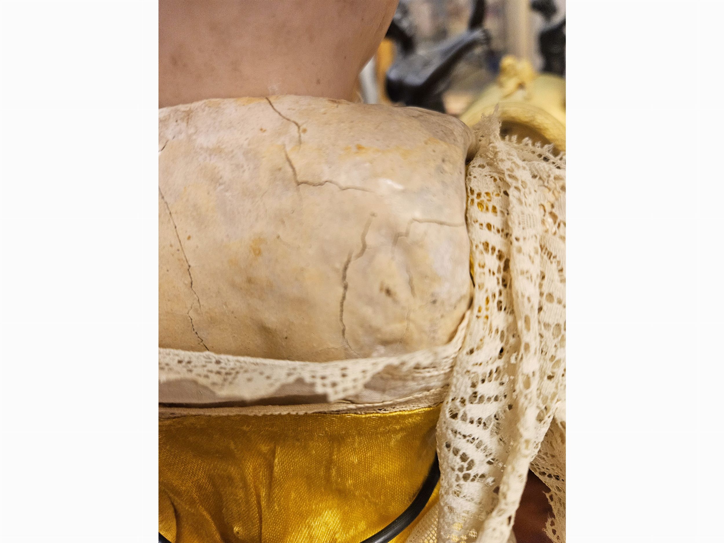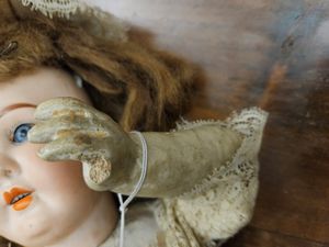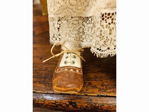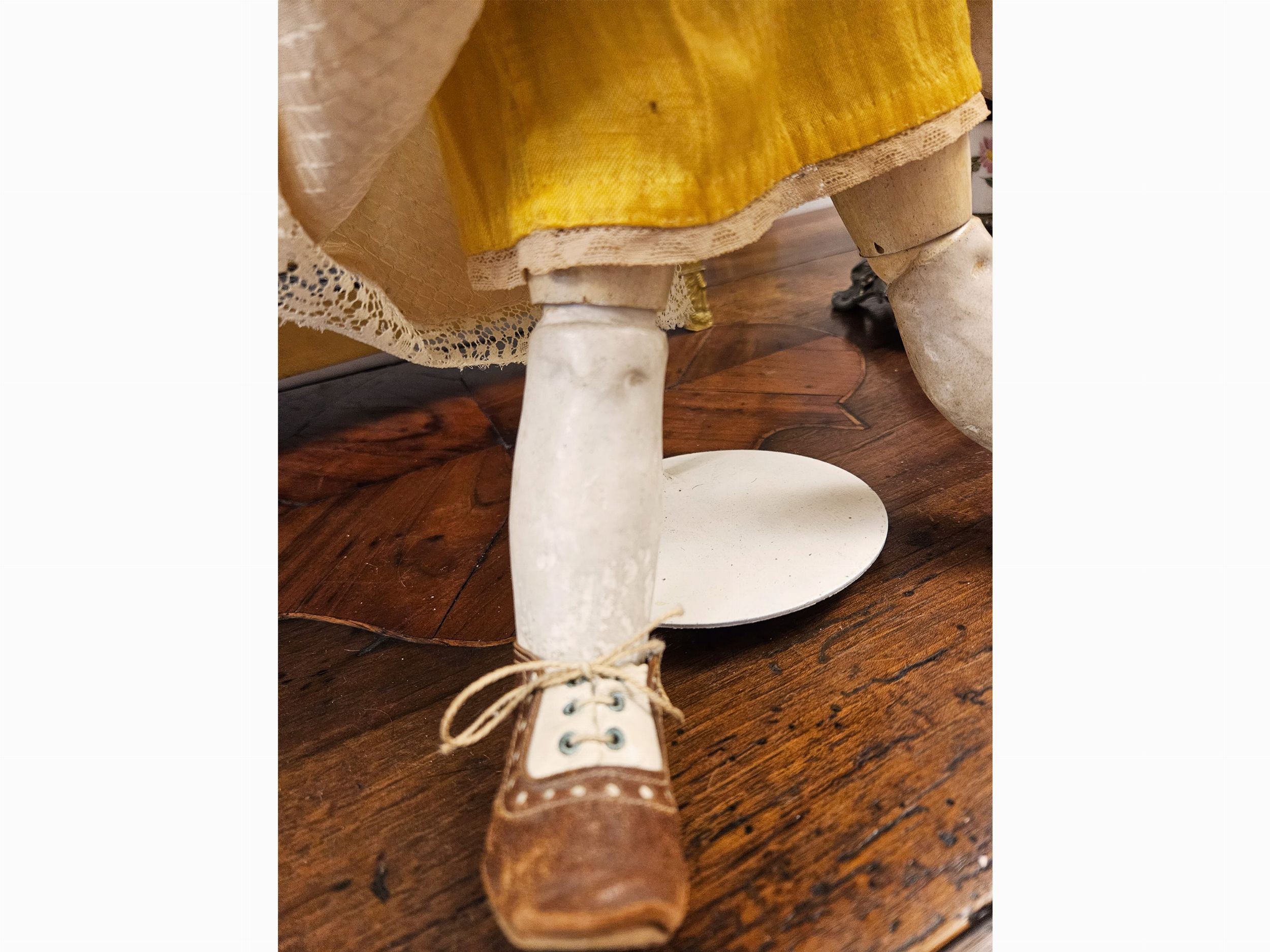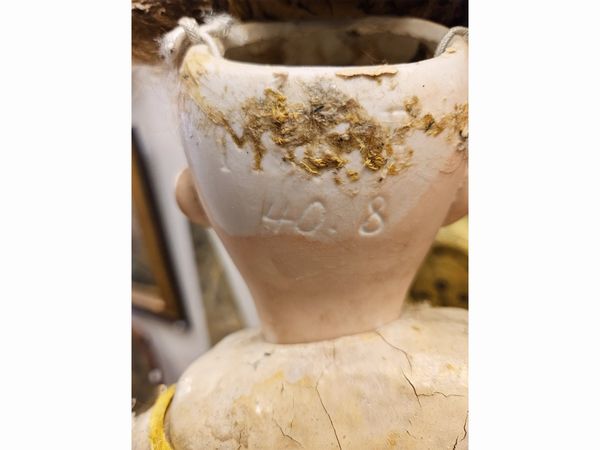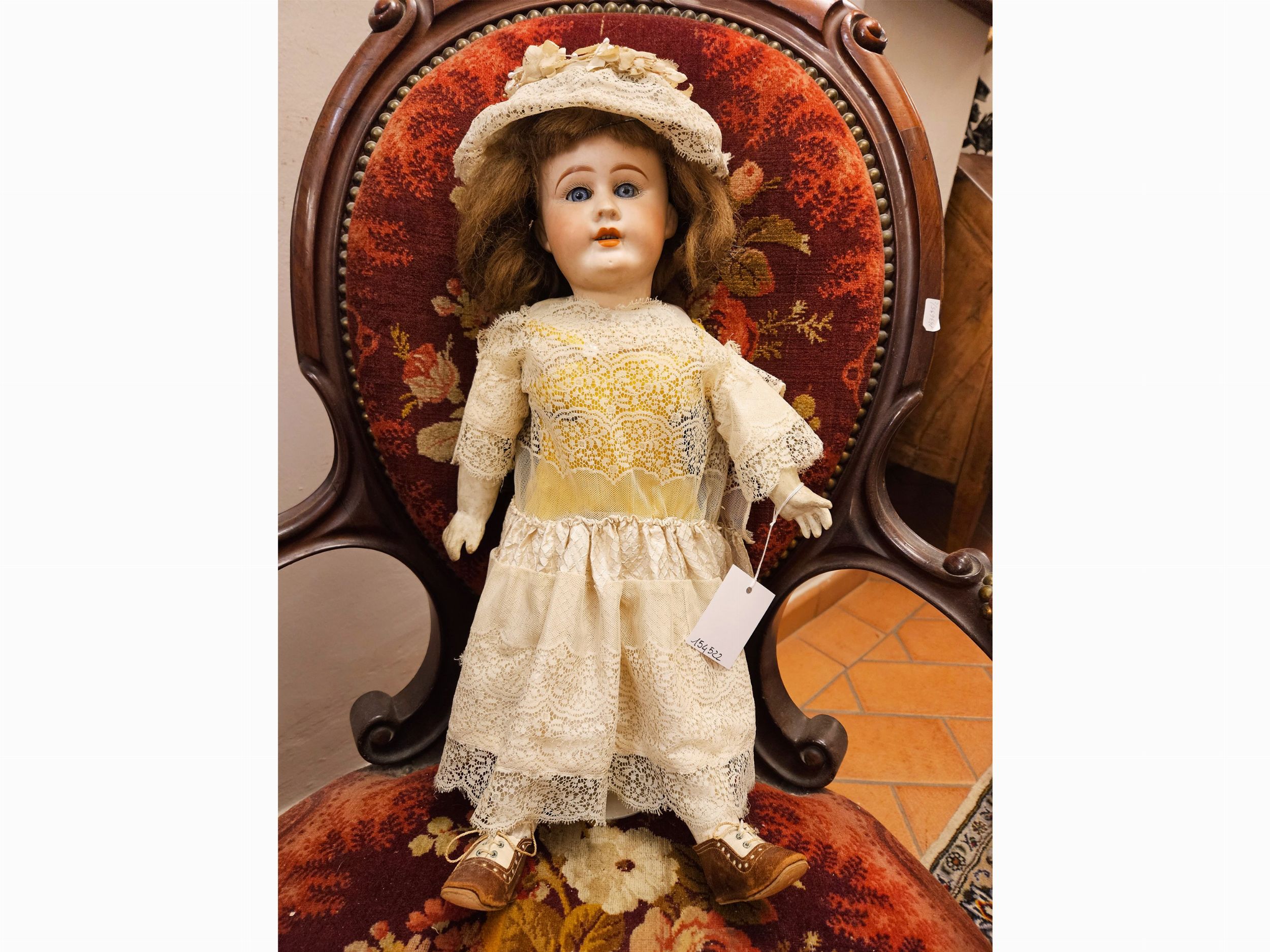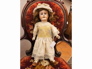 Manifattura europea, inizi del XX secolo occhi fissi in vetro, bocca aperta con dentini, parrucca in mohair, corpo semi-articolato in composizione, abiti d'epoca, lievi difetti, felure e sbeccature