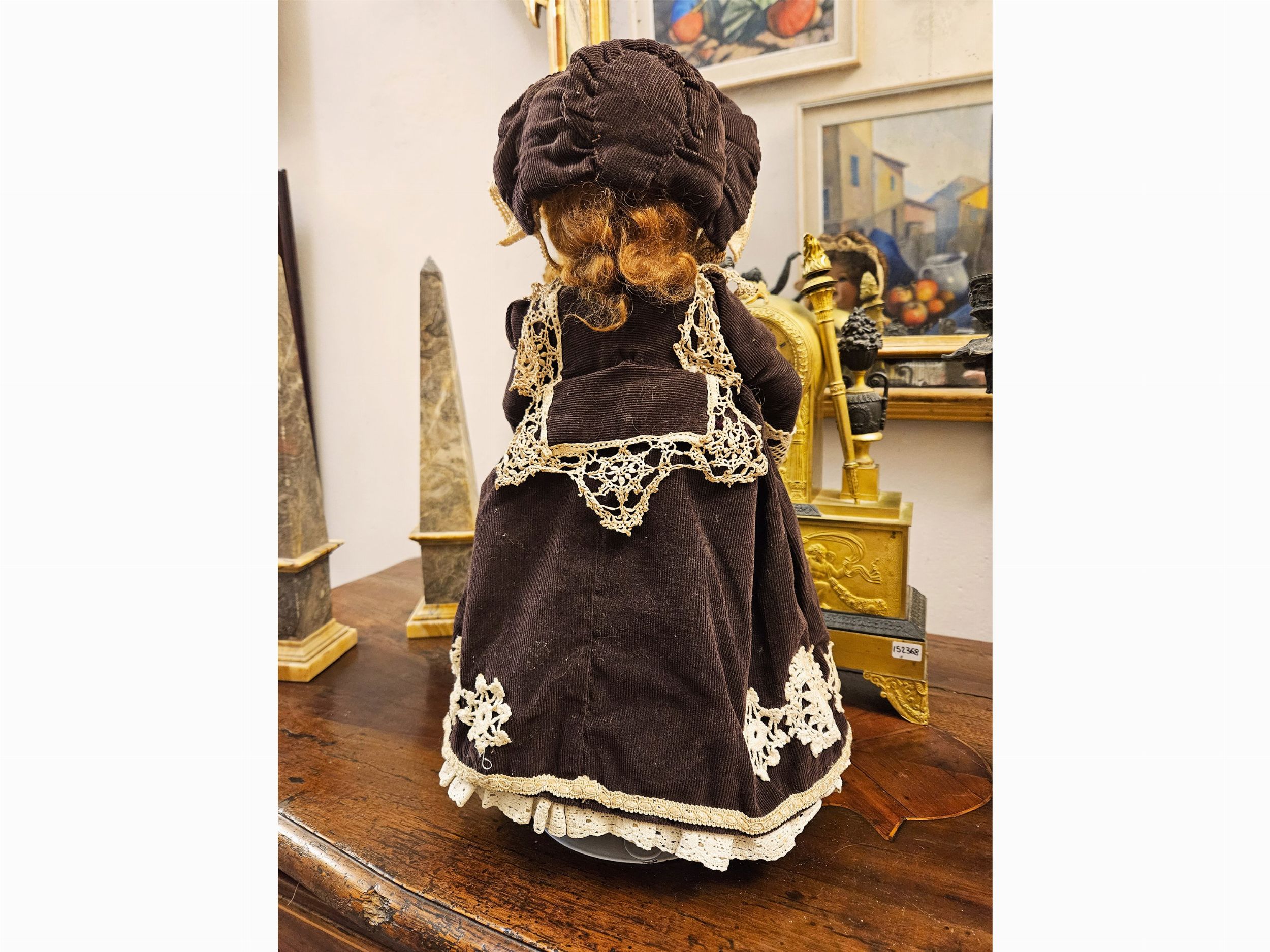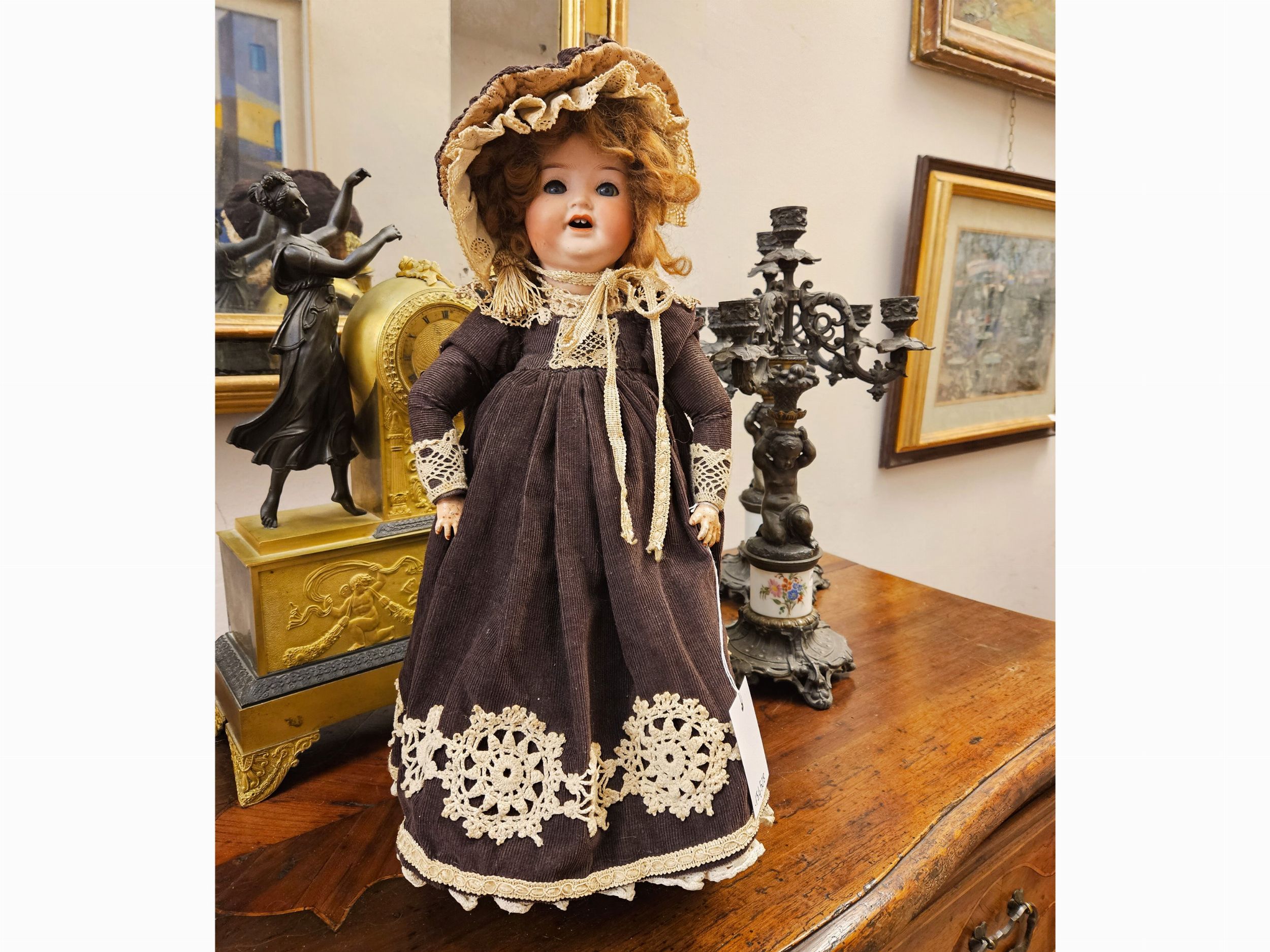 Germania, inizi del XX secolo con testa in biscuit, occhi mobili in vetro con ciglia applicate, bocca aperta con due dentini, parrucca in mohair, corpo articolato in composizione; lievi difetti