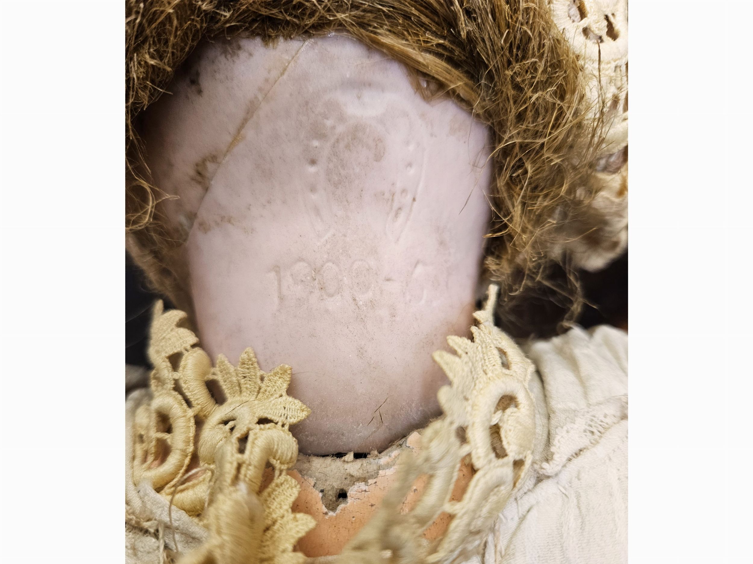 Germania, inizi del XX secolo con testa in biscuit, occhi fissi in vetro, bocca aperta con dentini, parrucca in mohair, orecchie forate, corpo semi-articolato in composizione, abiti d'epoca. Lievi difetti (felures e sbeccature al corpo)