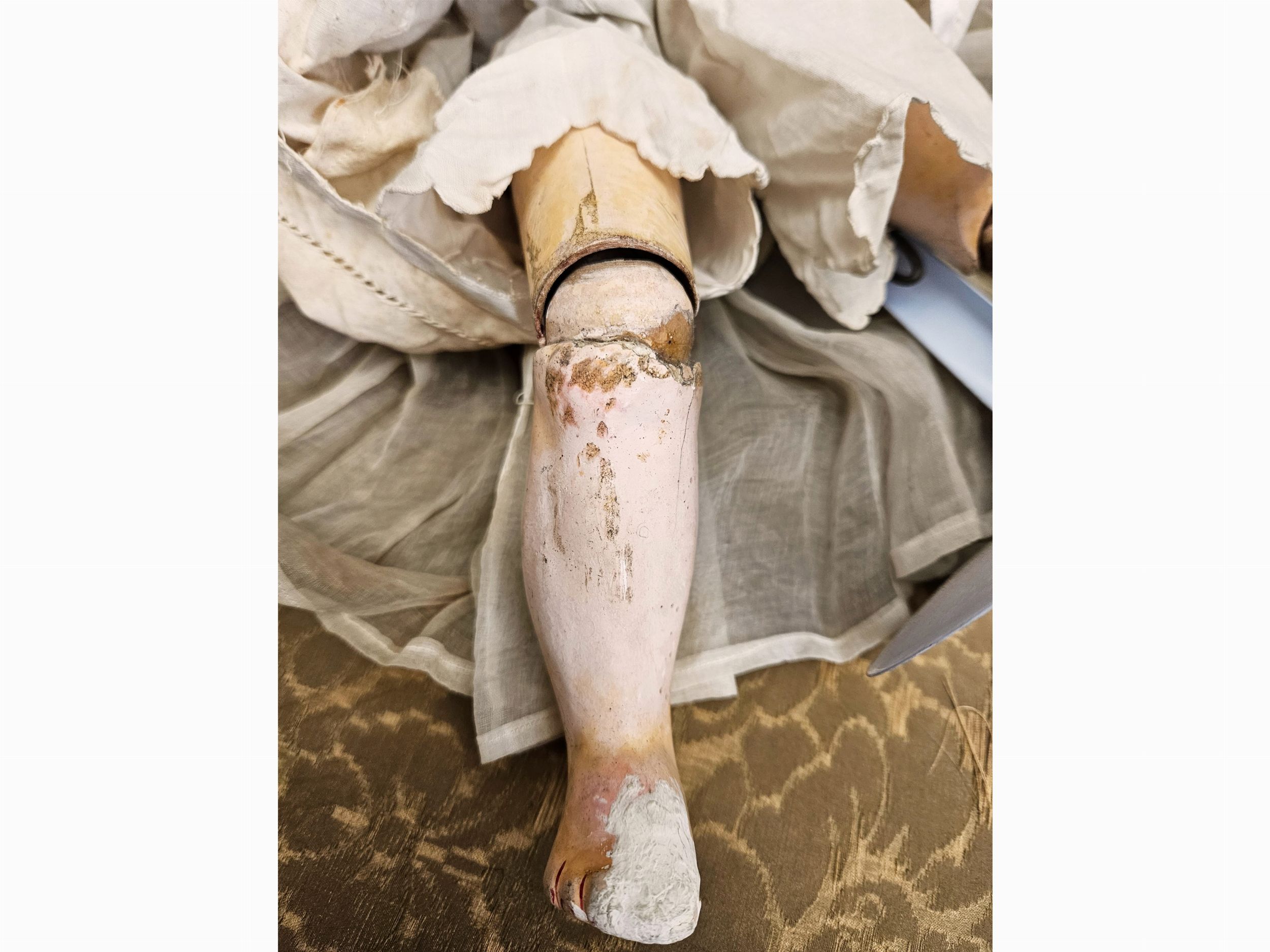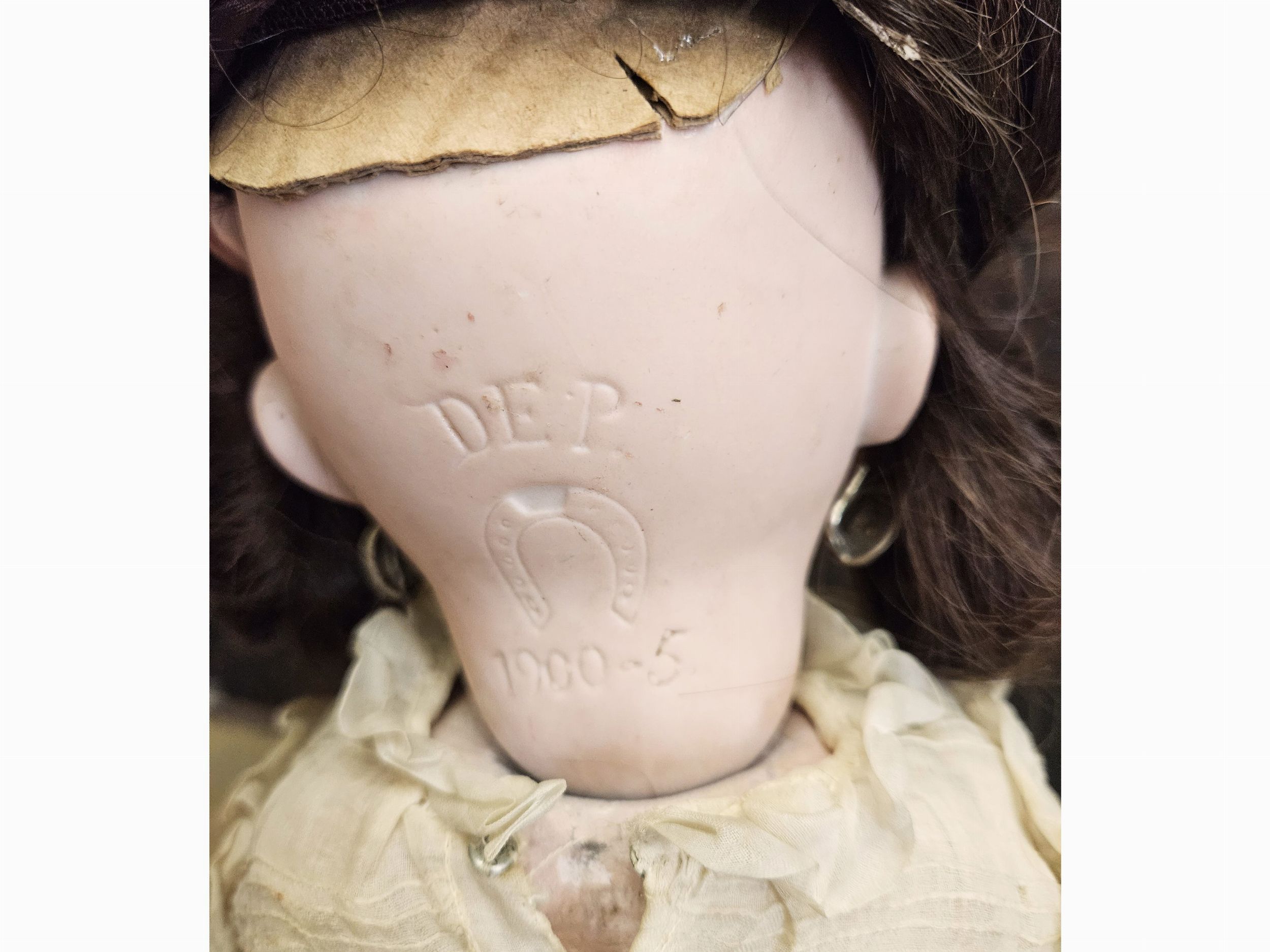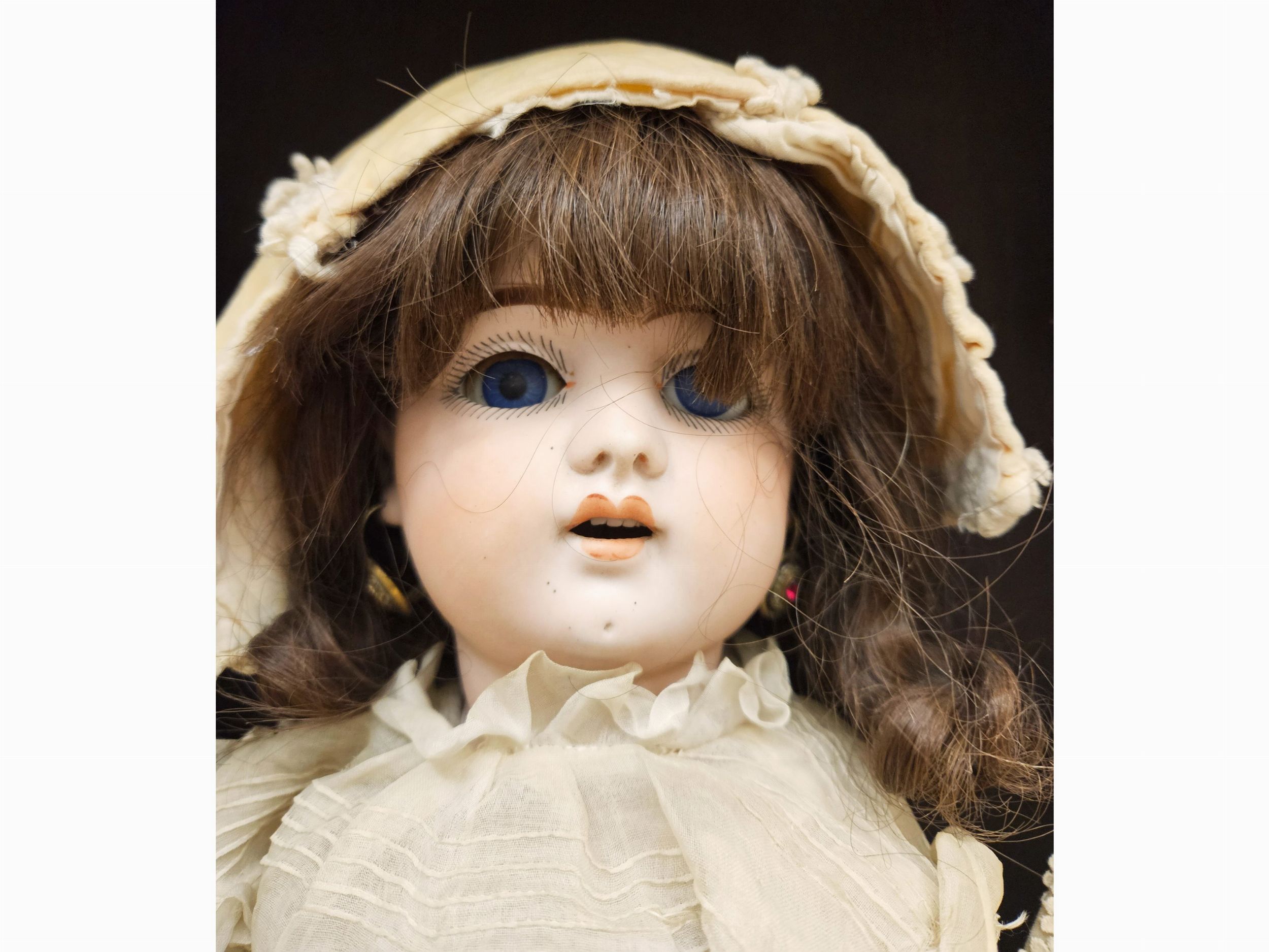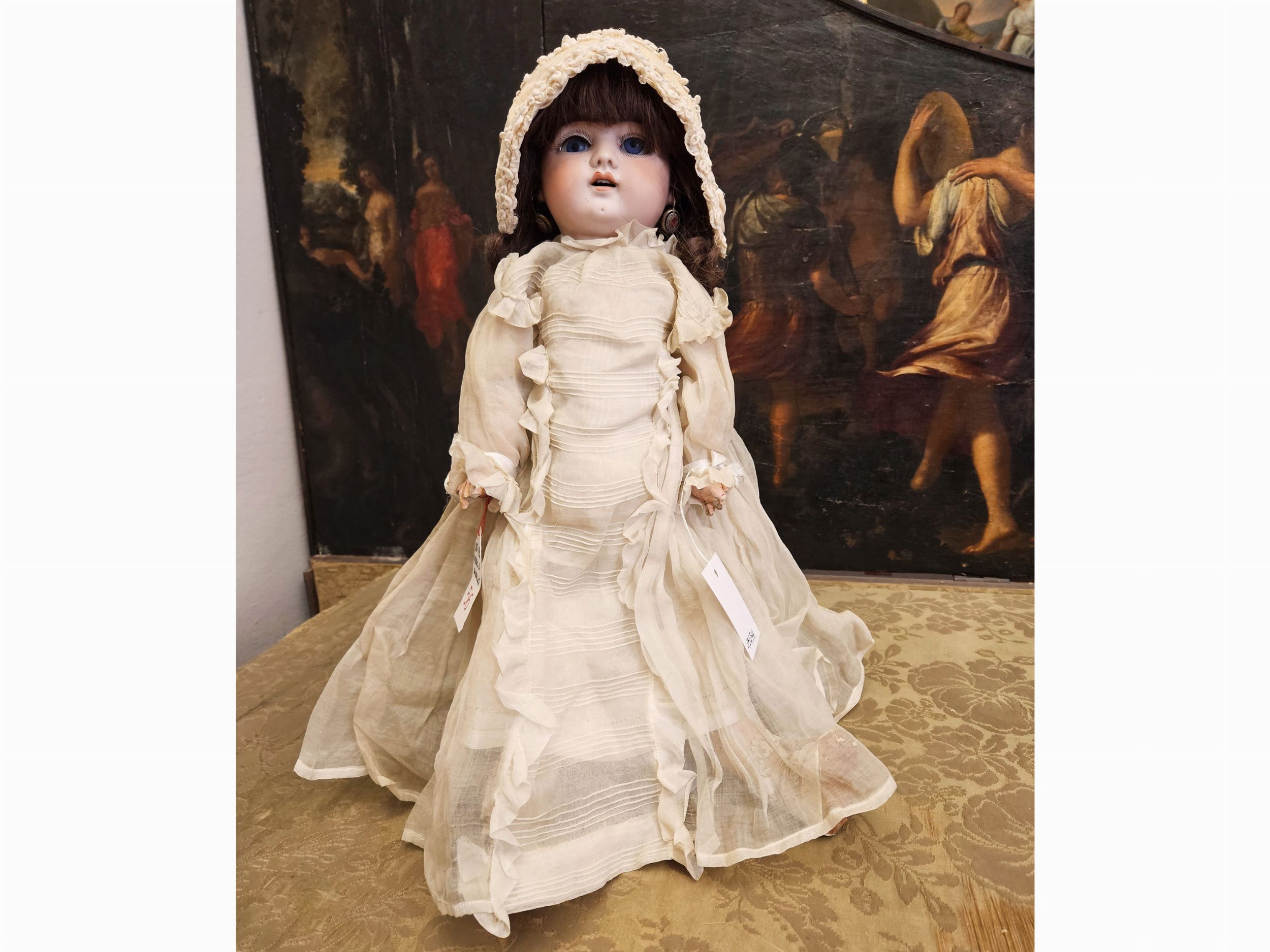 h cm 54 Germania, inizi del XX secolo con testa in biscuit, occhi mobili in vetro, bocca aperta con dentini, orecchie forate, parrucca di capelli, corpo articolato in composizione, abiti d'epoca. Difetti, in particolare agli arti (alcune dita mancanti)