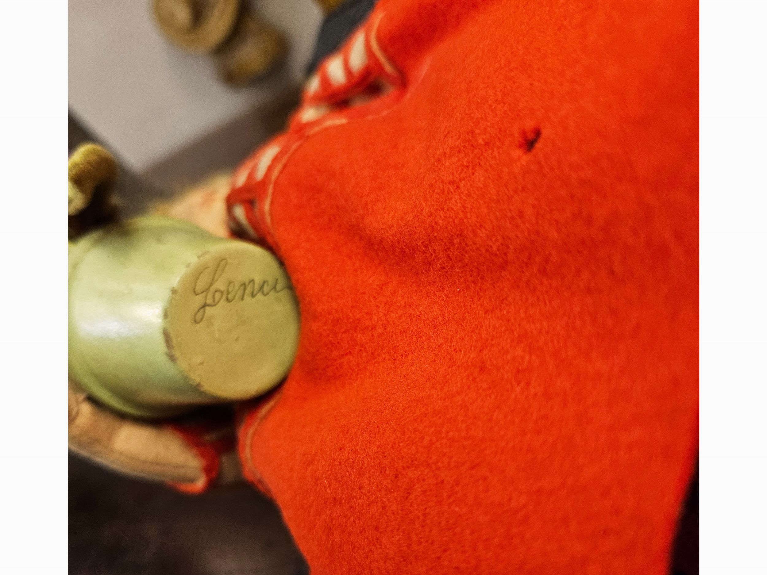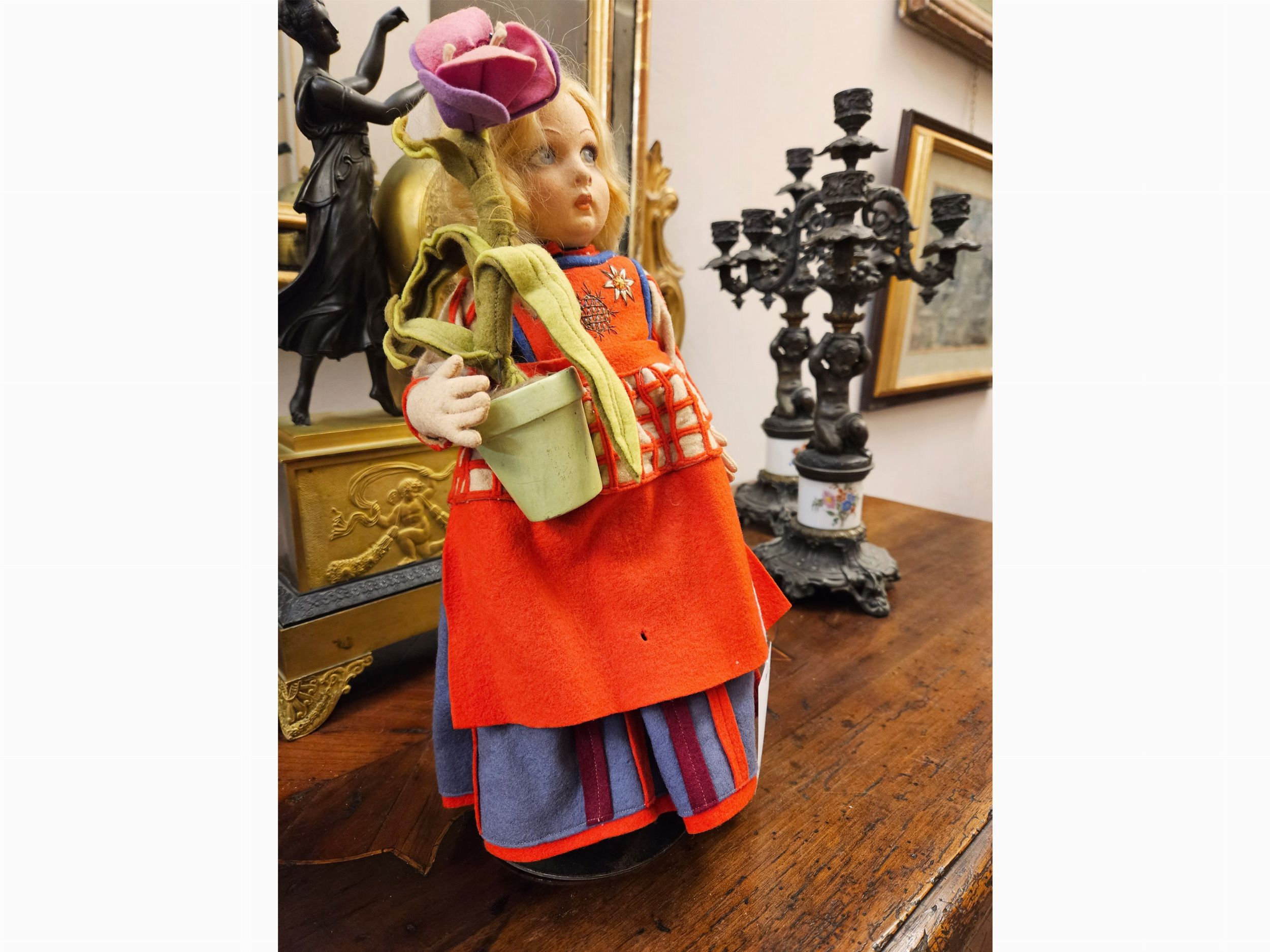 Italia, Anni Trenta con vaso di fiori in mano, testa in feltro pressato con lineamenti dipinti, parrucca in mohair, abiti originali in panno con lievi difetti (forellino sulla gonna)