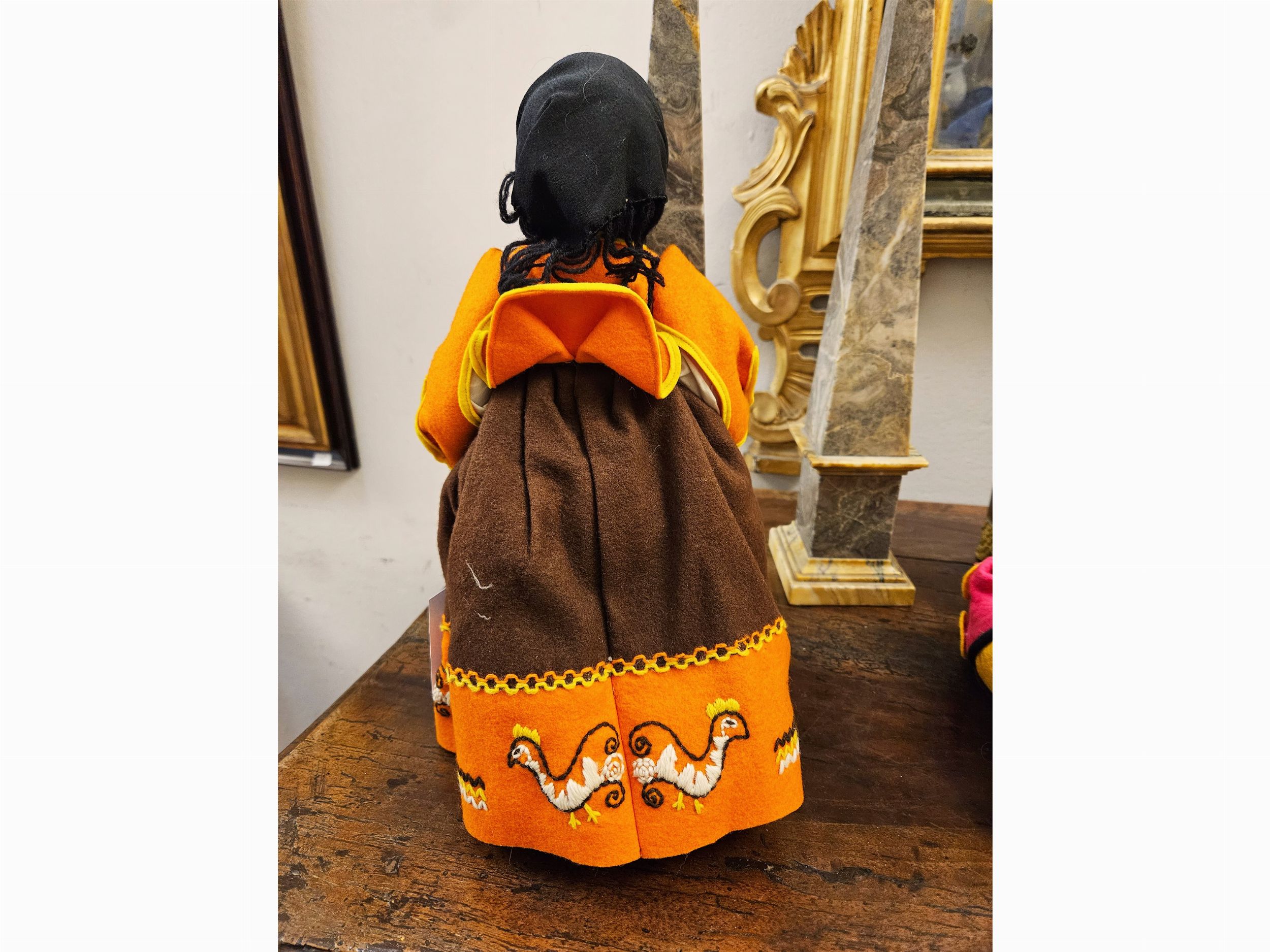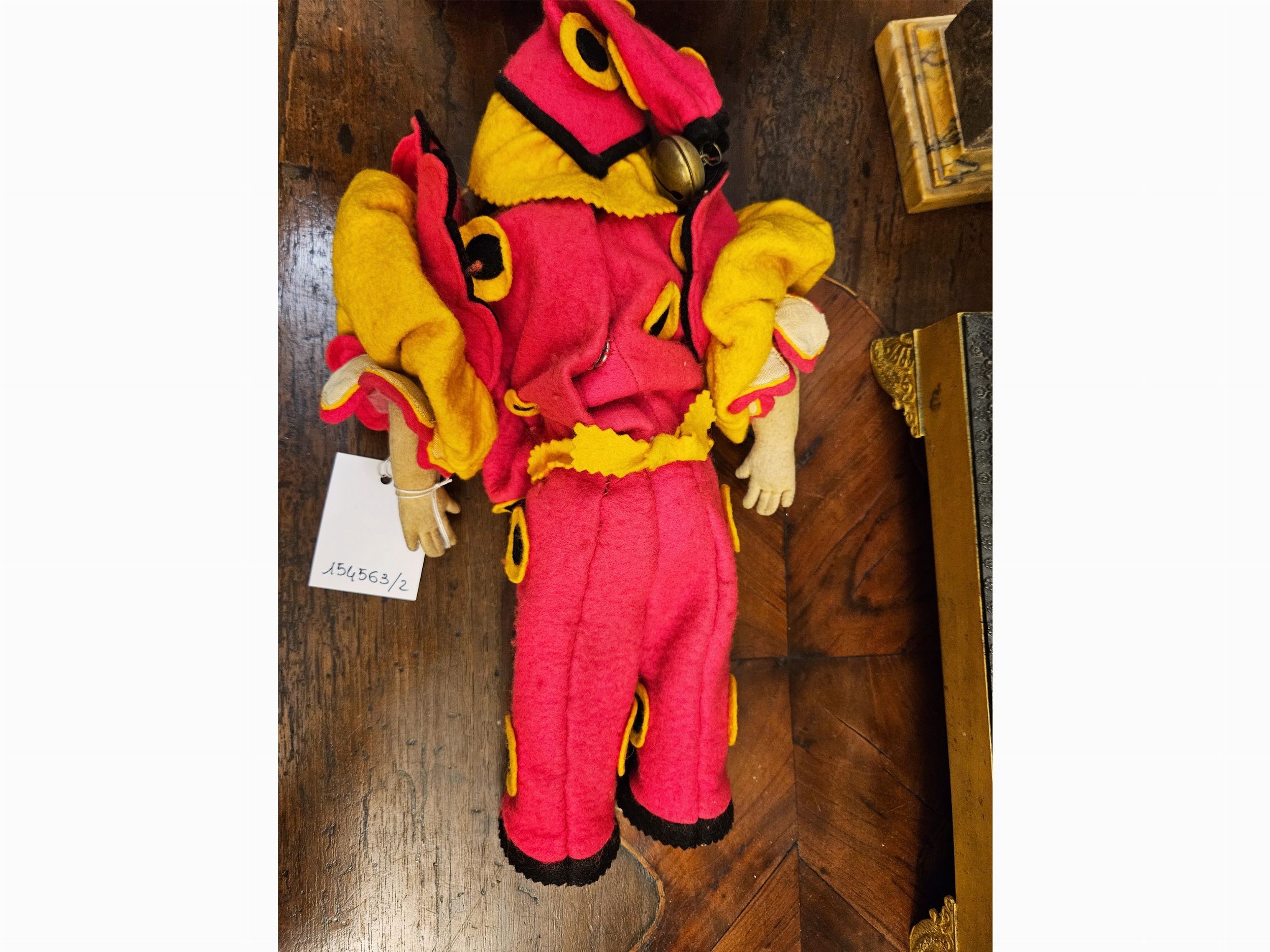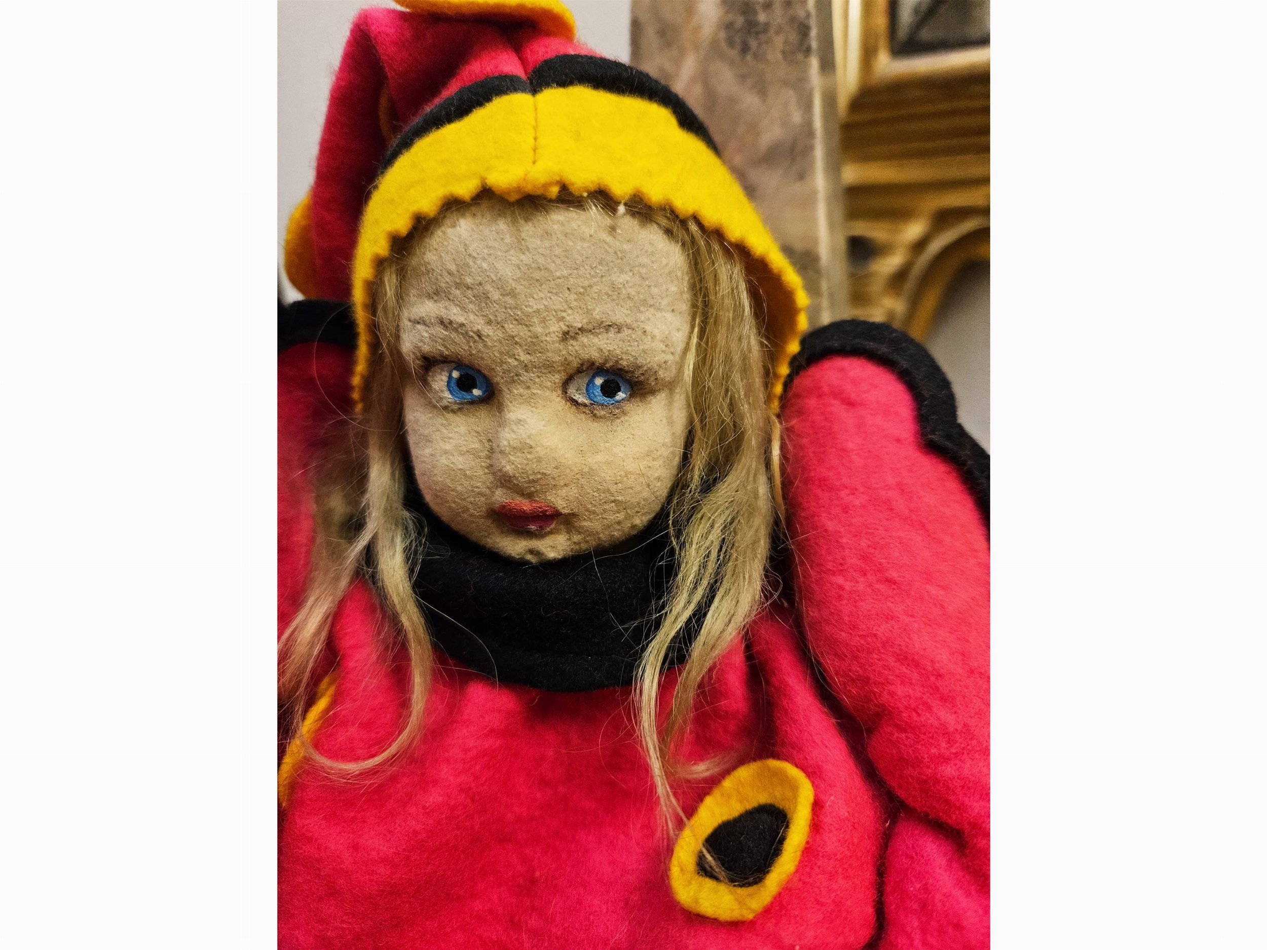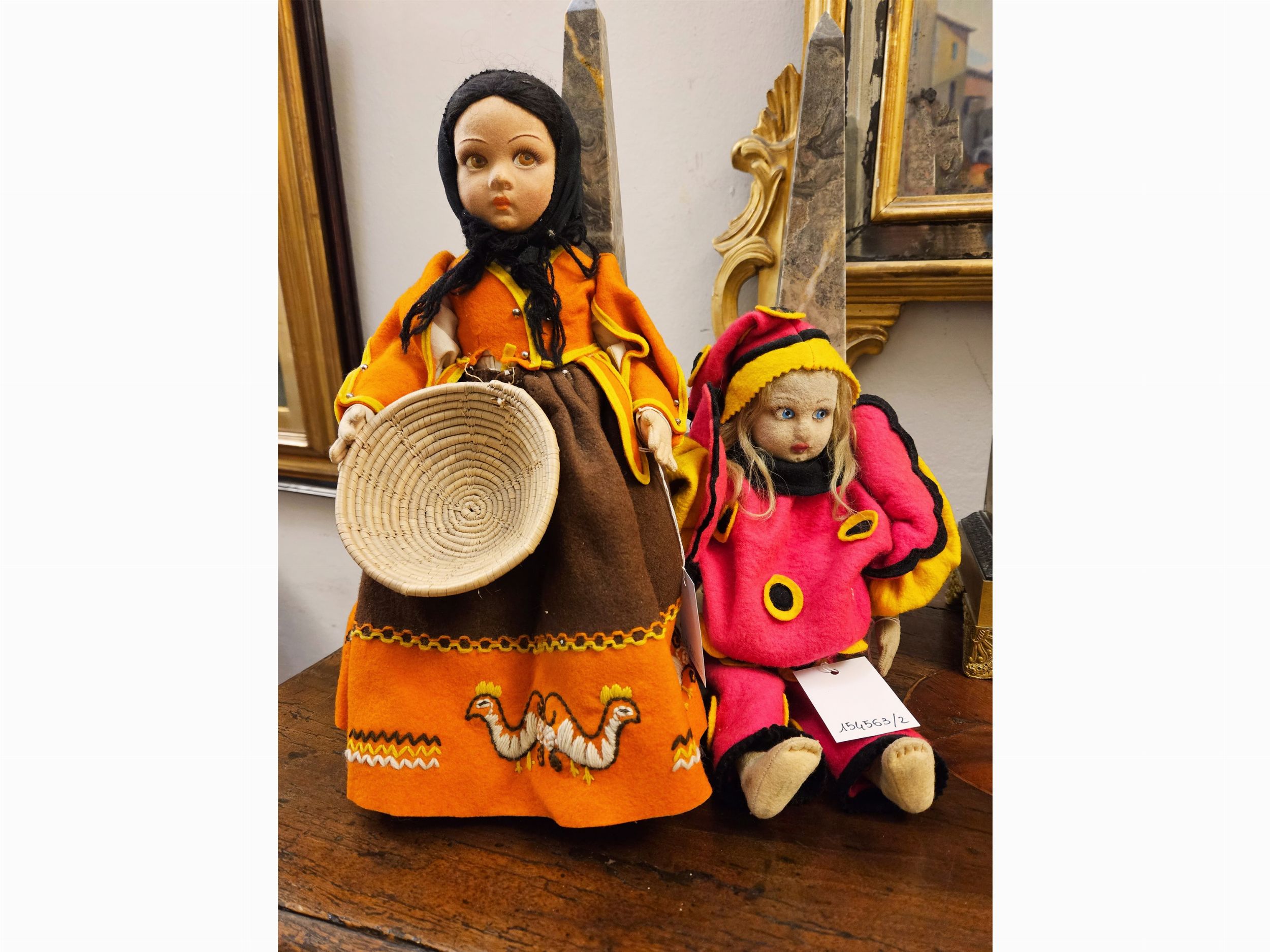 Italia, Anni Quaranta testa in feltro pressato con lineamenti dipinti, parrucca in mohair, abiti originali in feltro, con in mano una cesta vuota (senza le arance), lievi difetti all'abito, abbinata ad altra bambola in panno, vestita da clown, più recente