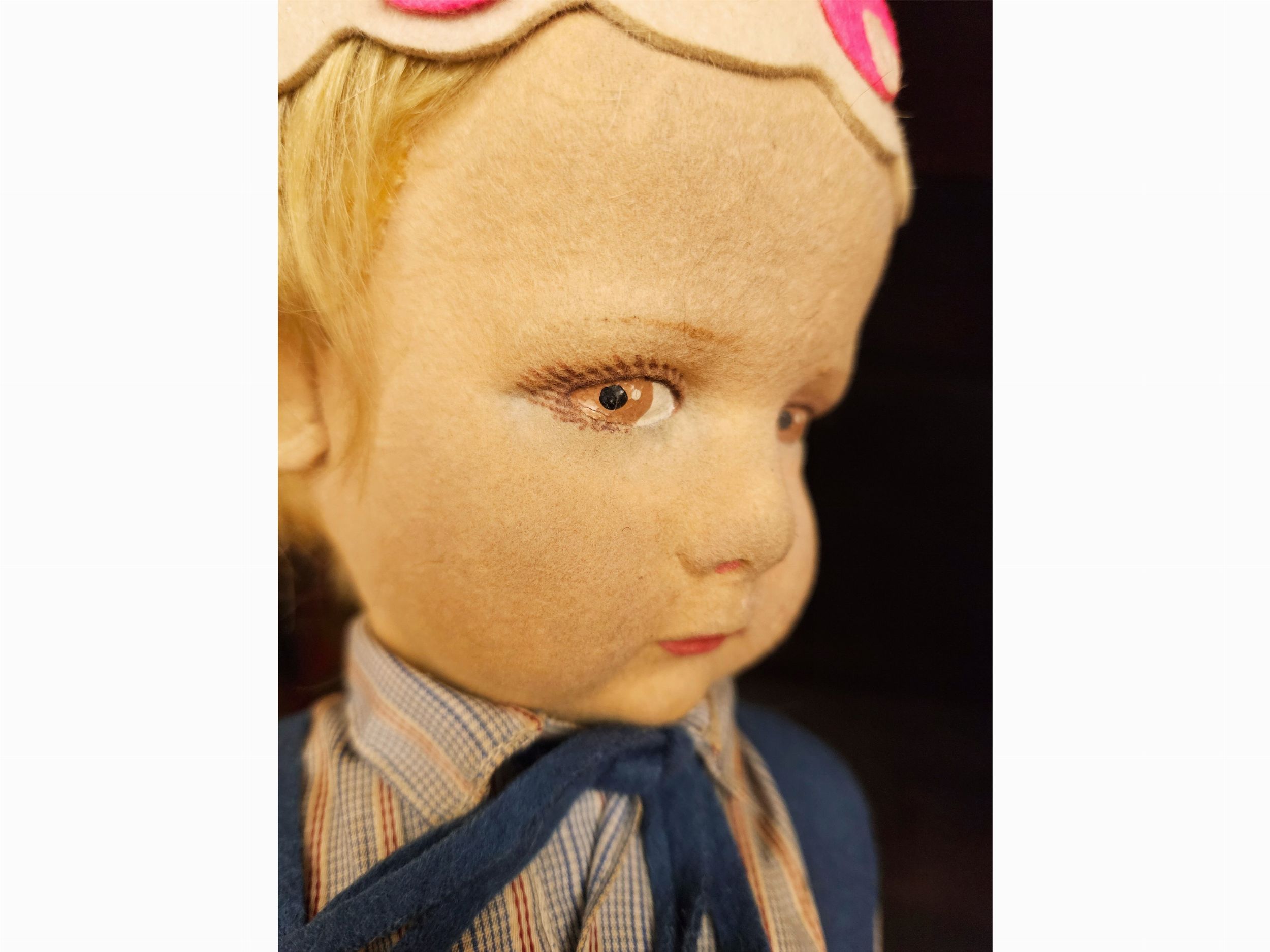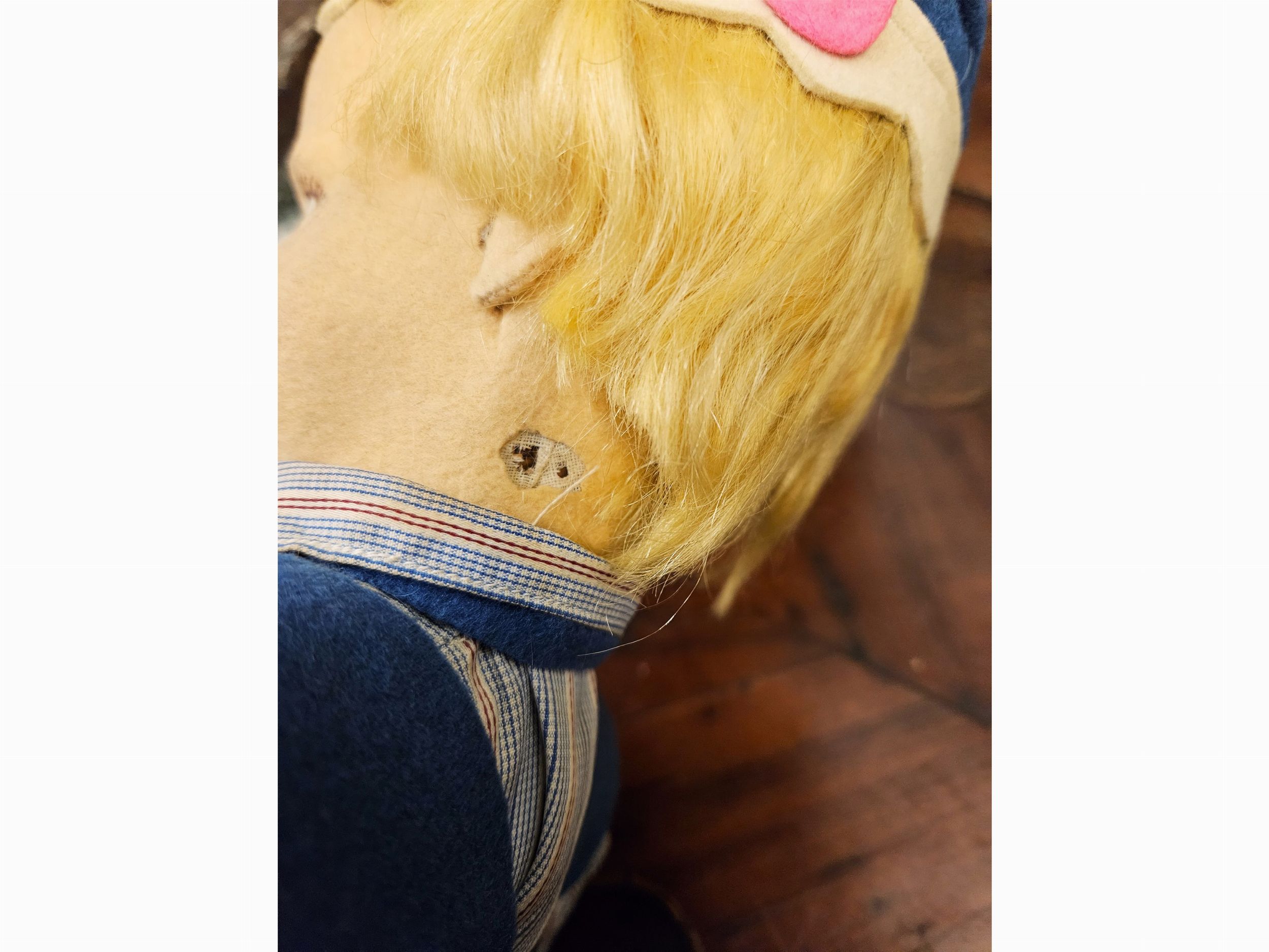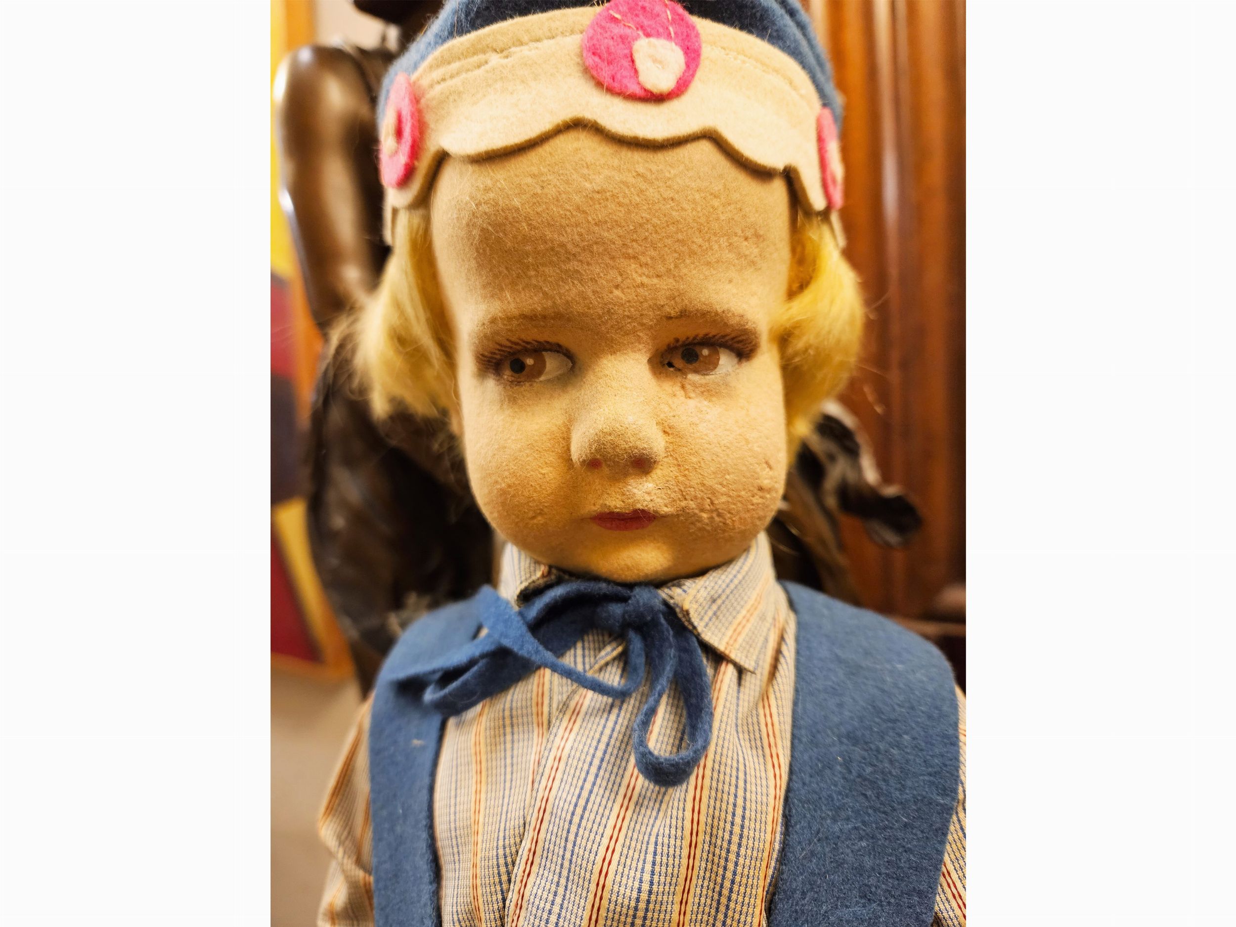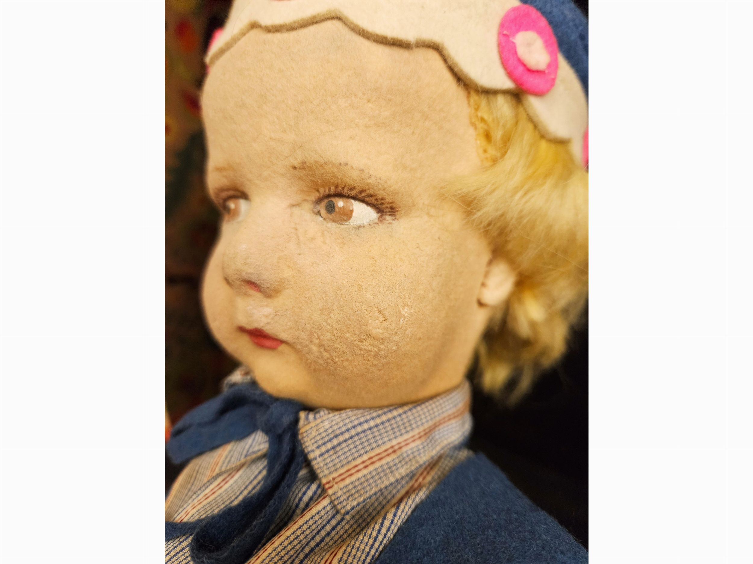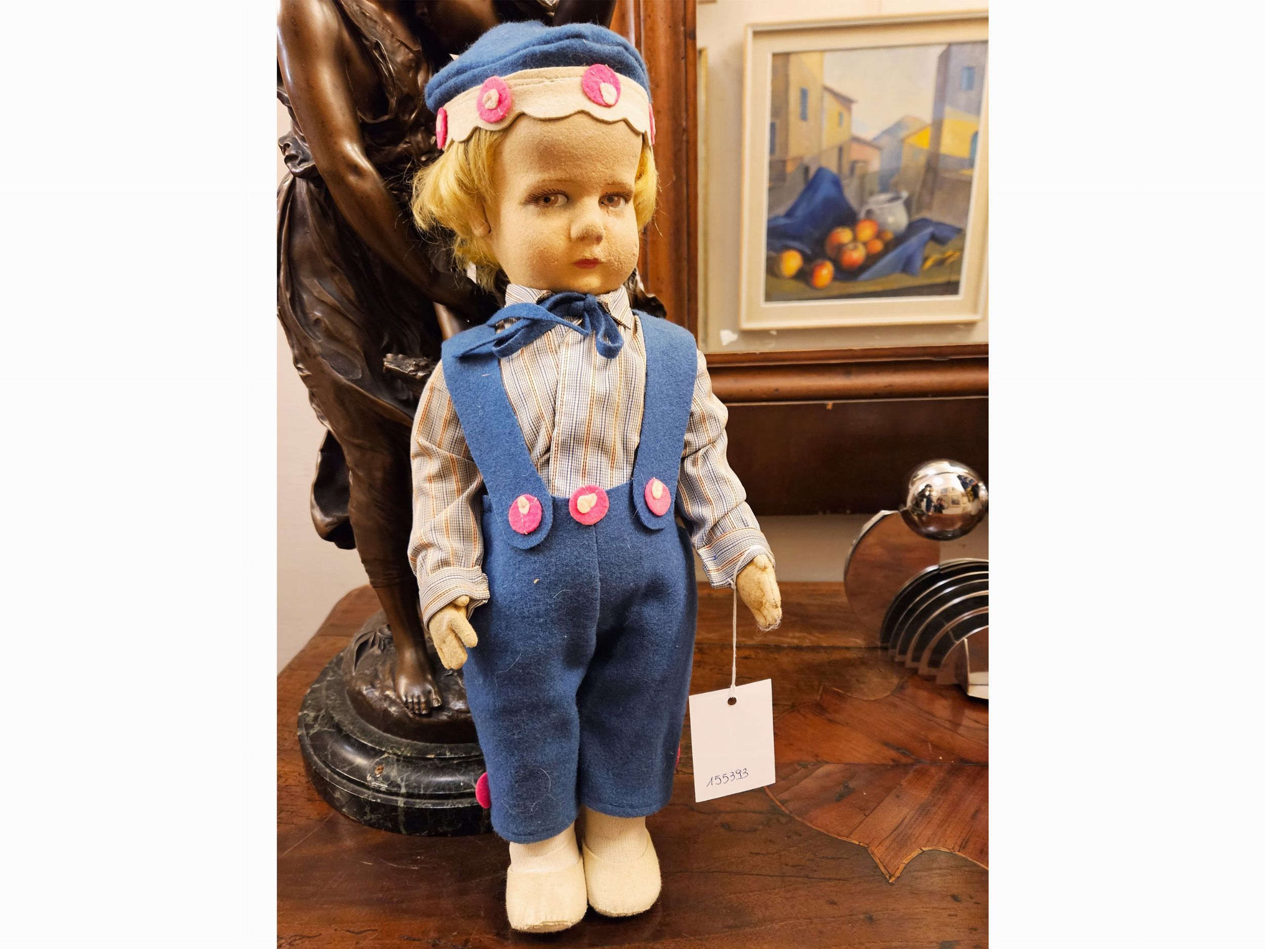 Italia, Anni Trenta testa in feltro pressato con lineamenti dipinti, parrucca in mohair, abiti originali, lievi difetti (piccola mancanza sul collo e minima caduta di colore all'angolo dell'occhio sinistro)