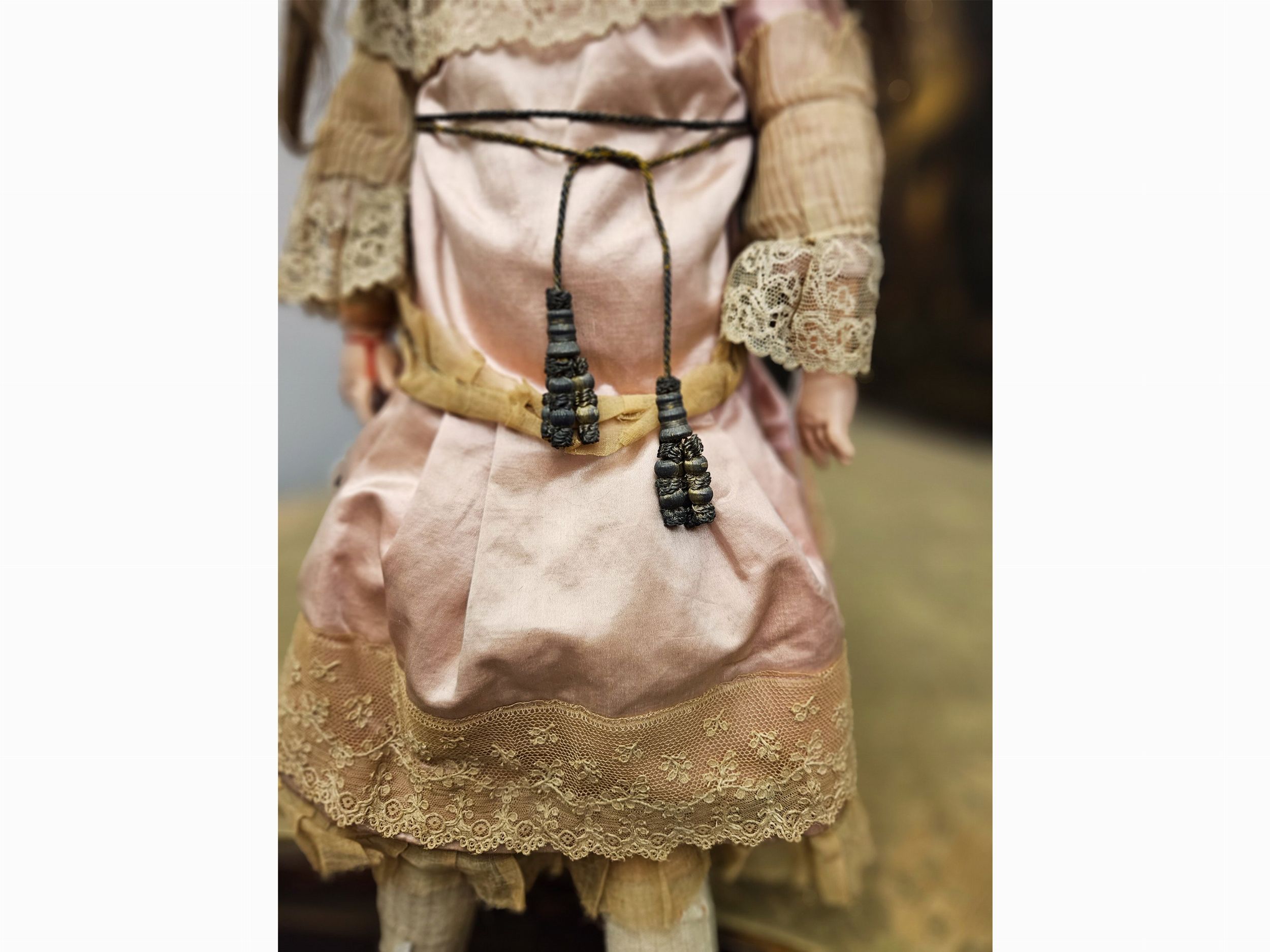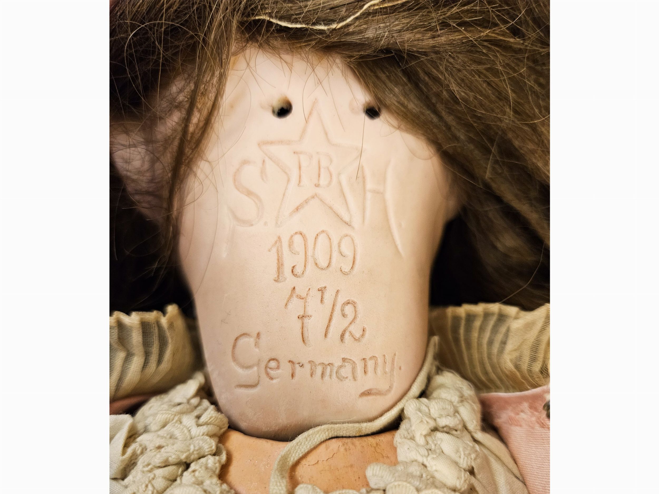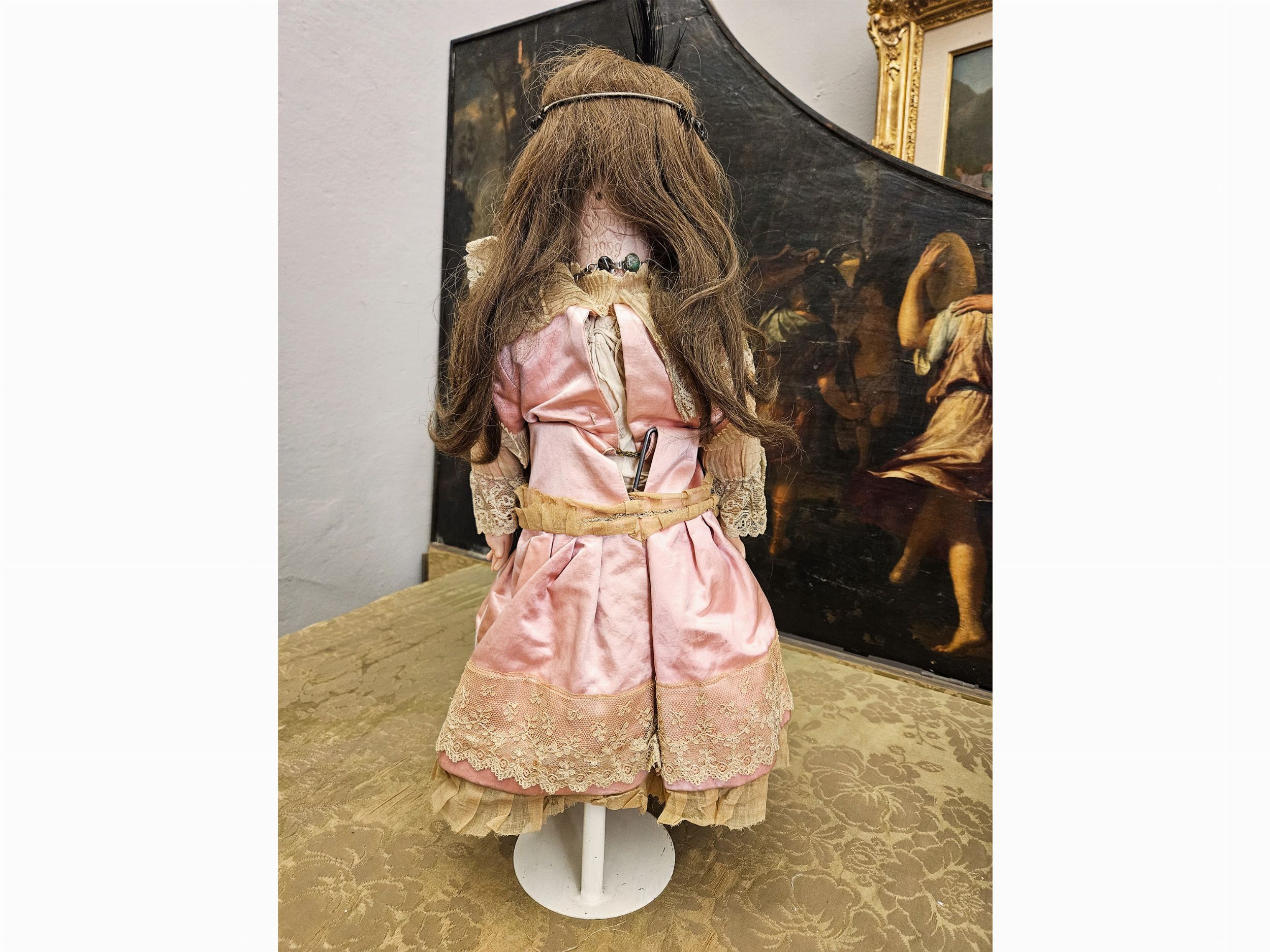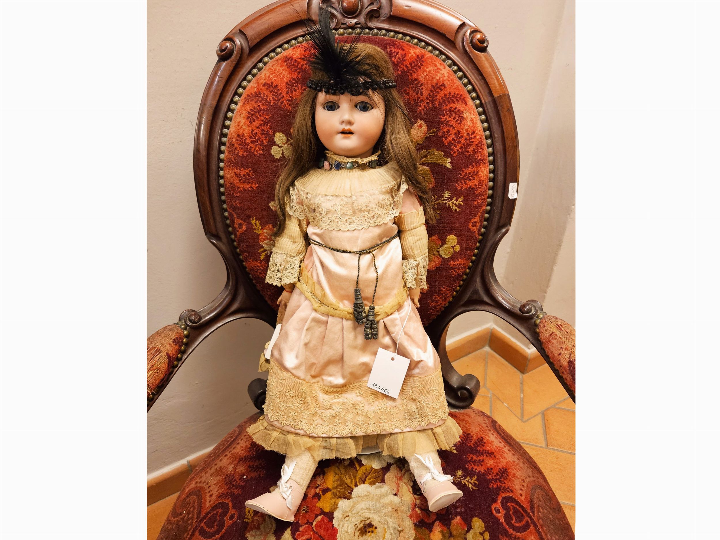 Germania, inizi del XX secolo con testa in biscuit, occhi mobili in vetro con ciglia applicate, bocca aperta con dentini, parrucca di capelli castani, corpo articolato in composizione, abiti coevi