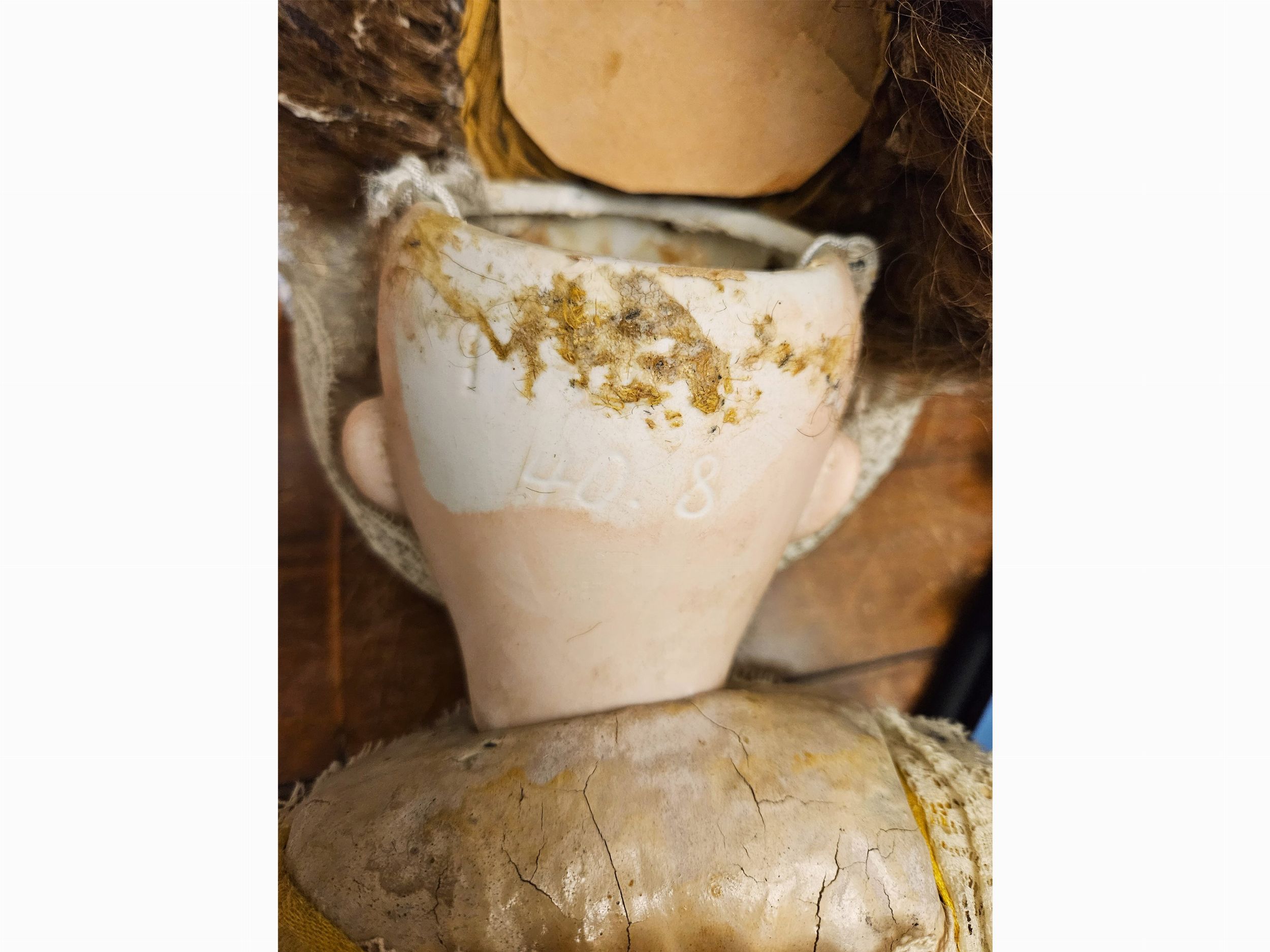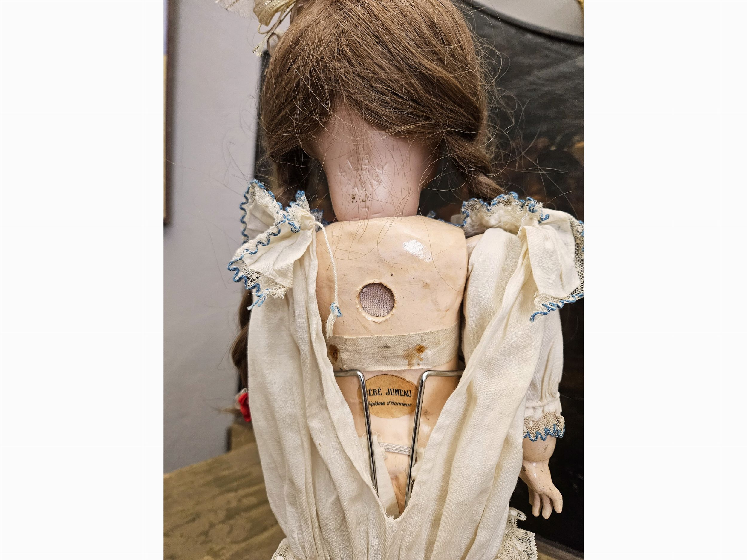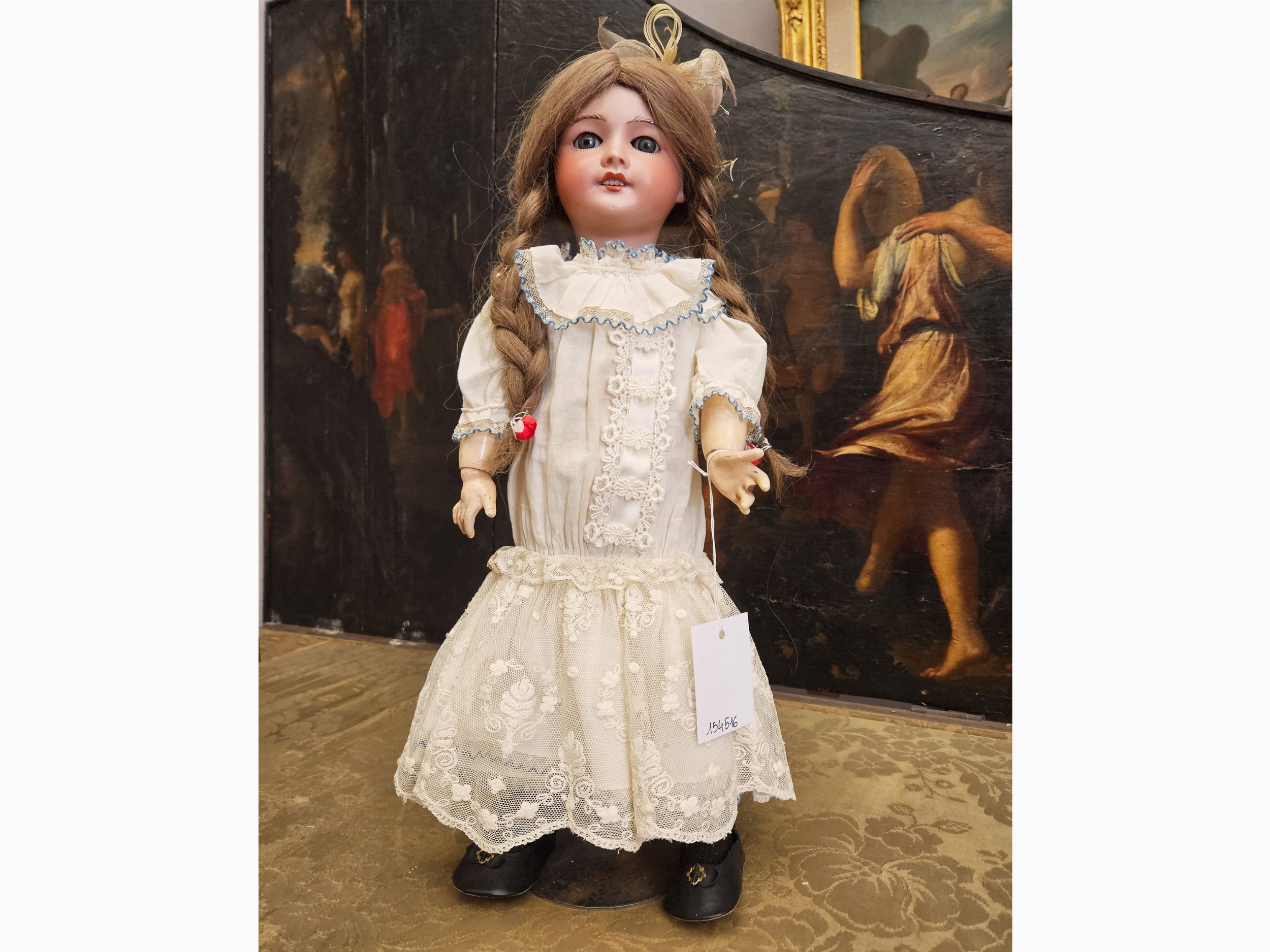 h cm 46 Francia, inizi del XX secolo con testa in biscuit SFBJ, occhi mobili in vetro con ciglia applicate, bocca aperta con dentini, parrucca di capelli, corpo articolato Jumeau in composizione, con meccanismo a cordicelle per la voce, non funzionante; difetti (mancante un dito della mano sinistra)