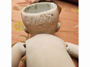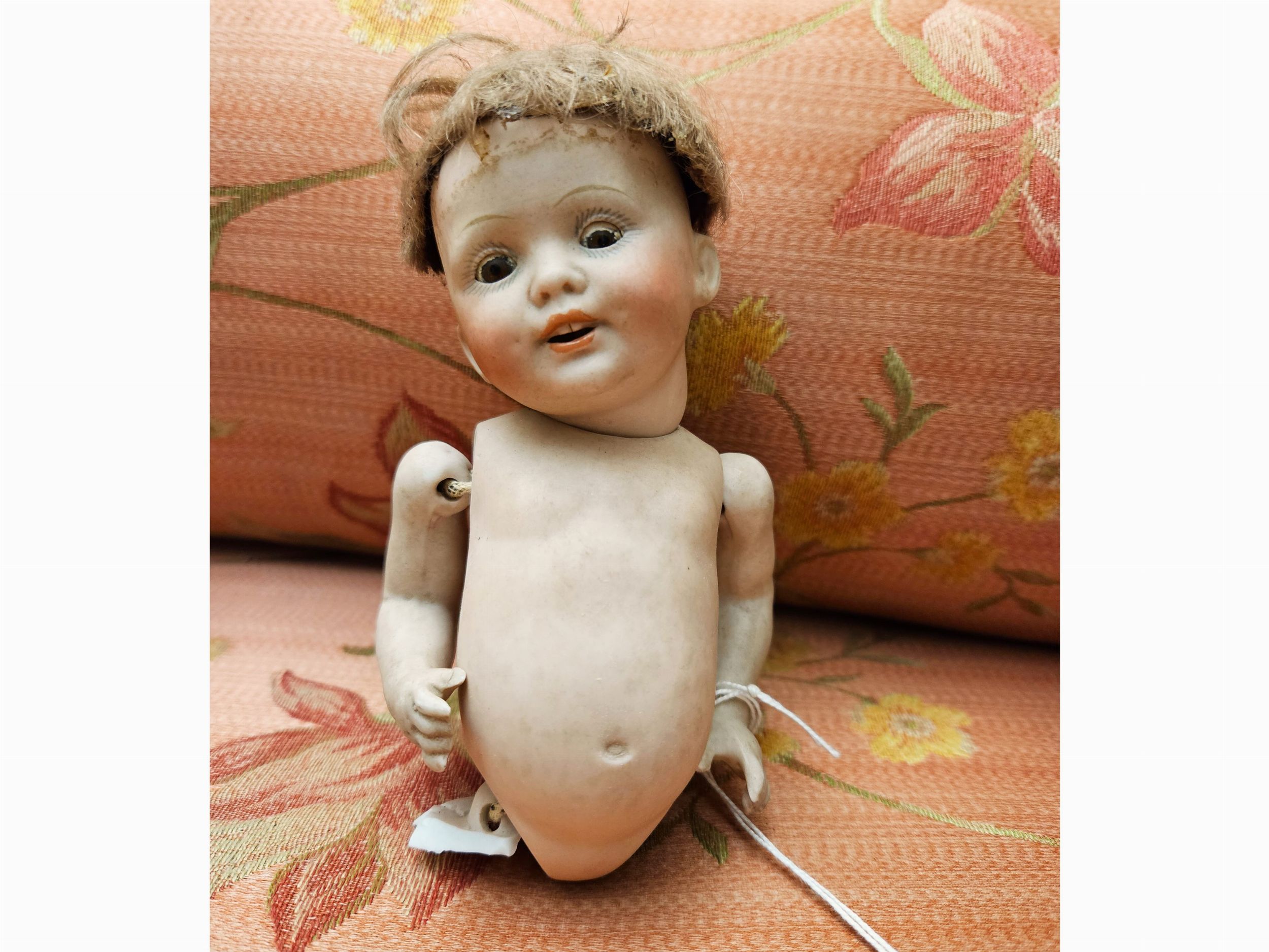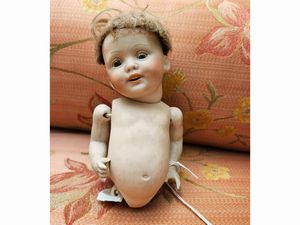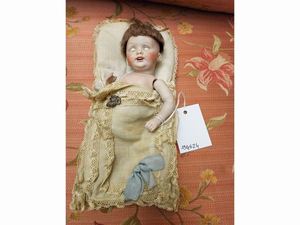 Manifattura europea, inizi del XX secolo con occhi mobili, bocca aperta con due dentini, parrucca di mohair, braccia mobili, mancante delle gambe, entro porte-enfant d'epoca