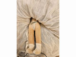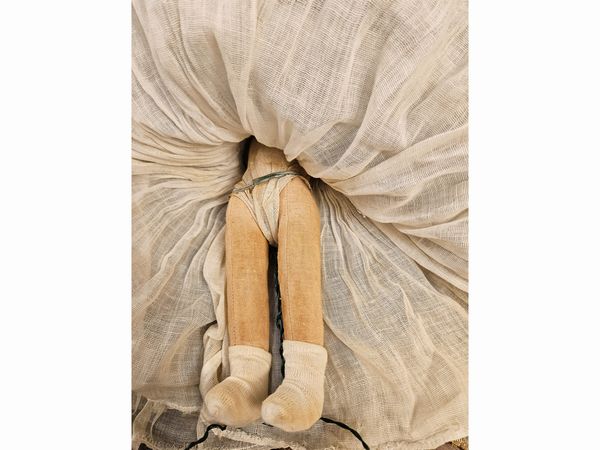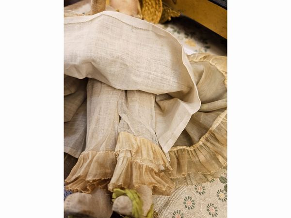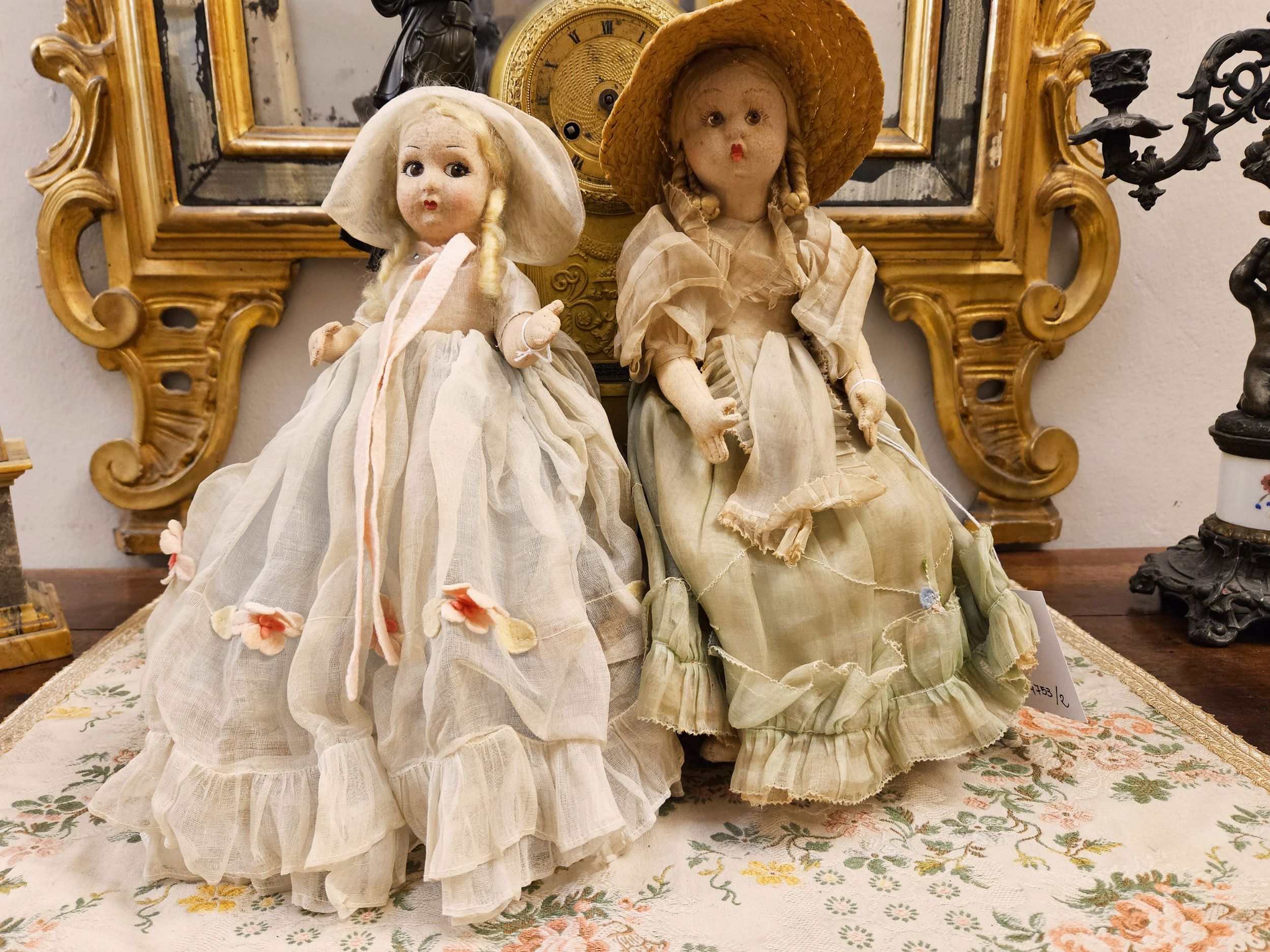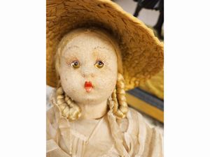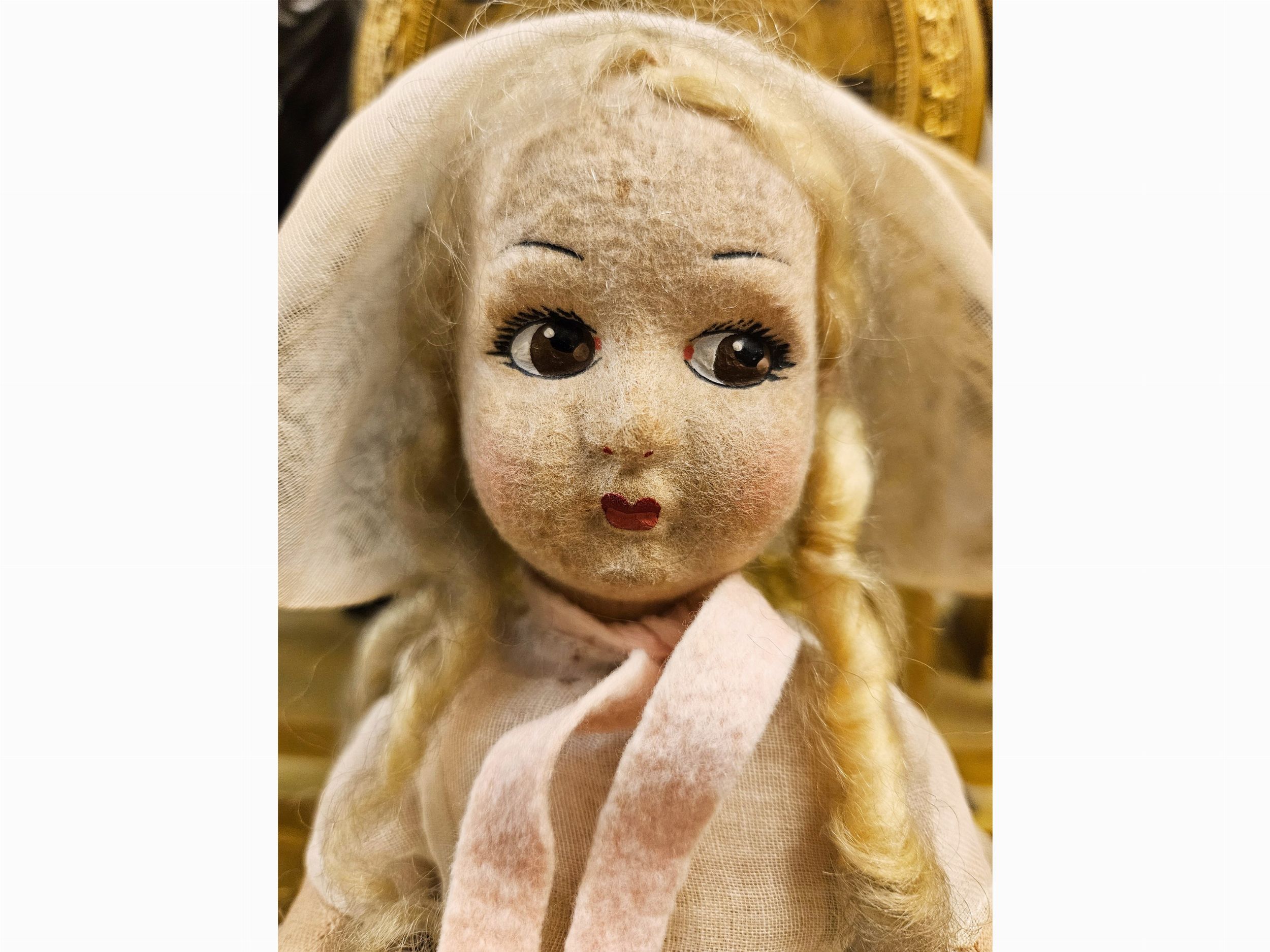 Manifattura europea, metà del XX secolo in stile Lenci, con testa in feltro pressato, lineamenti dipinti, parrucca in mohair, corpo in stoffa imbottito, abiti d'epoca, lievi difetti