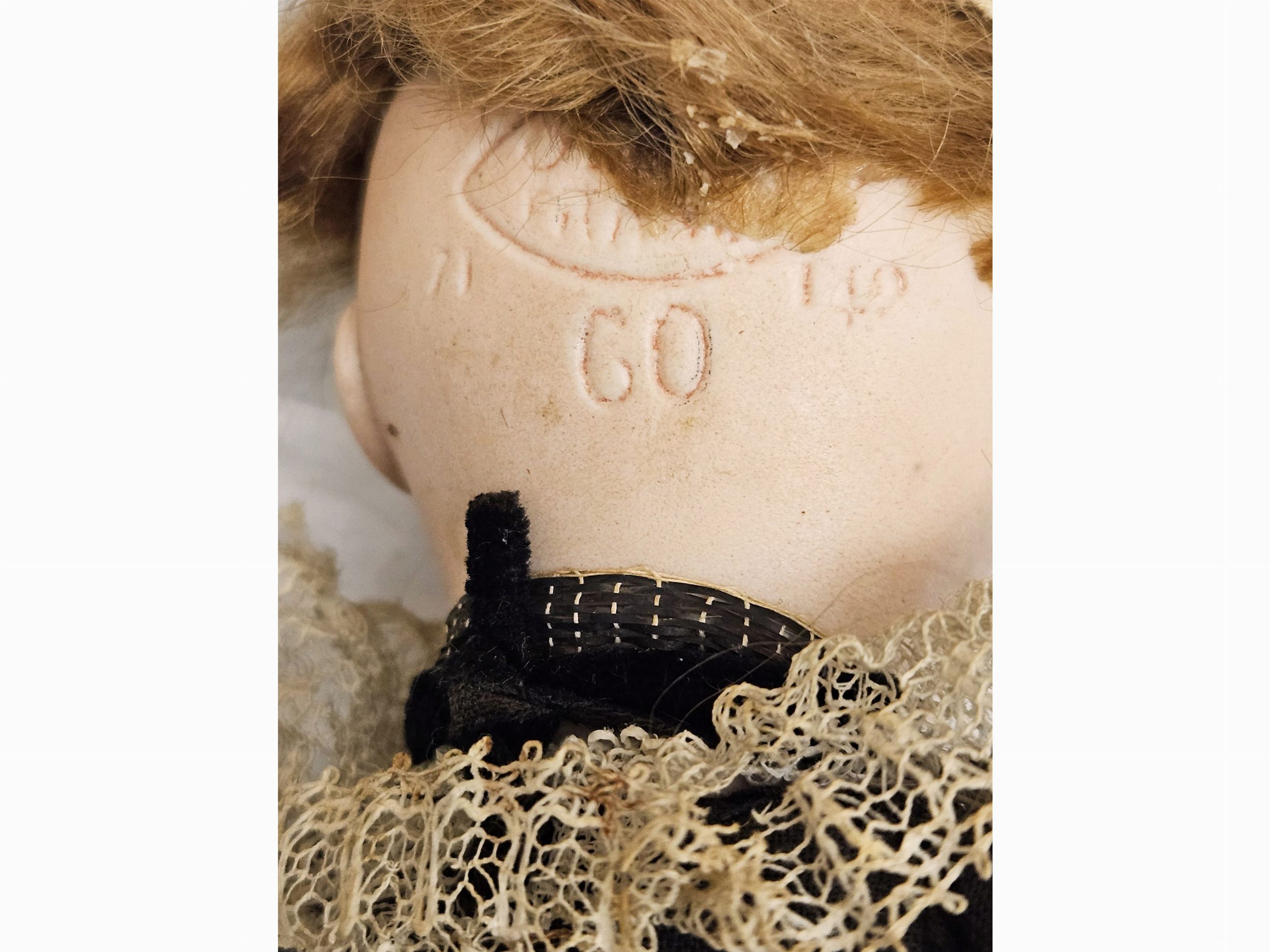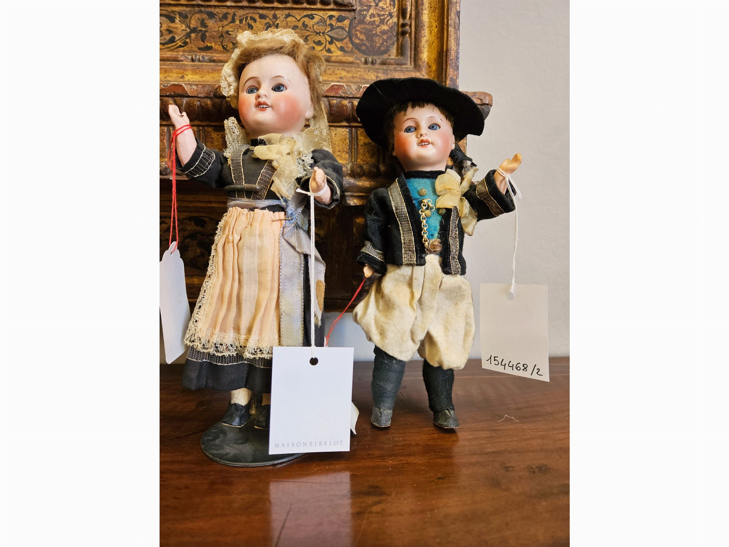 Francia, Anni Venti con testa in biscuit, occhi fissi in vetro, bocca aperta con dentini, parrucca in mohair, corpo rigido a 5 pezzi in composizione, abiti tradizionali originali, lievi difetti