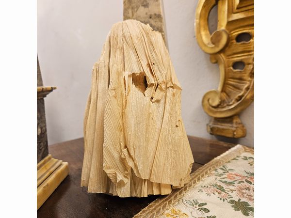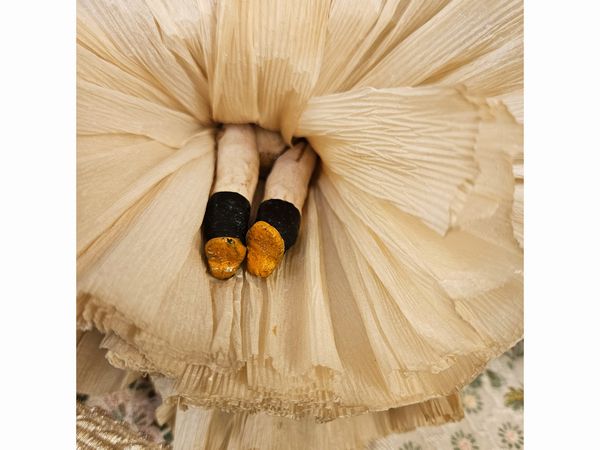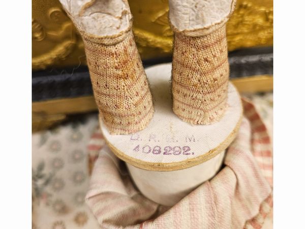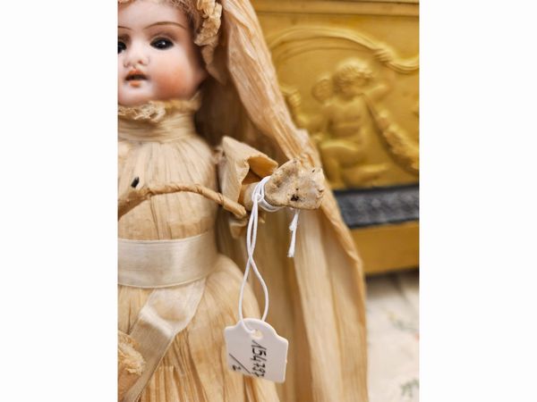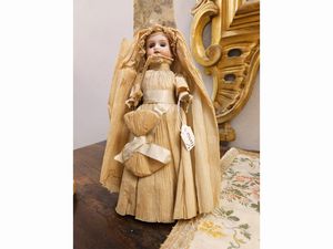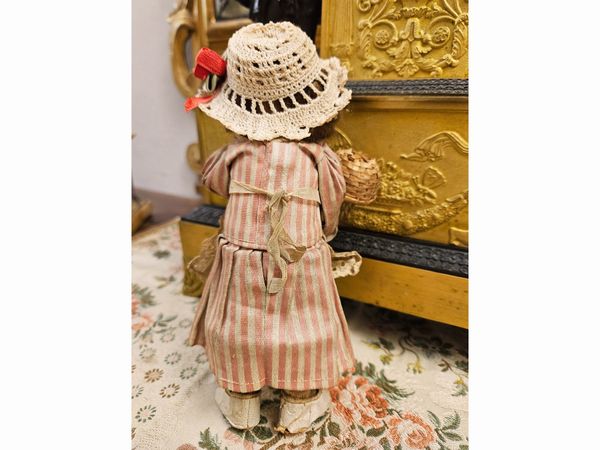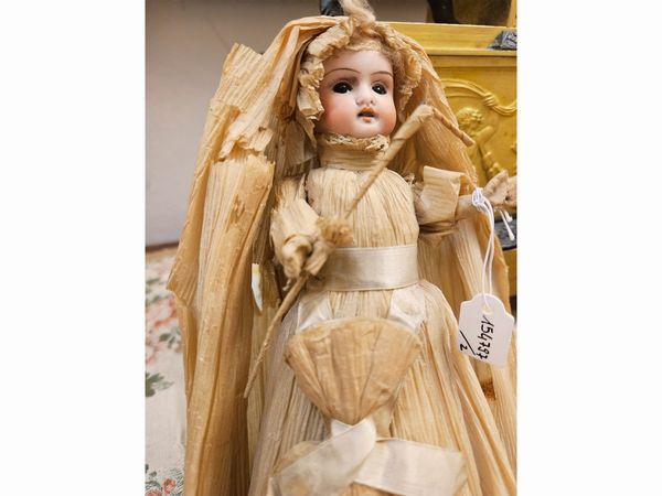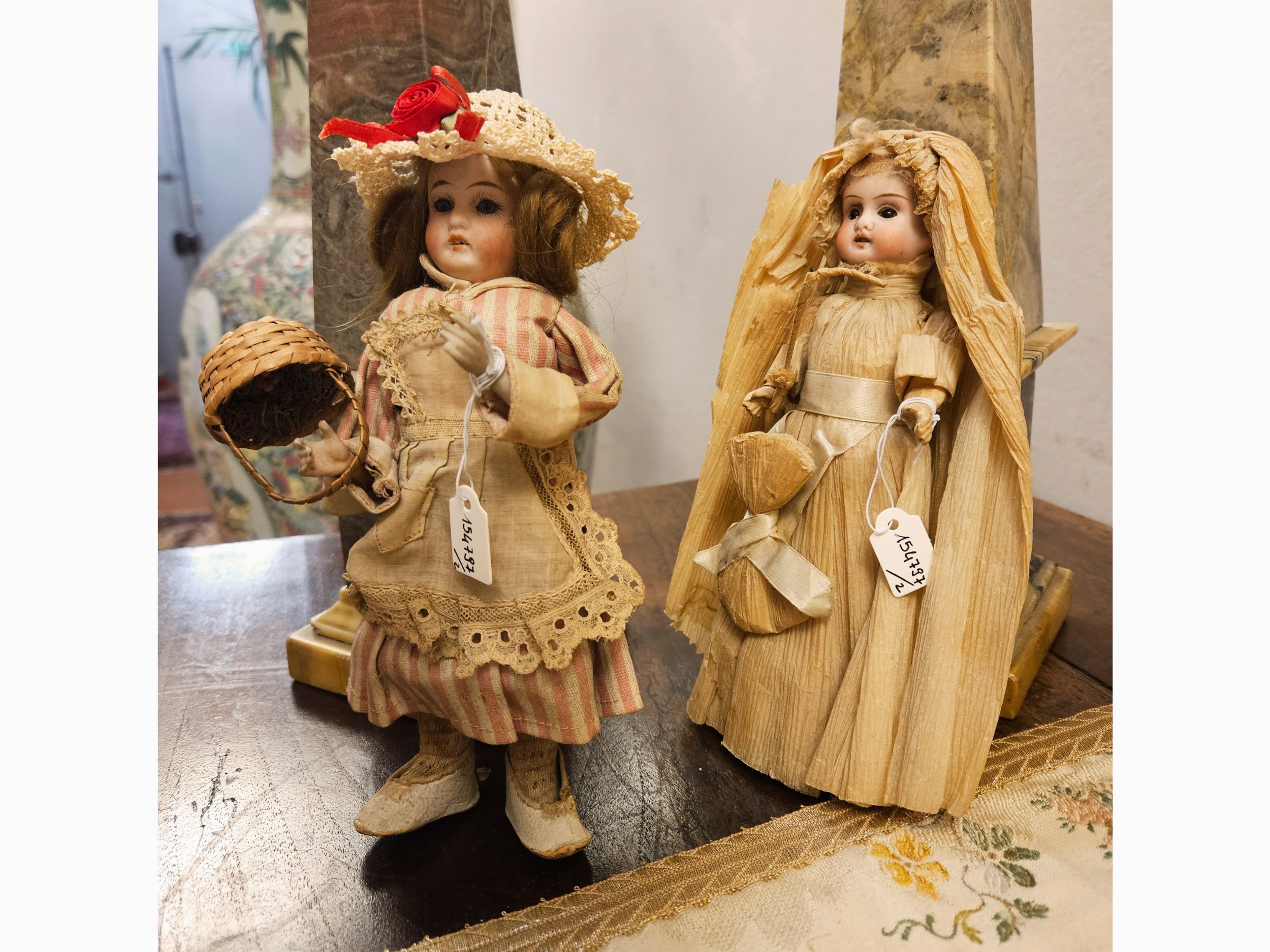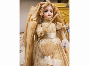 Manifattura europea, prima metà del XX secolo occhi fissi in vetro, bocche aperte con dentini modellati, parrucche in mohair, una, con abito in carta crespa, ha il corpo rigido in composizione, l'altra, con un cestino in mano, ha il tronco in cartone, avambracci in biscuit, veste abiti d'epoca e reca marchio sotto il tronco D.R.G.M. 408292; lievi difetti