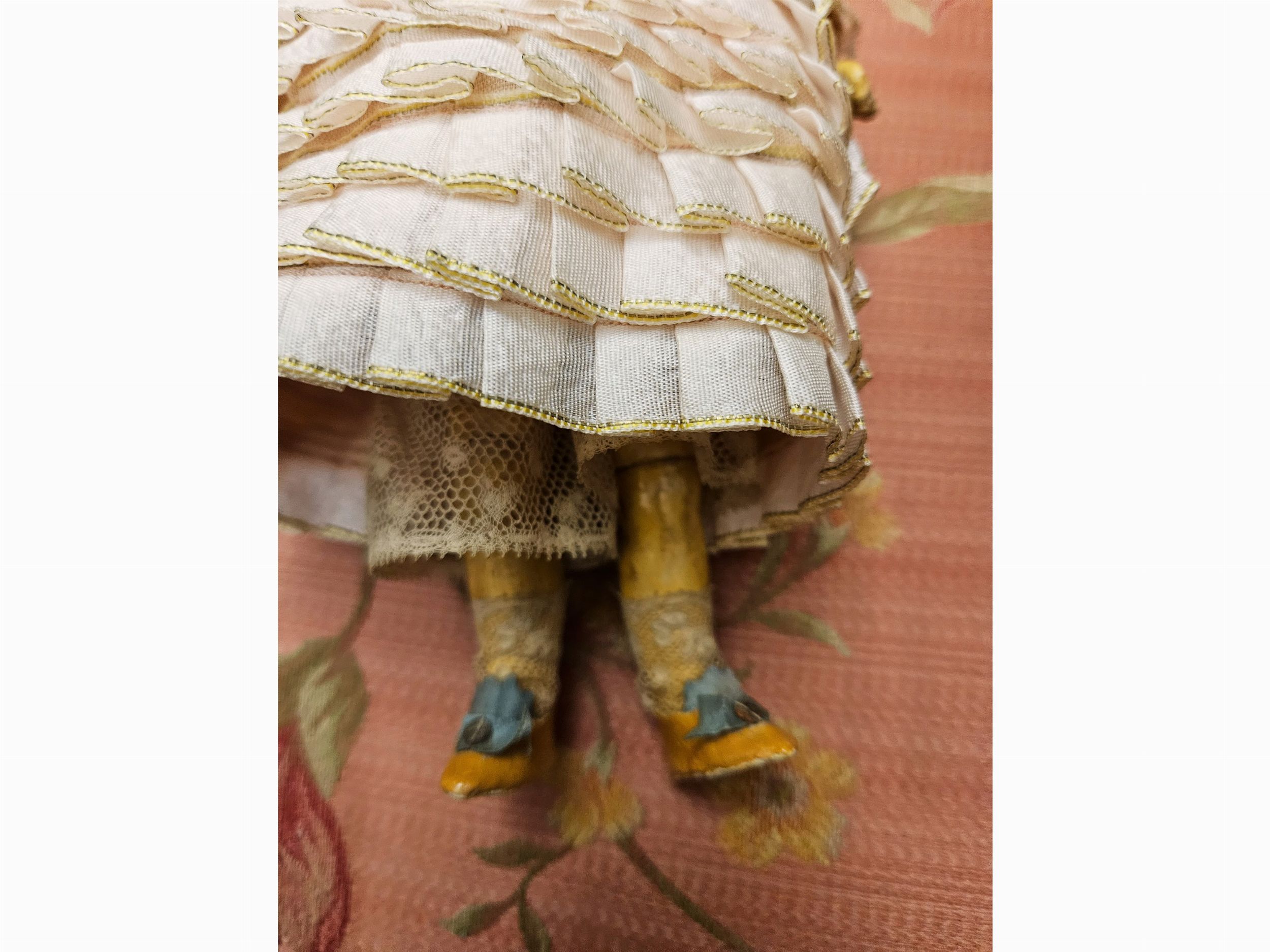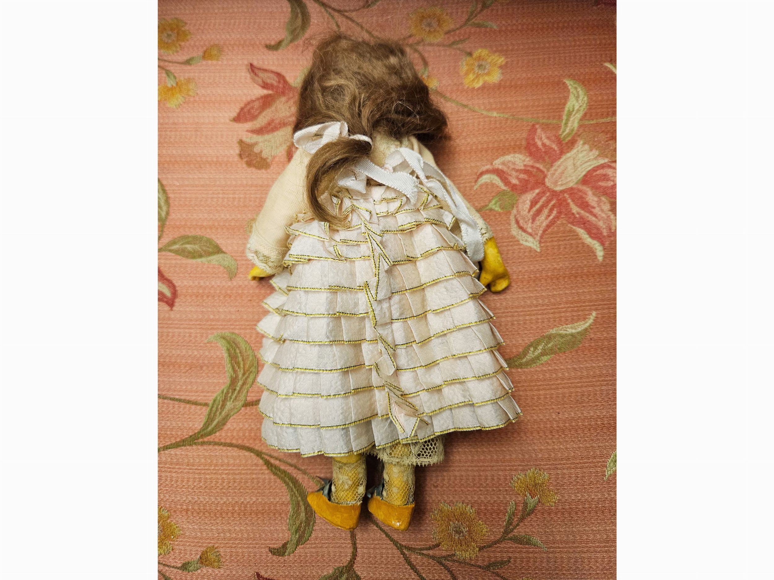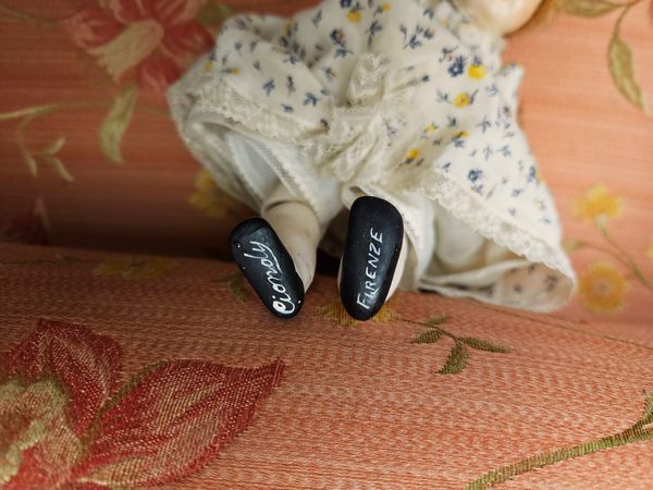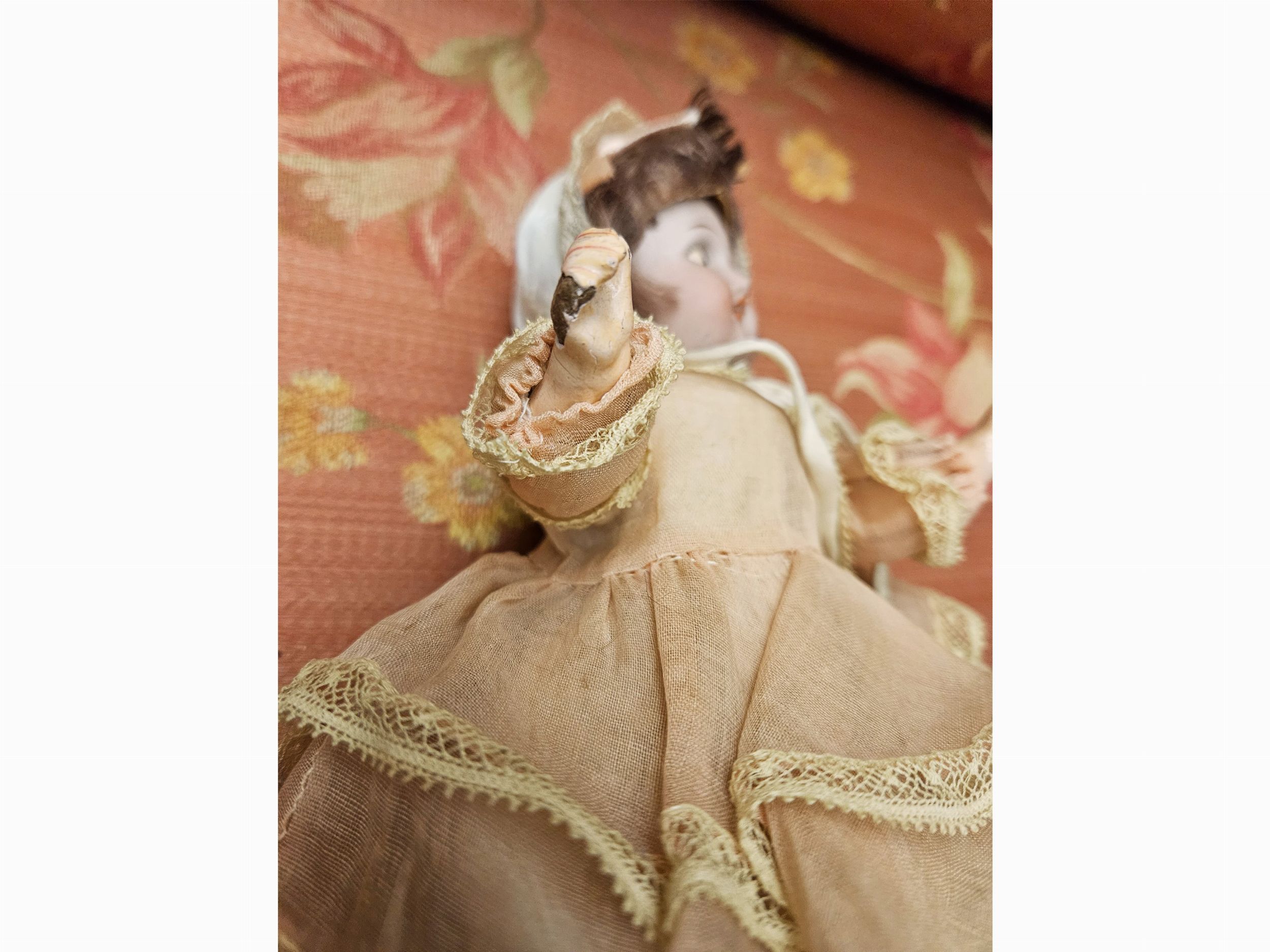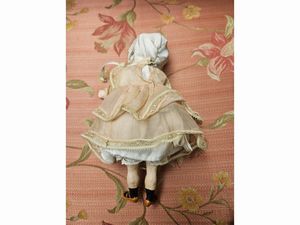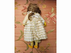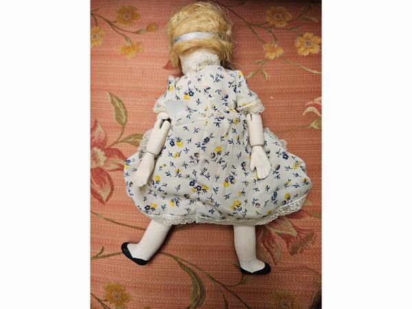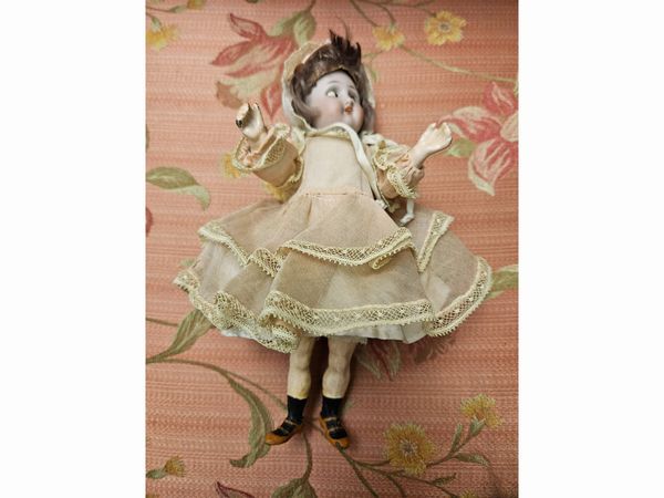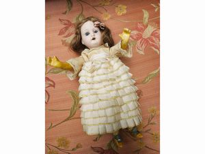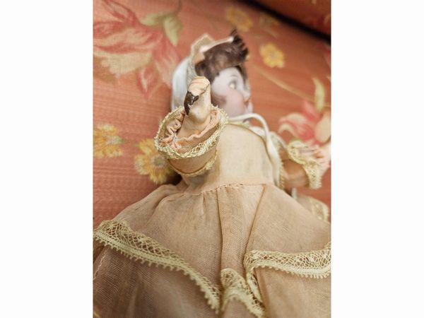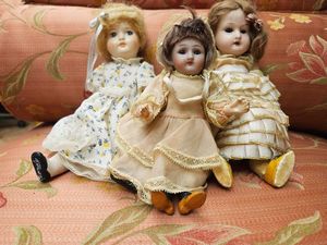 Manifattura europea, prima metà del XX secolo una, con marchio Ciondy Firenze sotto le scarpine, con lineamenti dipinti e corpo rigido a 5 pezzi anch'esso in biscuit, un'altra con occhi mobili in vetro, bocca aperta con dentini, parrucca in mohair, corpo rigido in composizione (con lievi difetti alla mano destra), la terza con occhi fissi in vetro, bocca aperta, parrucca di capelli, corpo semi-articolati in composizione; tutte vestono abiti d'epoca
