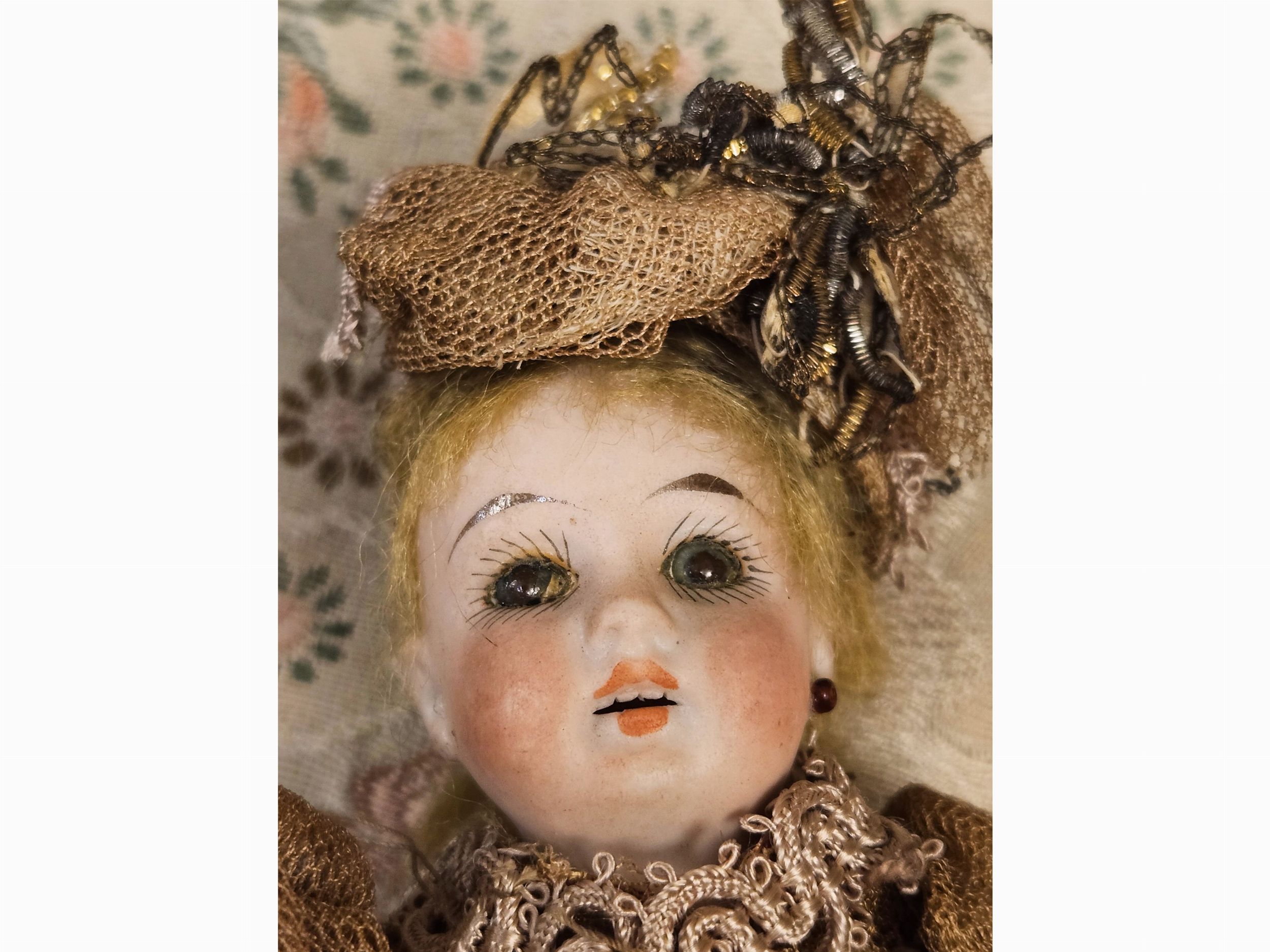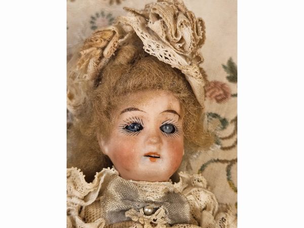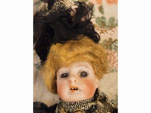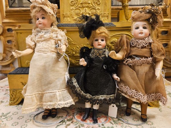 Manifattura europea, prima metà del XX secolo occhi fissi in vetro, bocche aperte con dentini modellati, parrucche in mohair, corpi rigidi in composizione, braccia curve, abiti d'epoca, lievi difetti