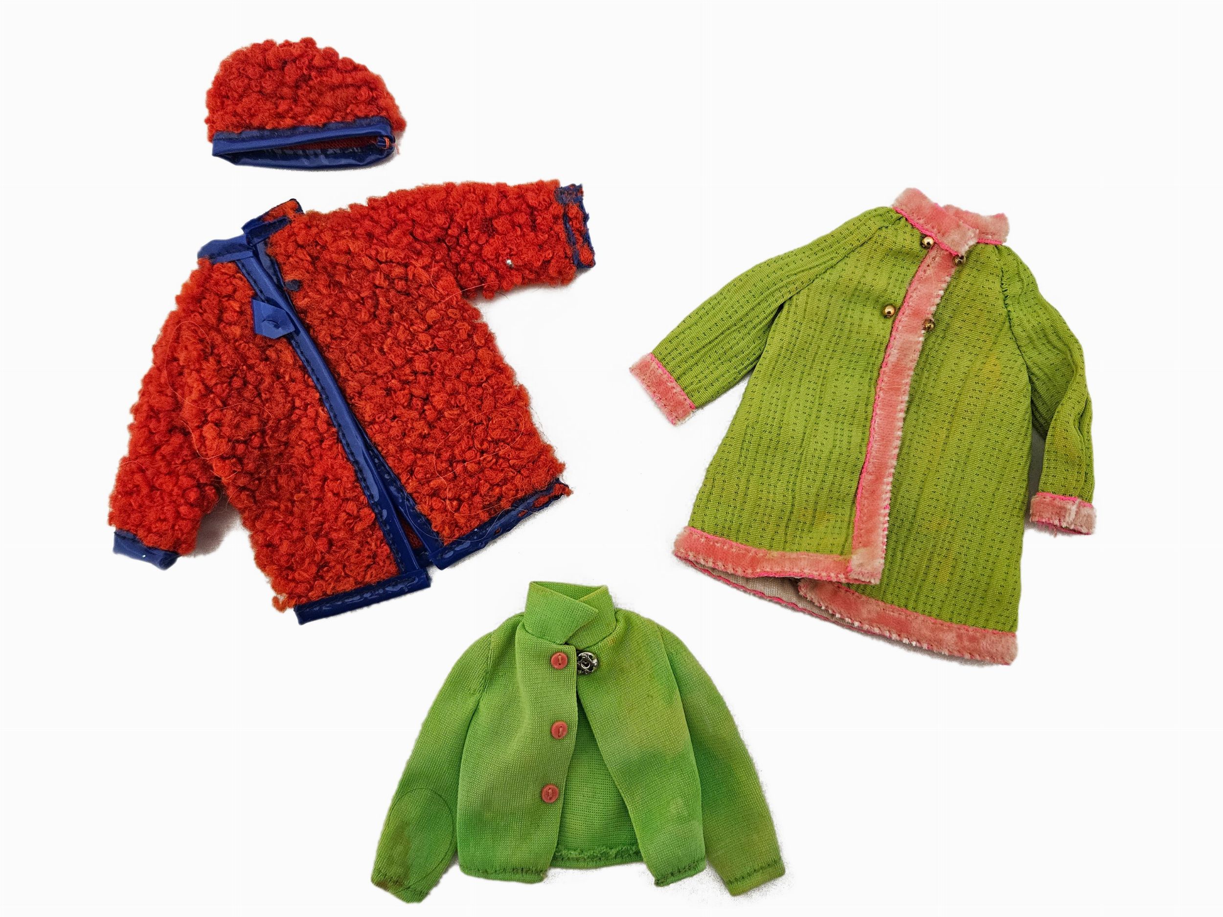 Anni Sessanta/Settanta cappottino in lana bouclé rossa con cappellino, camicia e soprabito verde acido e rosa