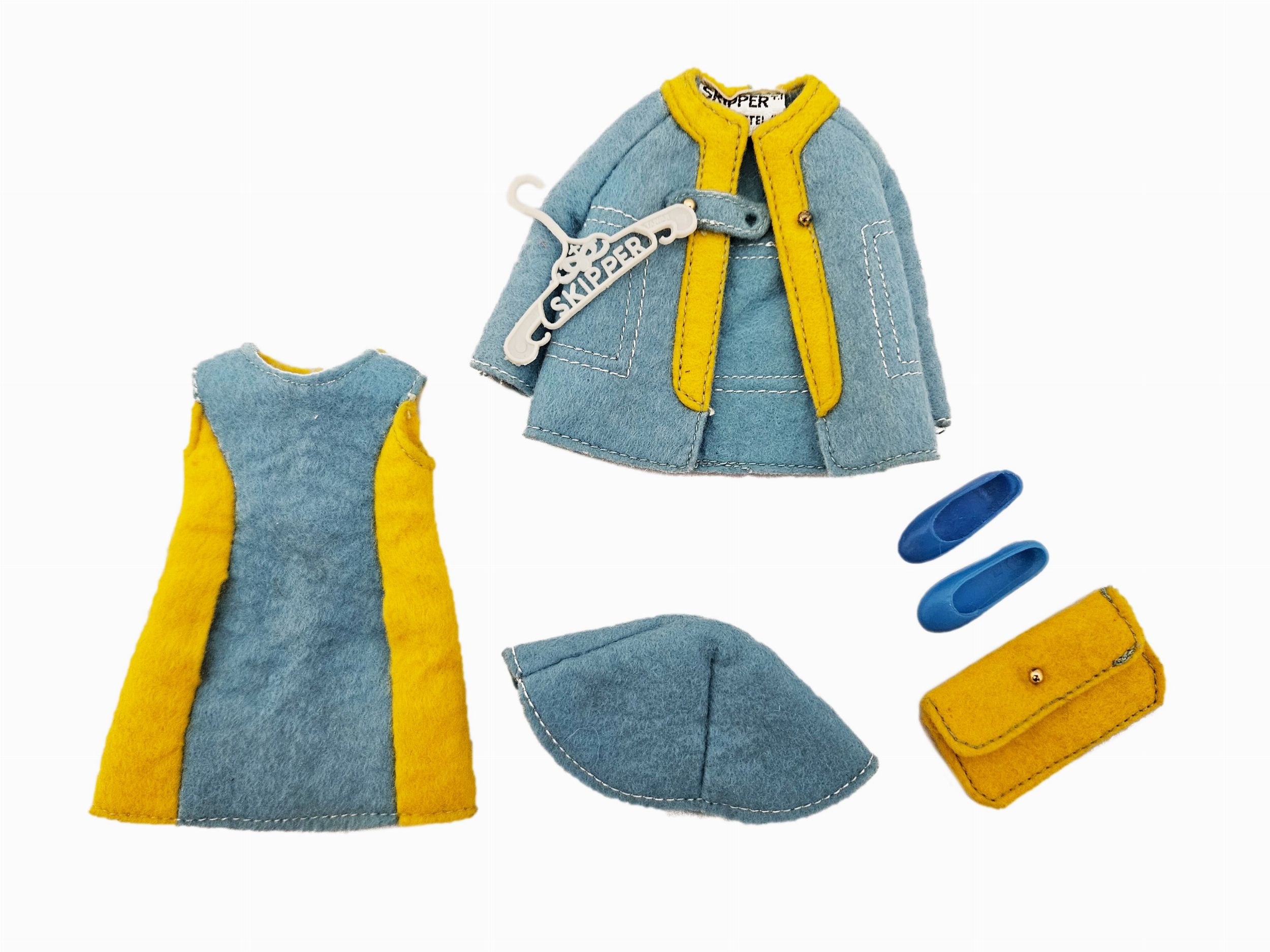 Anni Sessanta/Settanta tubino, mantella, pochette, cappello, scarpine e gruccia