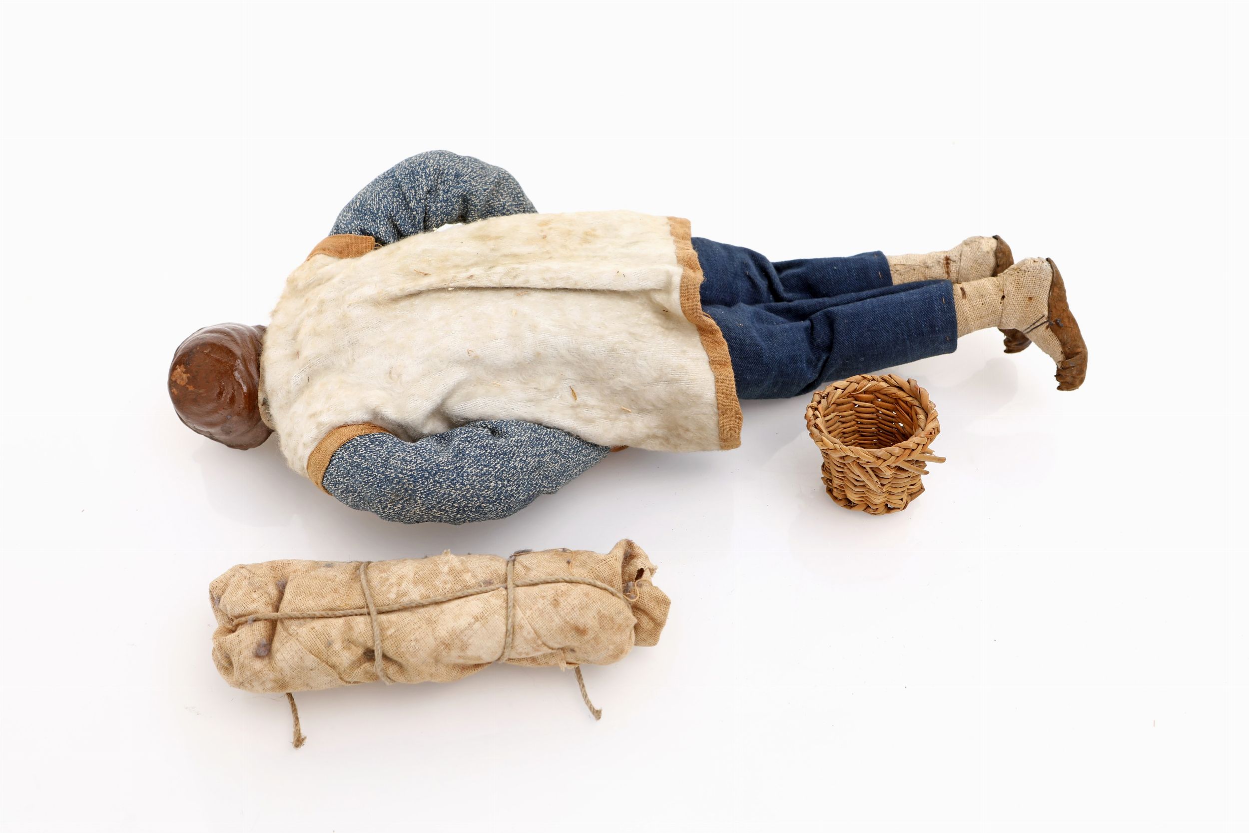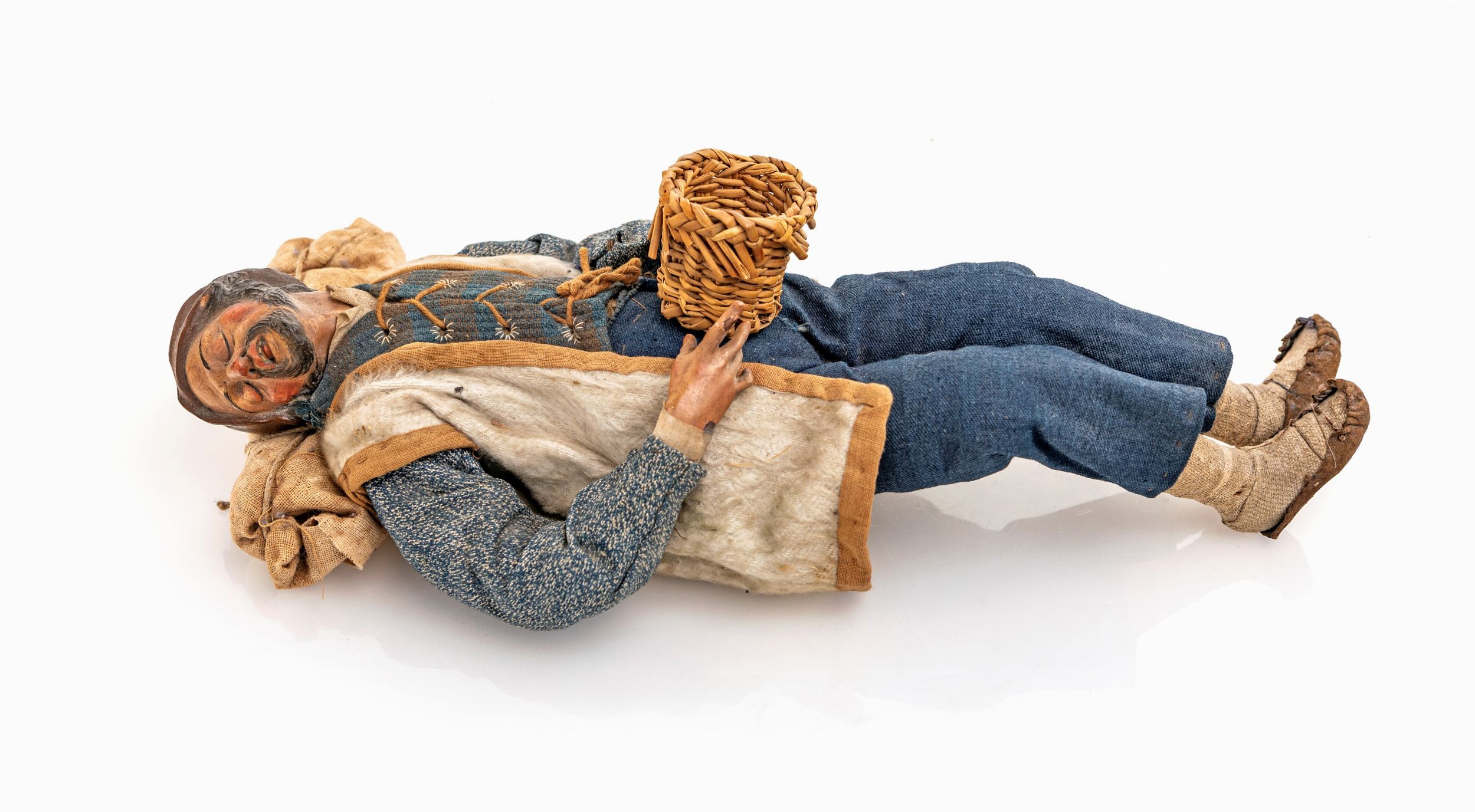 cm 40 Nel presepe napoletano, Benino è il nome del pastore dormiente, personaggio iconico poichè rappresenta la chiesa dormiente prima della nascita di Gesù. Il corpo disteso, il capo con cappello in terracotta e gli occhi chiusi appoggiato ad un fardello beige. Camicia bianca, gilet di pecora, giacca melange e pantaloni blu, calzettoni di tela bianca e ciocie ai piedi. Accessori: cesto in vimini e sacco
