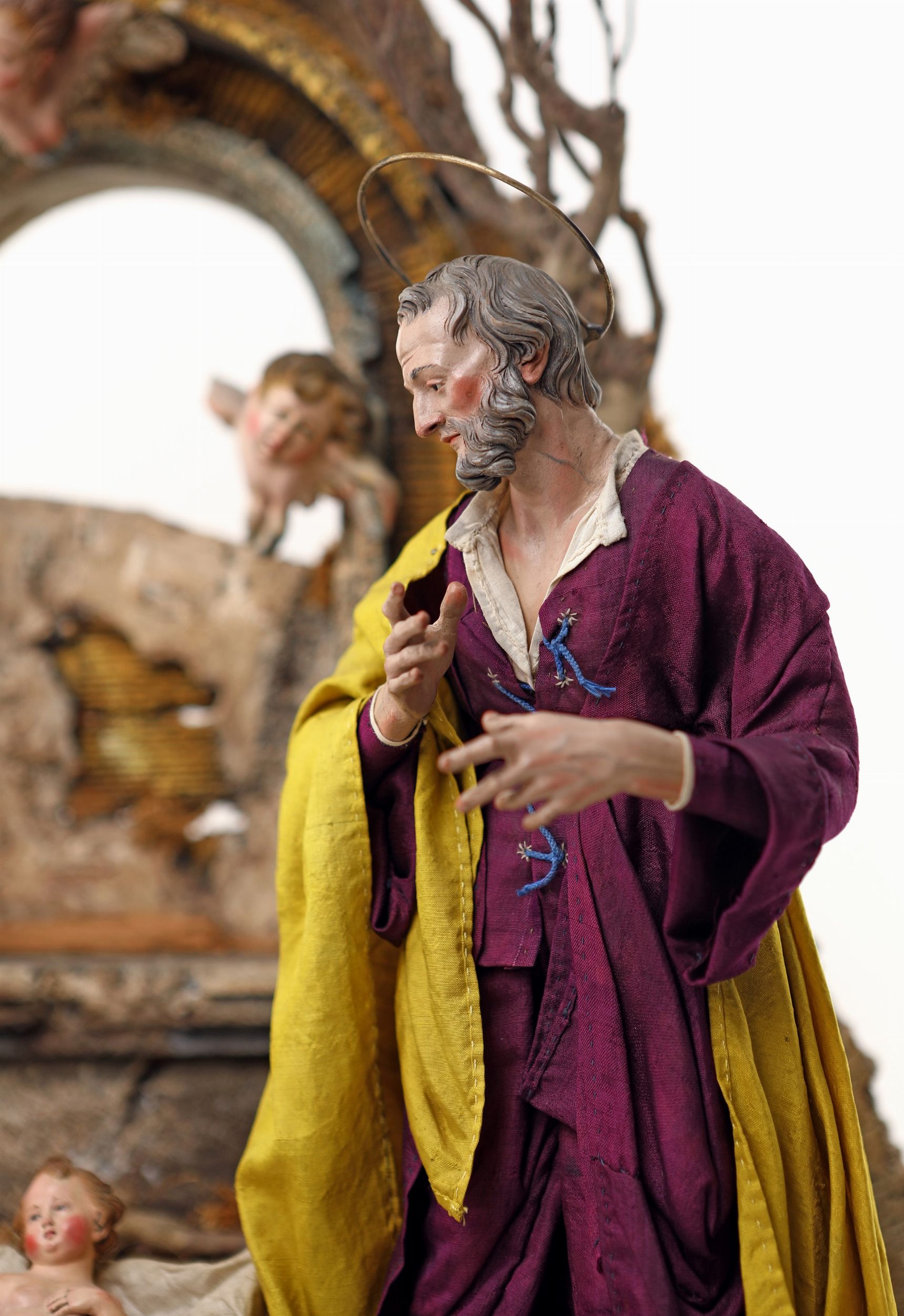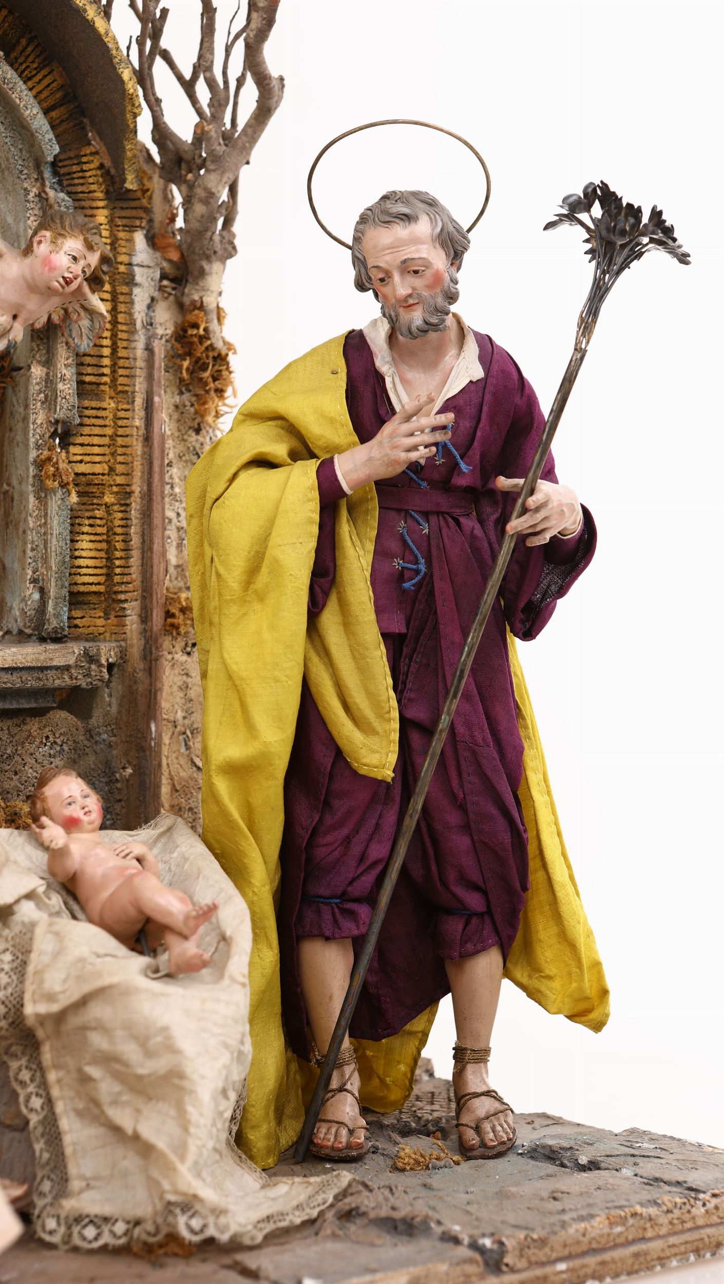 cm 65 (comprese le fronde) x 45 x 33 composto dalla Madonna, San Giuseppe, il Bambino e tre teste di cherubino ambientate in uno scoglio con ruderi realizzato in legno e sughero. La Madonna seduta abbigliata con tunica rosa, manto azzurro e velo di merletto sulla testa con aureola a cerchio in argento e sandali ai piedi (altezza cm 27); San Giuseppe con tunica viola e mantello in seta gialla, bastone fiorito in argento e sandali ai piedi (altezza cm 34); Bambinello in terracotta (cm 11); tre teste di cherubino (cm 5x7,5). Accessori: aureole e bastone fiorito in argento