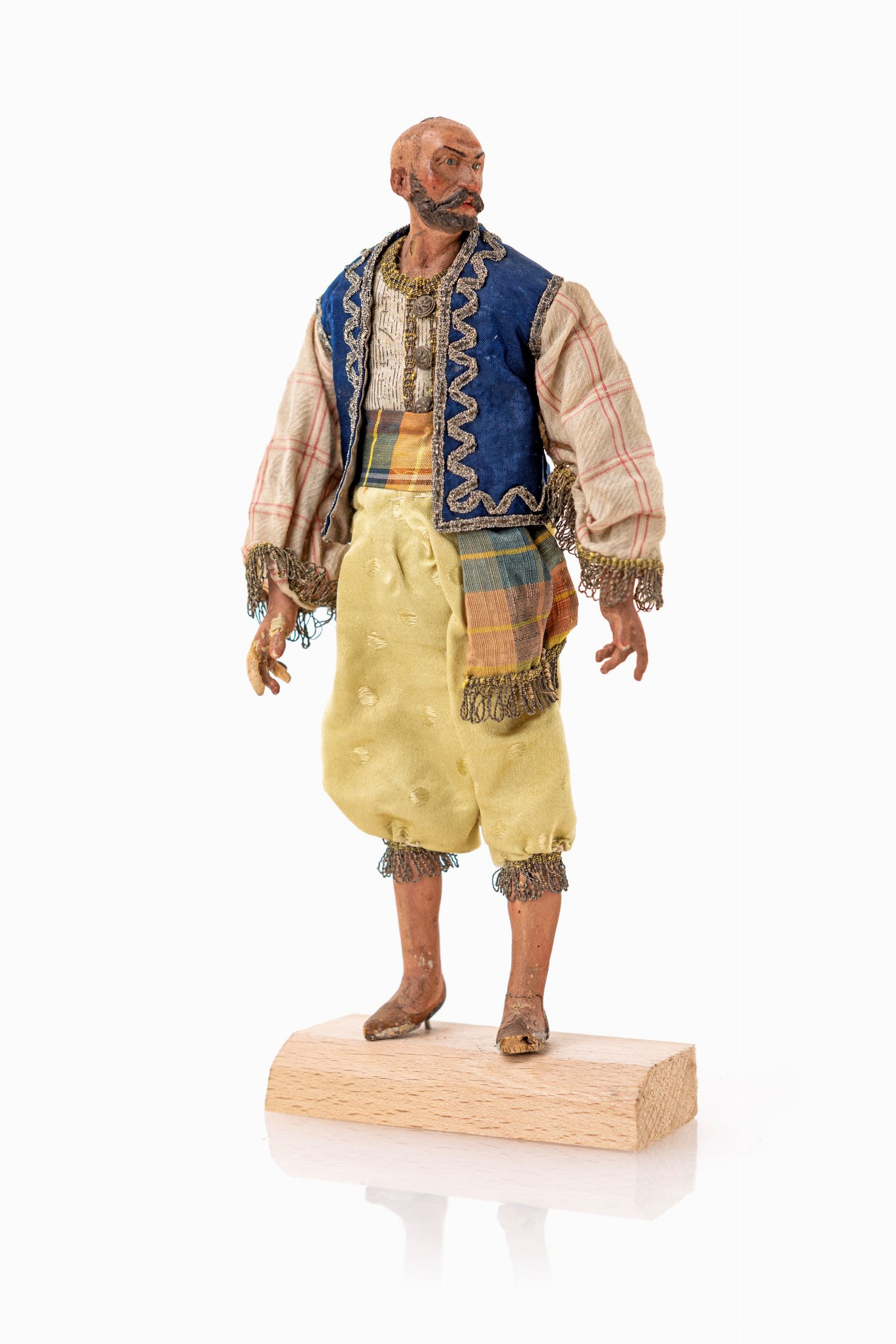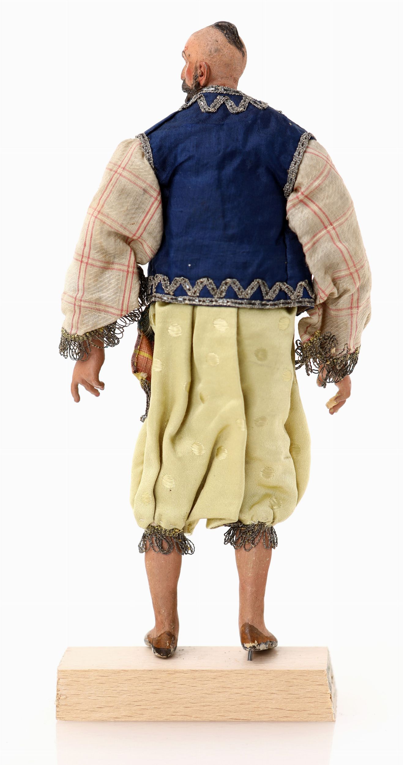 camicia e gilet blu con gallonatura, pantaloni gialli, fusciacca in vita. Difetti e mancanze