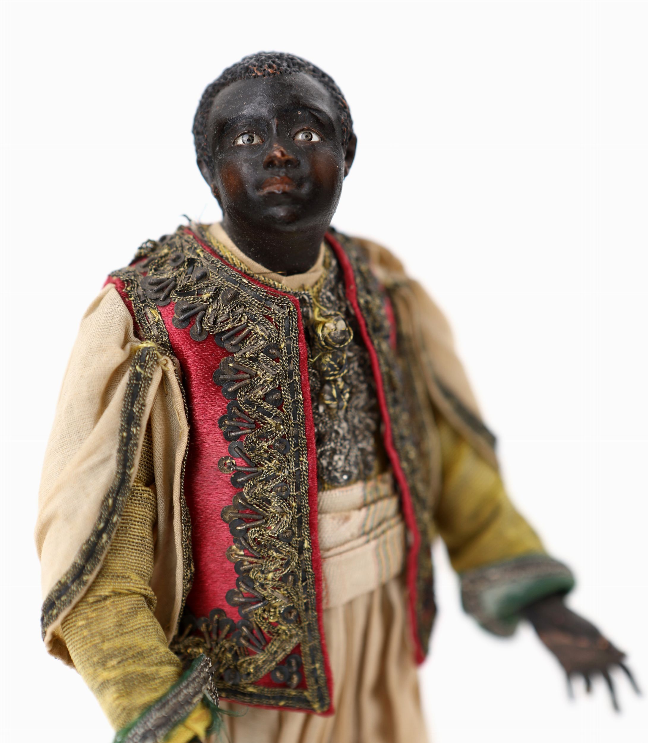 altezza cm 17,5 pantaloni alla zuava in seta avorio con fusciacca in vita, panciotto con ricca ornamentazione ricamata in fili d'argento, lo sguardo rivolto verso l'alto. Piccole mancanze