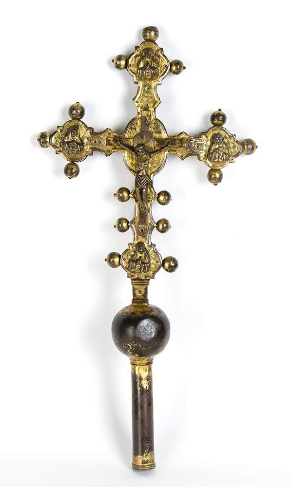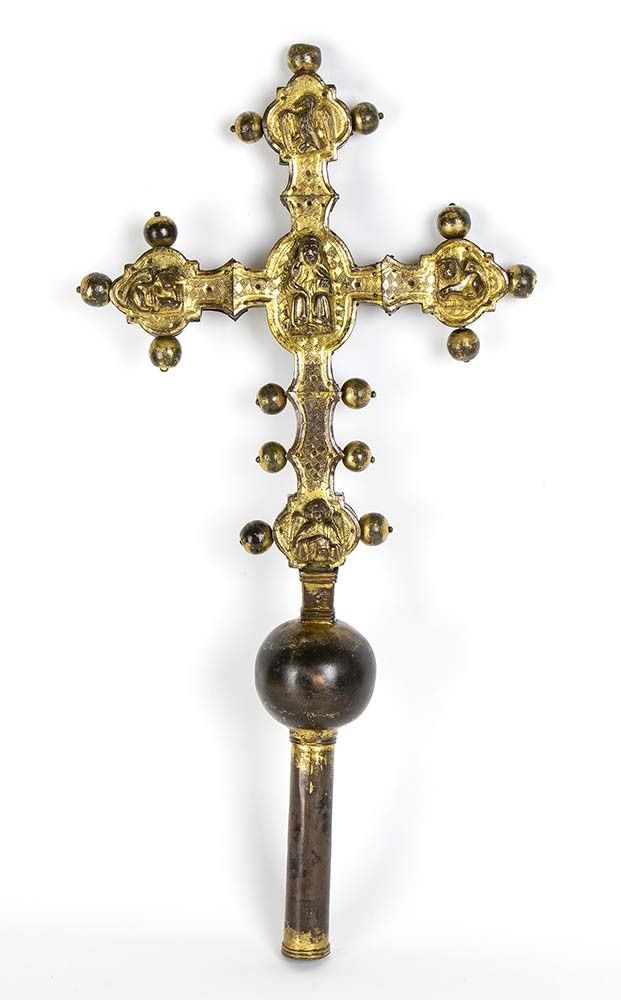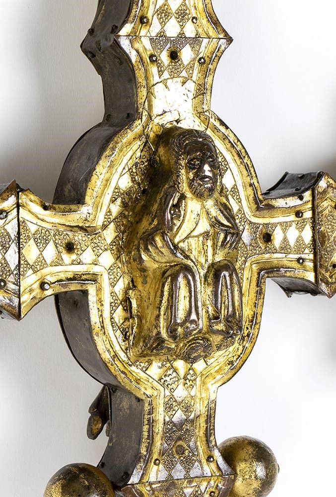 lamina di rame sbalzata, cesellata e dorata su anima di metallo a fusione dorato.La croce, finemente decorata, presenta una struttura a croce latina, con i bracci dai profili taglienti e terminali polilobati, entrambe le facce sono decorate da un motivo romboidale a scacchiera su sfondo punzonato.Sul fronte appare all'incrocio dei bracci la figura di Cristo crocifisso a una sottile crocetta, mentre nelle formelle sbalzate laterali si notano i mezzi busti di Maria e Giovanni, in alto un angelo ed in basso la Maddalena; sul recto invece è rappresentato al centro Dio Padre benedicente a tutta figura, sui quattro terminali i simboli animali degli Evangelisti: in alto l'aquila che rappresenta Giovanni, in basso l'angelo, simbolo di Matteo, sulla destra il leone di Marco nel lato opposto il toro, simbolo dell'evangelista Luca. Degna di nota, sul verso la figura di Cristo al centro che ha come riferimento un modello arcaico. La concezione generale della croce rientra in moduli correnti: i bordi sono ondulati, l'incrocio dei bracci è raccordato da un profilo, gli sfondi sono decorati.L’opera rientra nel vasto repertorio di croci astili lombarde quattrocentesche caratterizzate da questo tipo di struttura e di decorazione. Nel caso qui proposto si può segnalare una certa arcaicità, sia nello stile delle immagini, sia per ciò che concerne la tecnica di creare le figure a sbalzo direttamente dalle lamine di sfondo e cioè non applicando le formelle sulle superfici metalliche ricoprenti integralmente i bracci dell'oggetto.