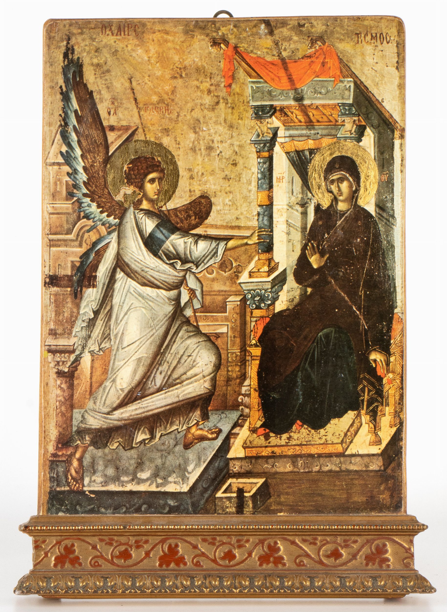 La Vergine siede sotto un baldacchino ornato con un drappeggio rosso vivo. Delle colonne blu incorniciano il baldacchino. Maria in mano tiene una matassa rossa di filato: l'Arcangelo Gabriele si è imbattuto in lei mentre filava la lana. La figura della Vergine è regale e maestosa, le sue pantofole sono di un colore riservato ai reali bizantini. L'arcangelo è vestito con tonalità di grigio e regge un bastone d'oro, ha ali marroni e blu. Egli si protende con forza e coraggio verso Maria.