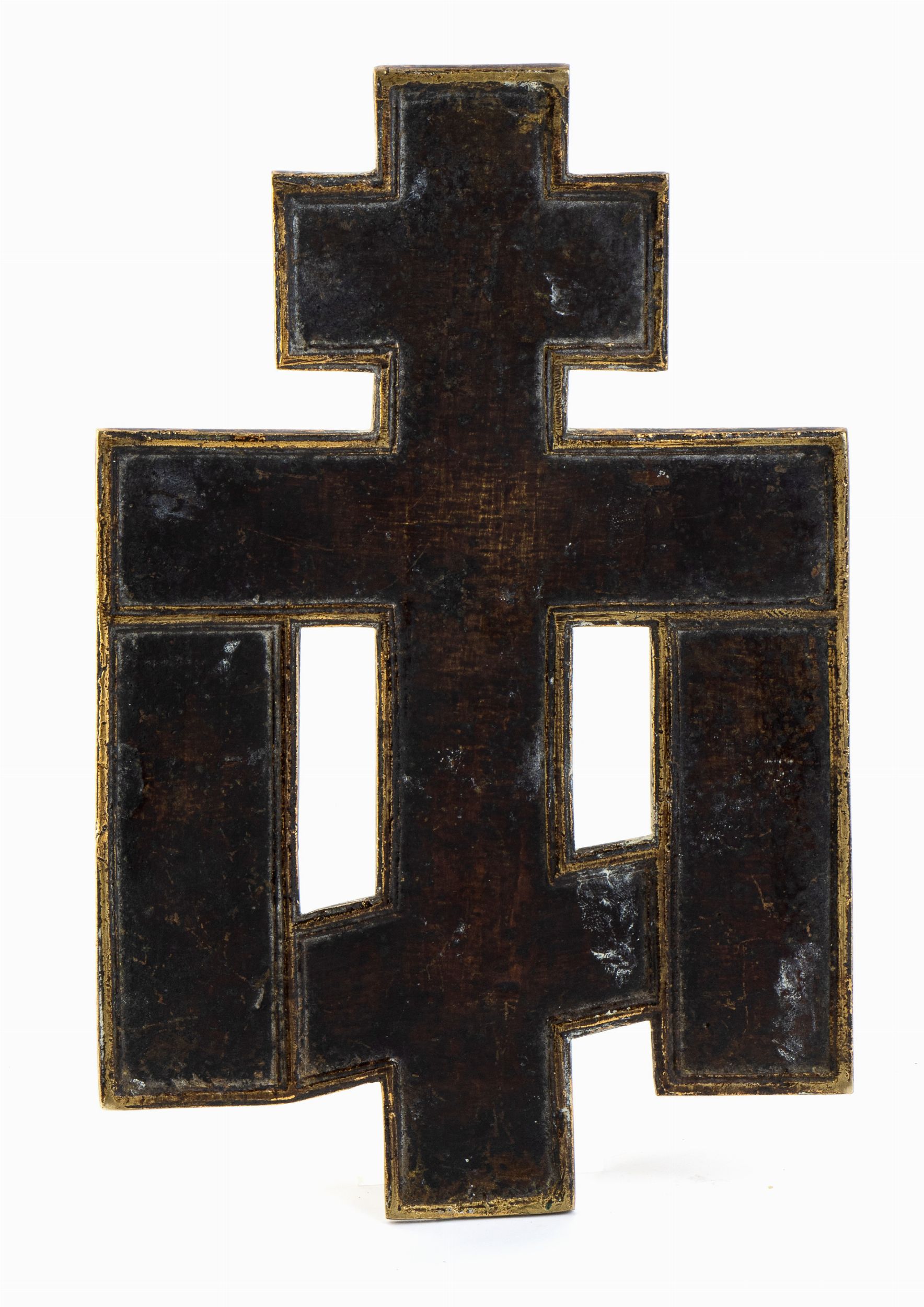 In bronzo dorato, presenta una barra verticale e tre traversali. Ogni barra rappresenta un particolare dettaglio del momento della crocifissione: La parte più alta e stretta, presenta la targa INBI in greco, corrispondente all’INRI latino, che sta per “Gesù Nazareno, Re degli Giudei”; la centrale rappresenta le braccia aperte del Cristo crocifisso; la più bassa, anch’essa più stretta rispetto a quella centrale, simboleggia il poggiapiedi, su cui il sangue di Cristo colava durante la crocifissione. La figura del Cristo non indossa una corona di spine, ed è fissato alla croce con tre chiodi anziché quattro. Dietro di lui sono presenti la lancia con cui Longino gli trafisse il costato e la spugna con cui venne dissetato con aceto. Sullo sfondo, la città di Gerusalemme, teatro della Passione. Della croce non si vede la base che è nascosta nel terreno, coperta da rocce che fanno da tetto ad una caverna sotterranea dove è conservato il teschio di Adamo. Quest'ultimo personaggio simboleggia la morte di Gesù, simbolo di salvezza, che vince su quella del primo uomo che non ha potuto accedere alla redenzione. Questa Croce rappresenta la vittoria sulla morte e sul dolore stesso.