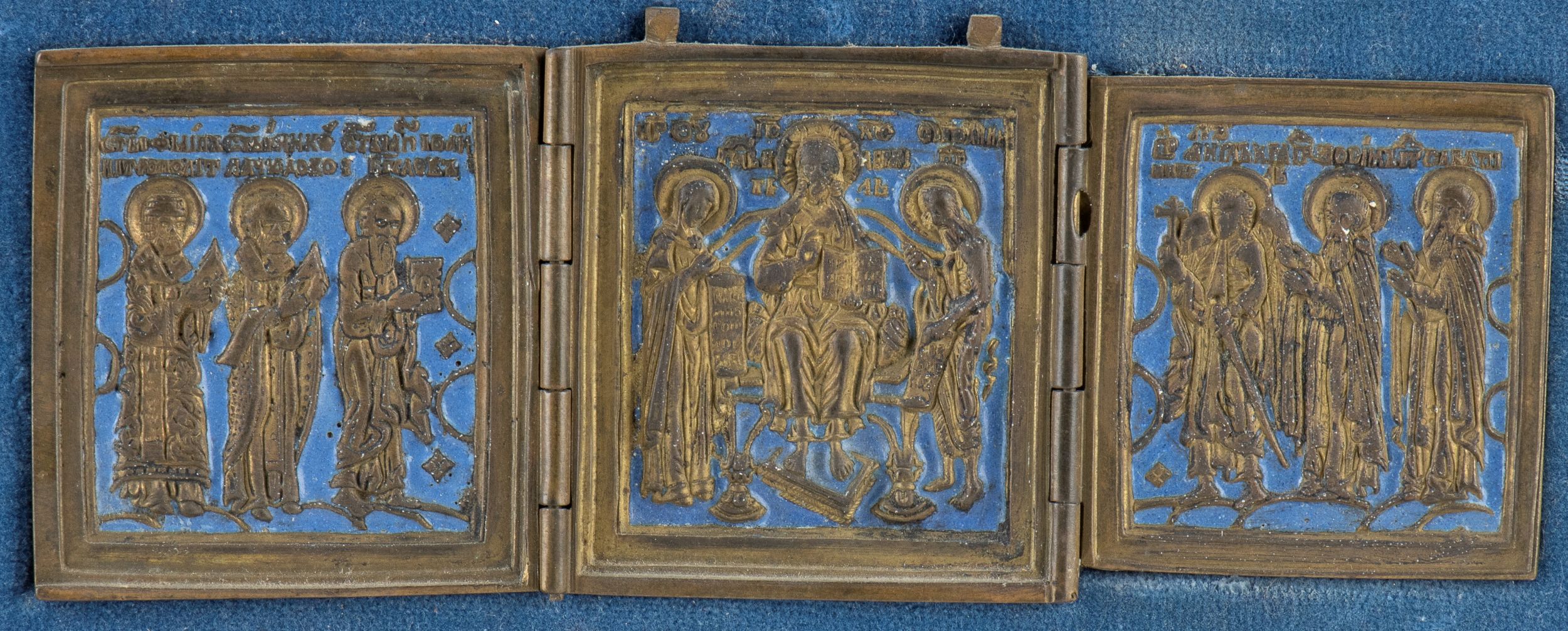 - Piccola icona da viaggio tripartita in bronzo e smalti raffigurante scene di Santi.