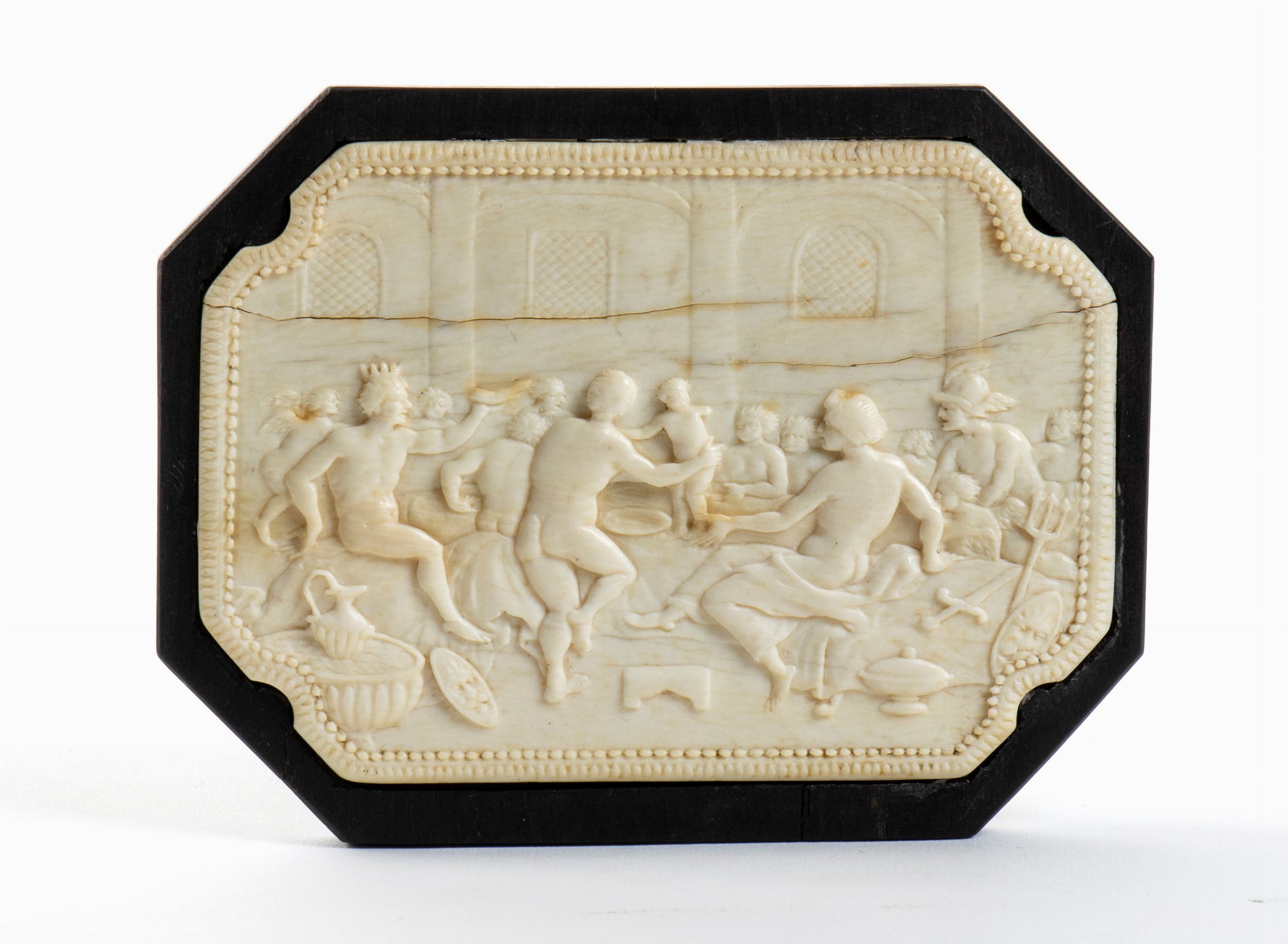Di forma rettangolare con angoli smussati, in avorio di elefante (Loxodonta africana Blumenbach, 1797 o Elephas maximus Linnaeus, 1758), finemente scolpita a raffigurare un banchetto degli dei con Eros e Mercurio. Incastonata su supporto in Ebano.