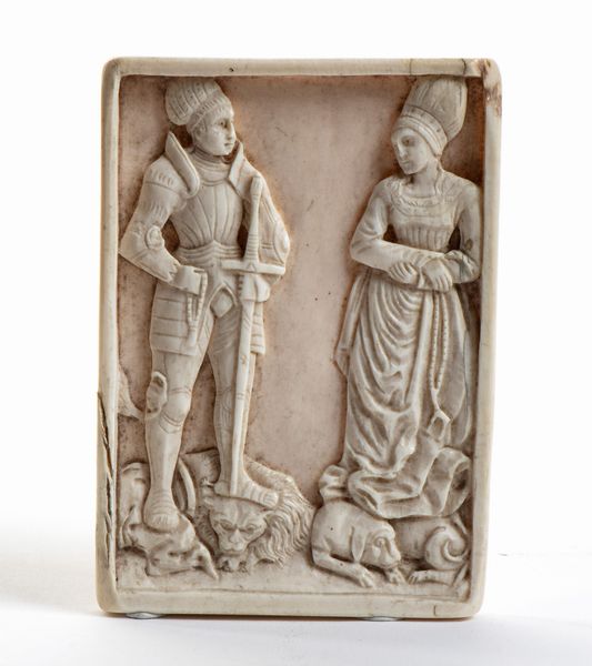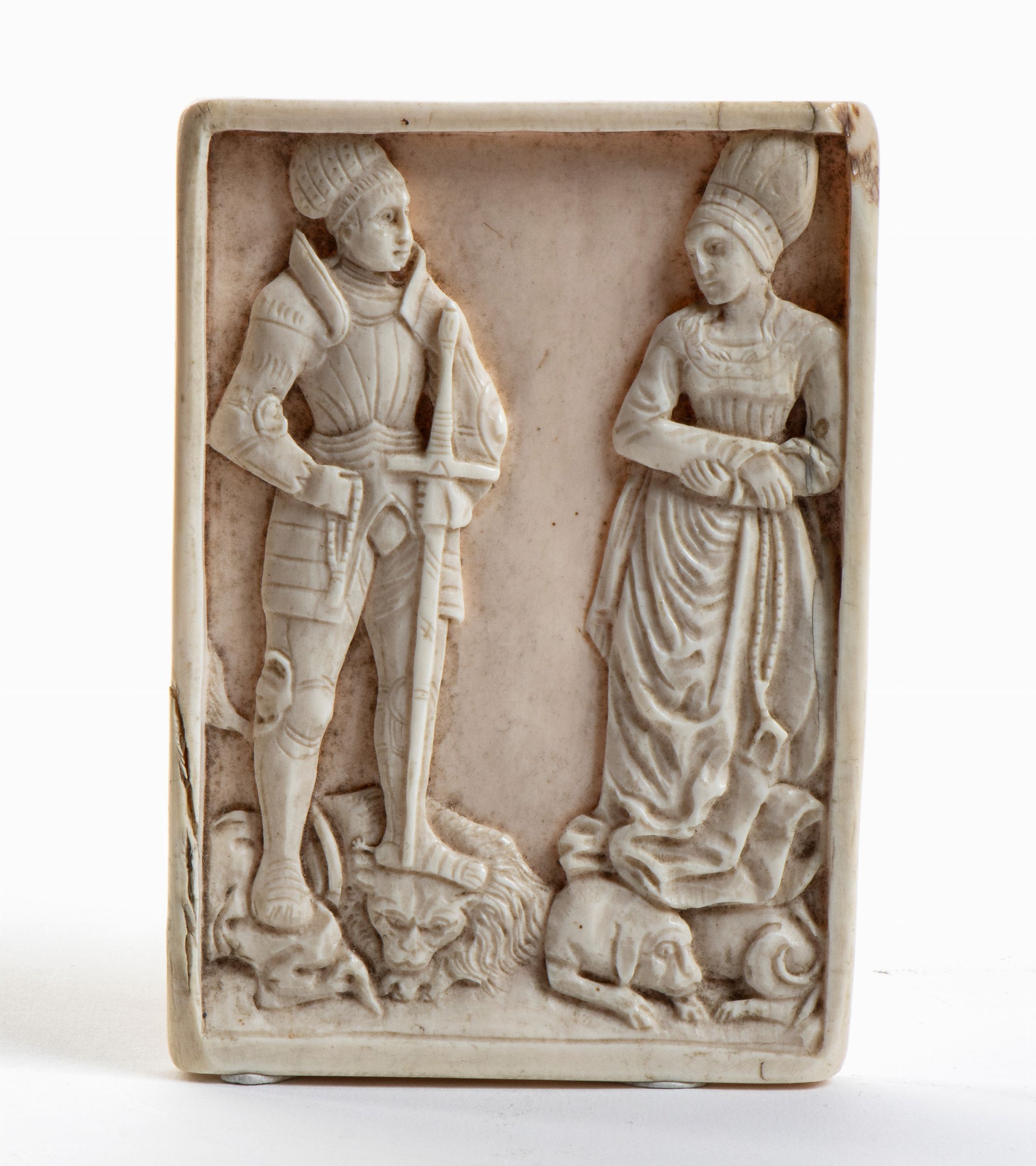 Di forma rettangolare con angoli smussati, in avorio di elefante (Loxodonta africana Blumenbach, 1797 o Elephas maximus Linnaeus, 1758), finemente scolpita ad alto rilievo a raffigurante un cavaliere in armatura ed una nobildonna.