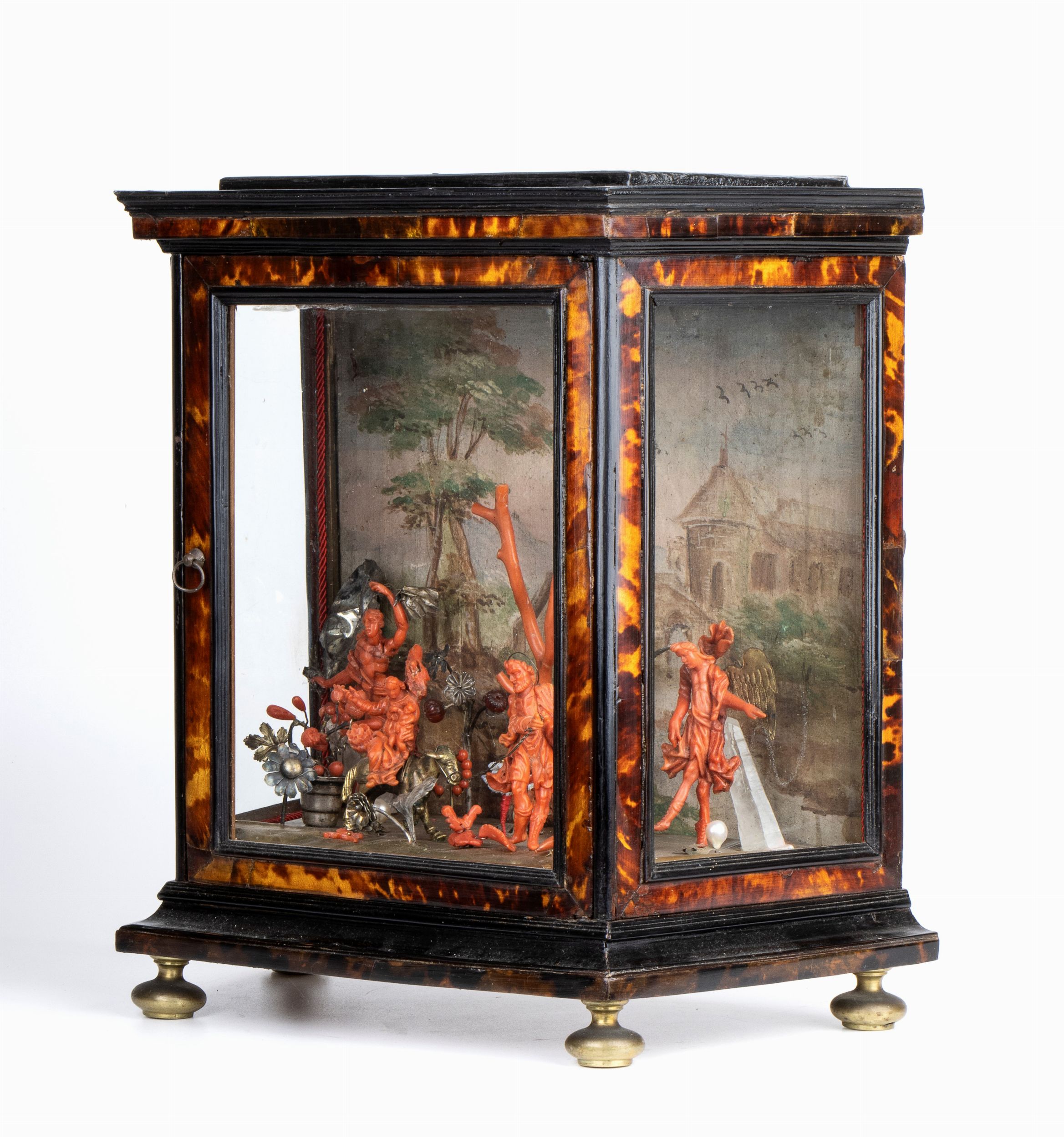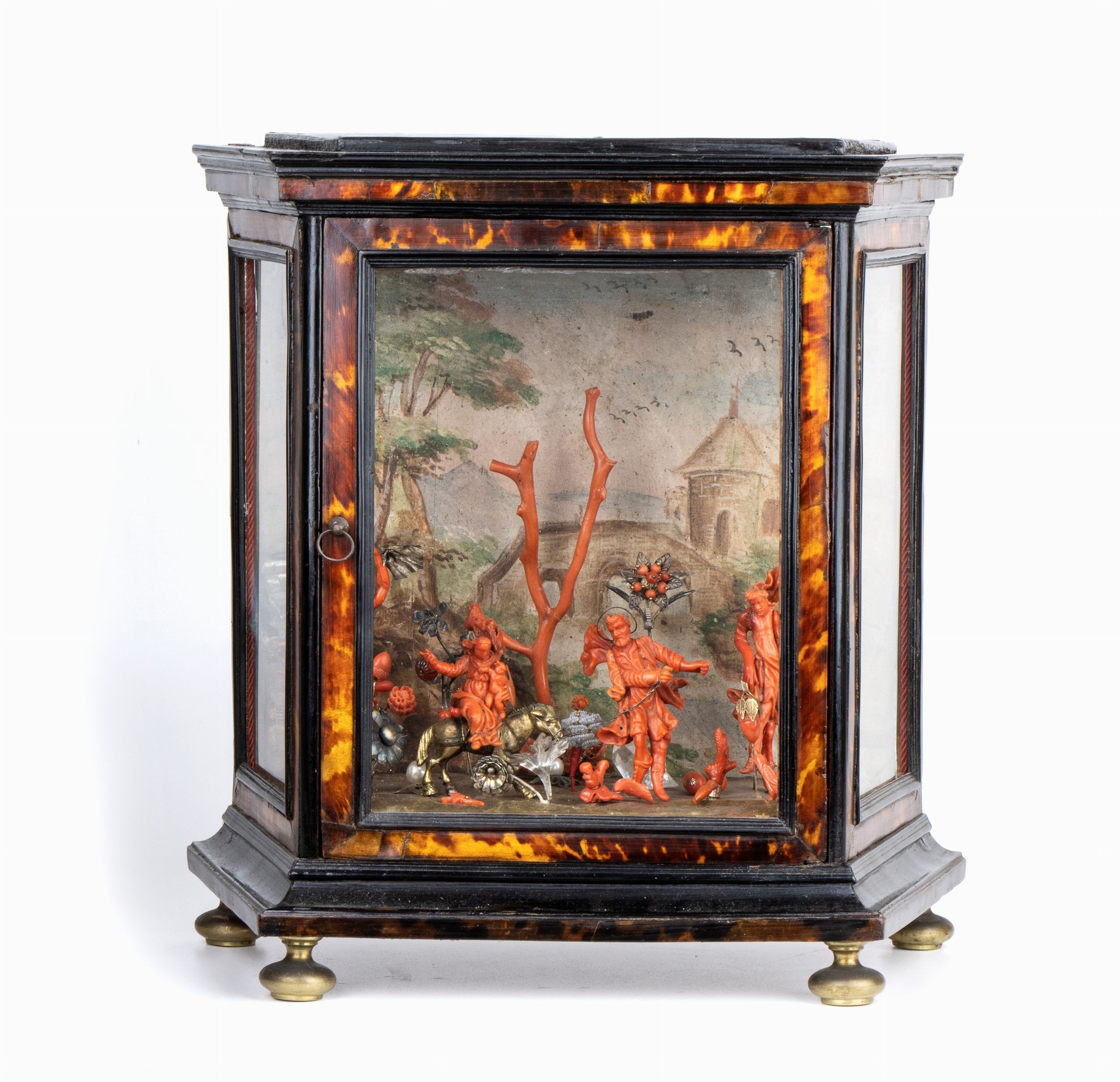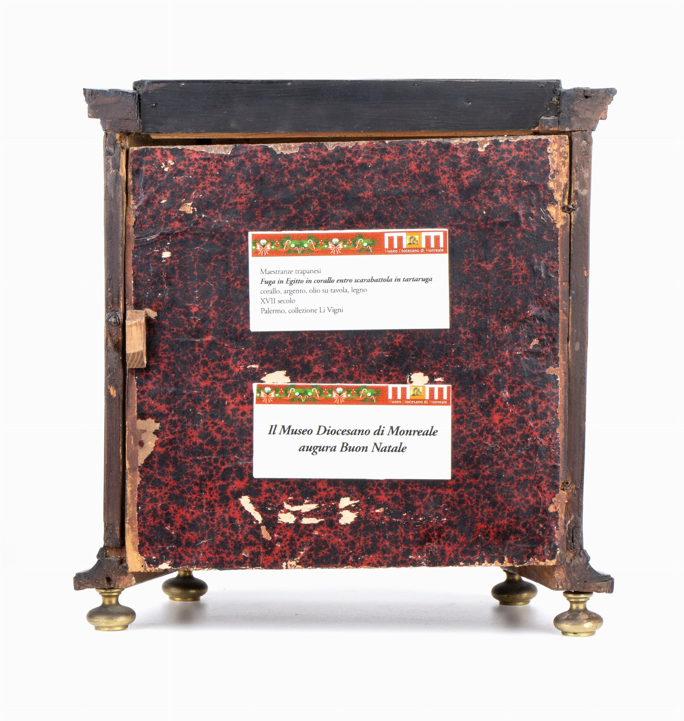 Il presepe è inserito in una teca in legno ebanizzato e tartaruga, poggiante su pedini a trottola in ottone.