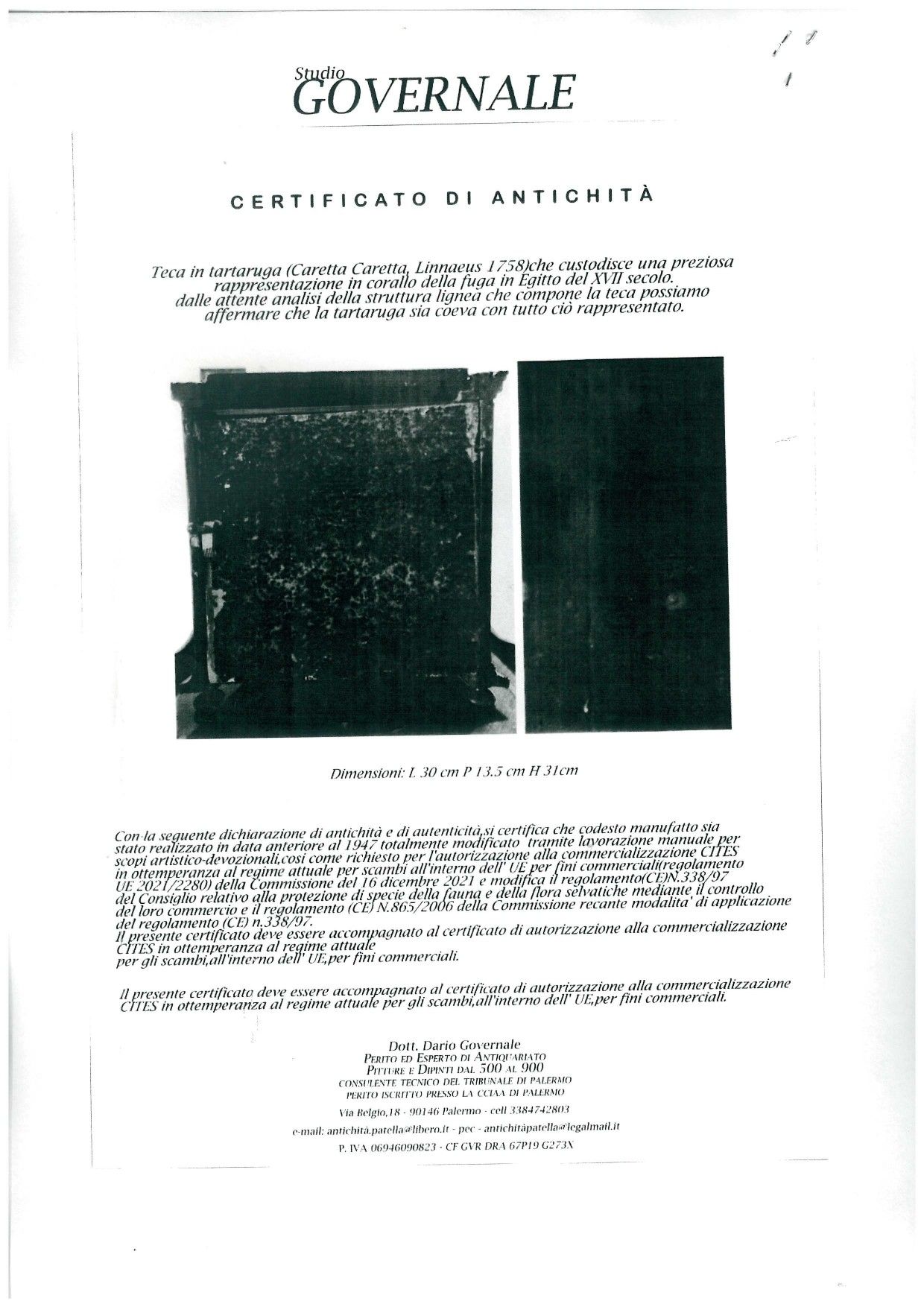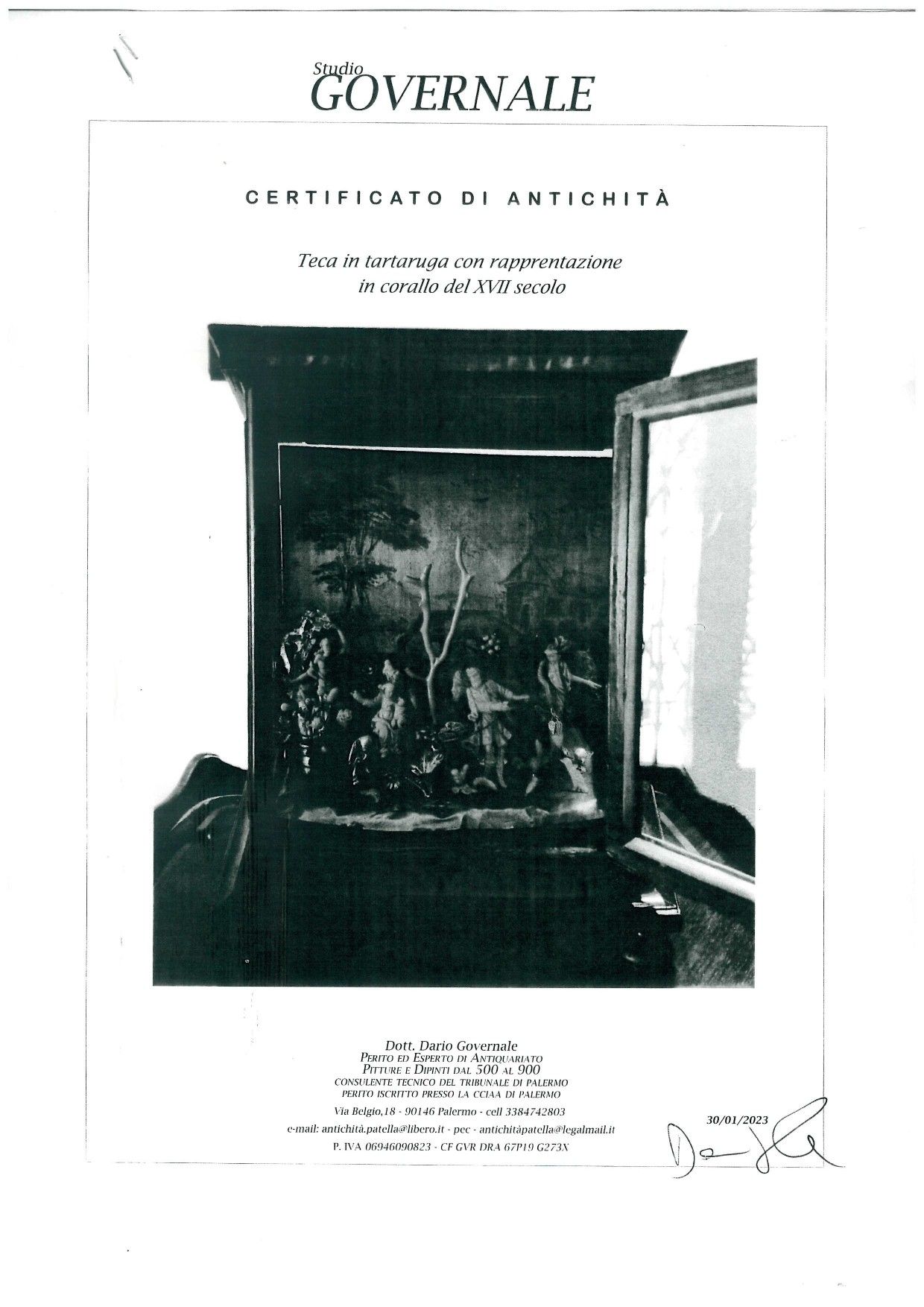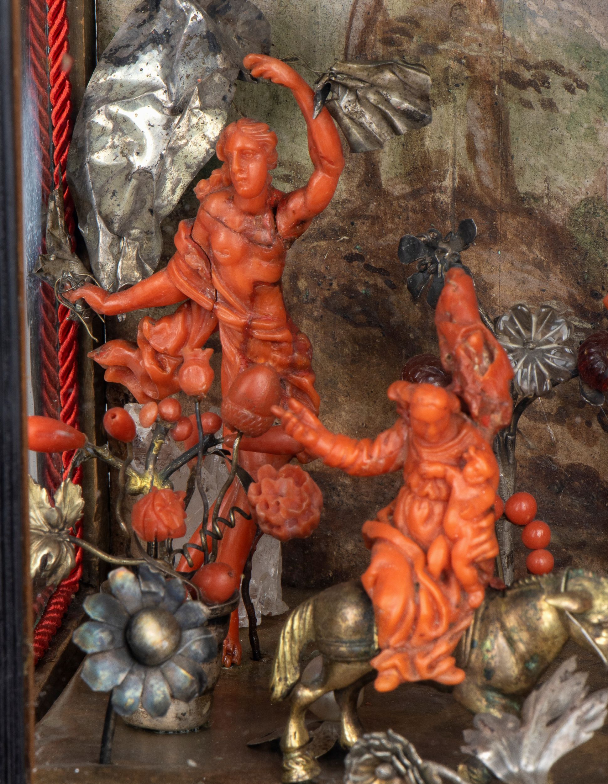 I personaggi della sacra rappresentazione, raffigurante la fuga in Egitto, sono ritratti nei tipici atteggiamenti e sono interamente scolpiti in corallo rosso mediterraneo (Corallum rubrum, Linneo 1758), presente anche in grezzi rametti, sfere, foglie e in lunghe gocce.