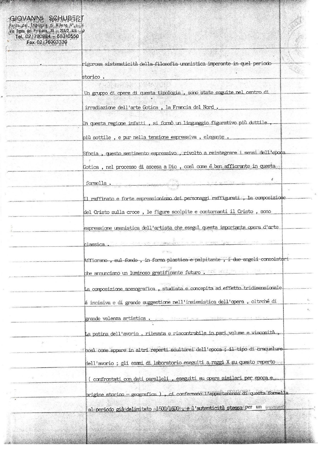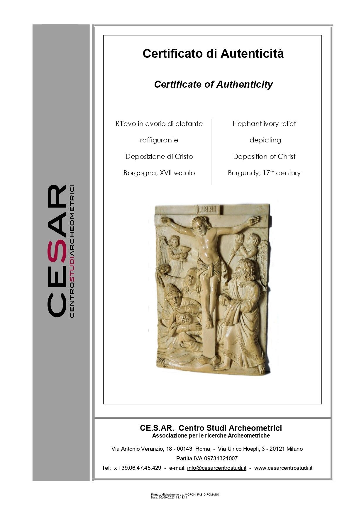 In avorio di elefante (Loxodonta africana Blumenbach, 1797 o Elephas maximus Linnaeus, 1758) finemente scolpito a raffigurante la Crocifissione di Cristo. La composizione è tipica del periodo tardo gotico di area francese dove erano prevalenti le rappresentazioni della filosofia umanista dell’epoca.