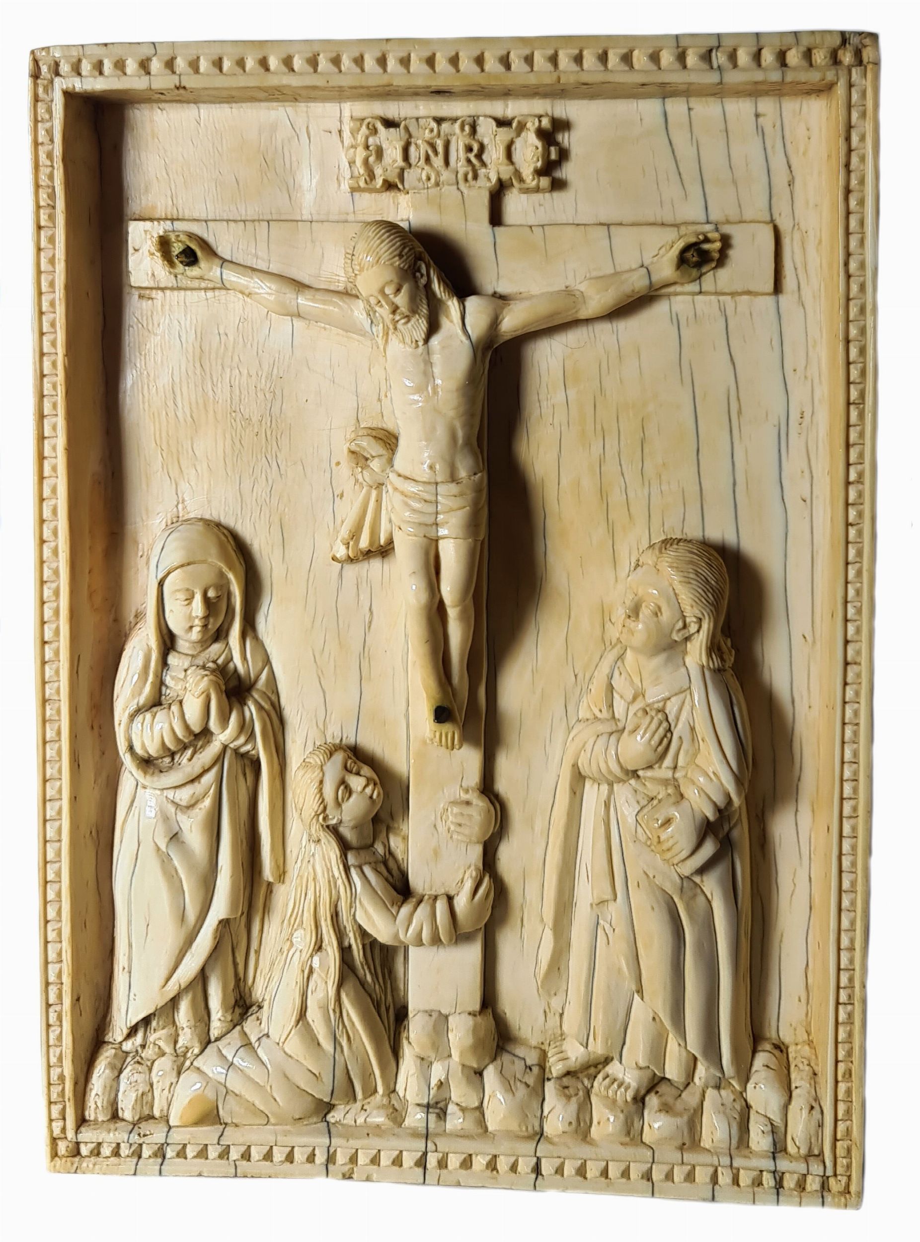 In avorio di elefante (Loxodonta africana Blumenbach, 1797 o Elephas maximus Linnaeus, 1758) finemente scolpito ad alto rilievo a raffigurare la Crocifissione di Cristo.