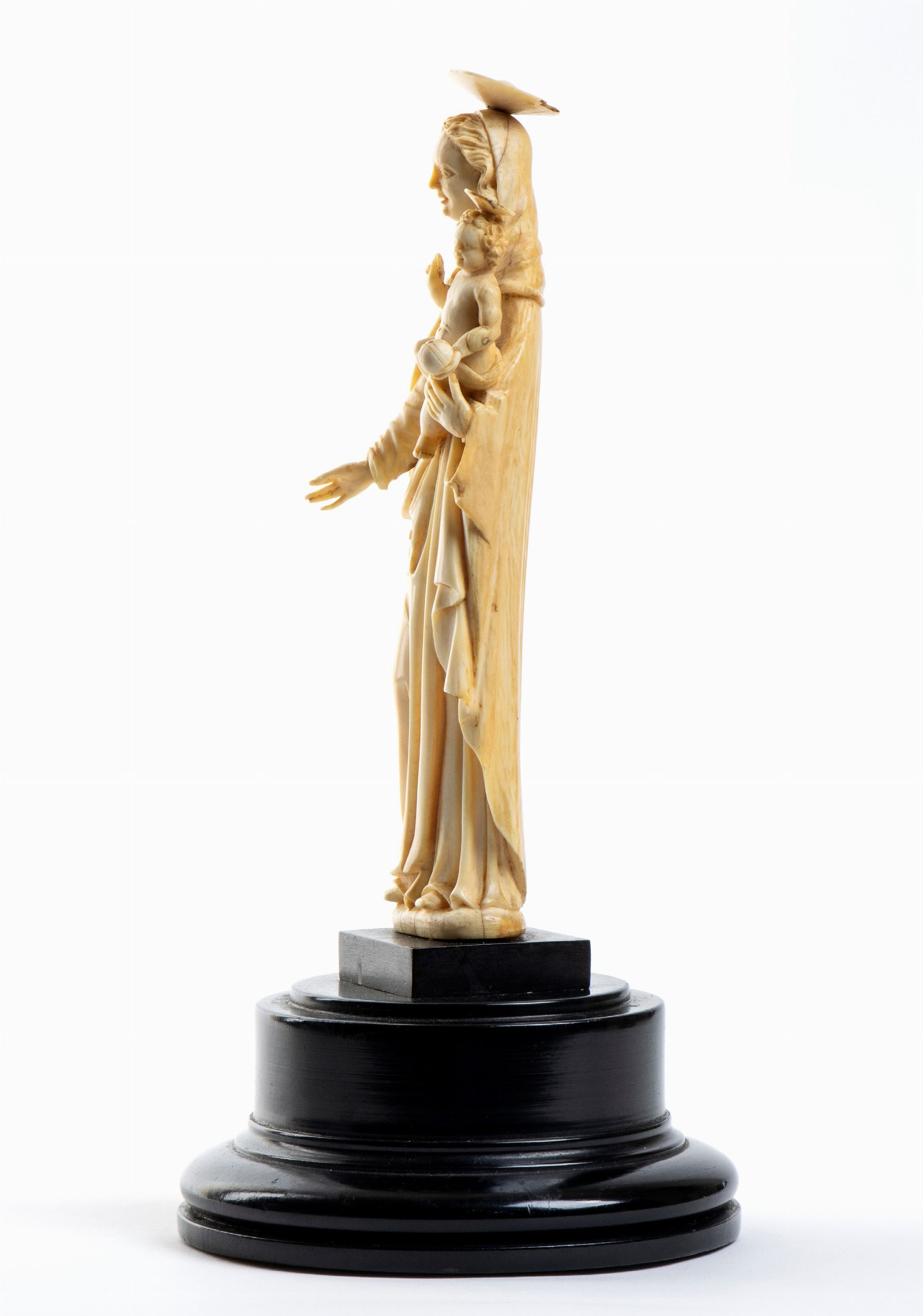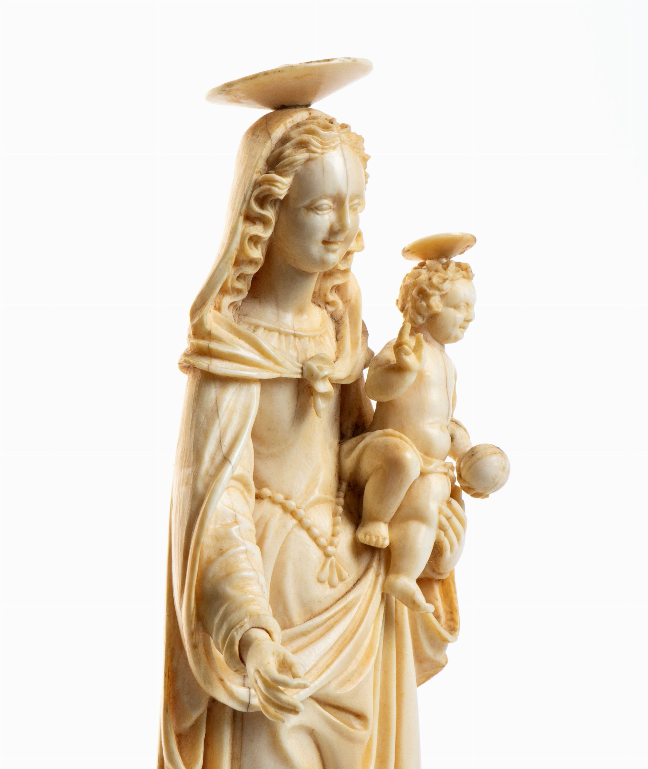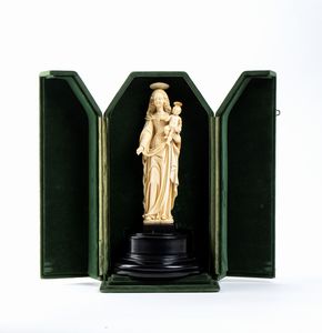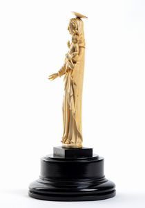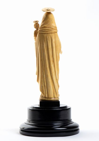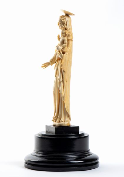 L’opera, scolpita a tutto tondo in avorio di elefante (Loxodonta africana) raffigura una Madonna stante con il Bambino posto sul braccio; il figlio è raffigurato benedicente con il Il globo crucigero (Globus cruciger) nella mano sinistra; la testa e gli occhi della Vergine e del Salvatore sono leggermente ruotati per guardare davanti a se.