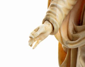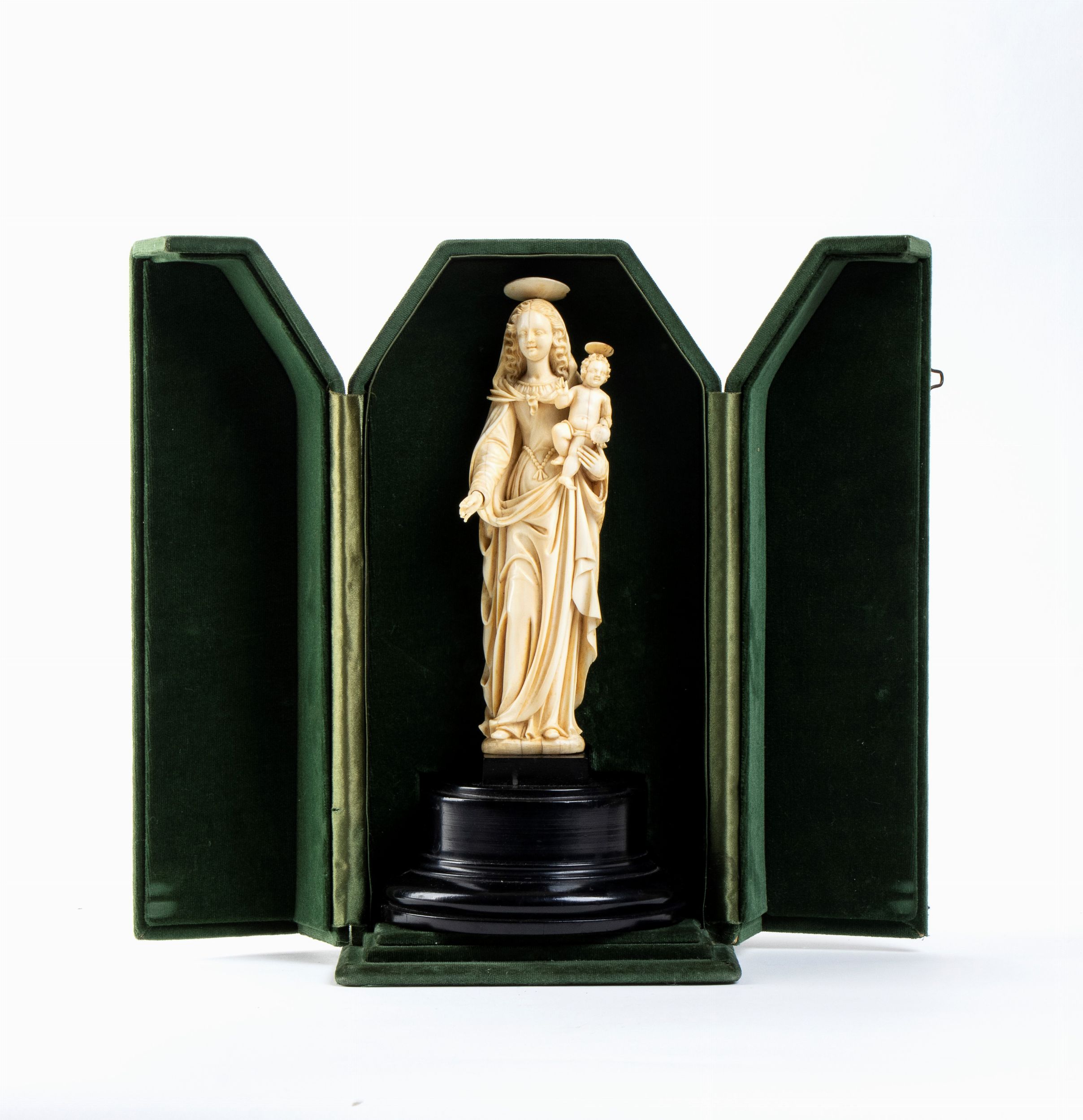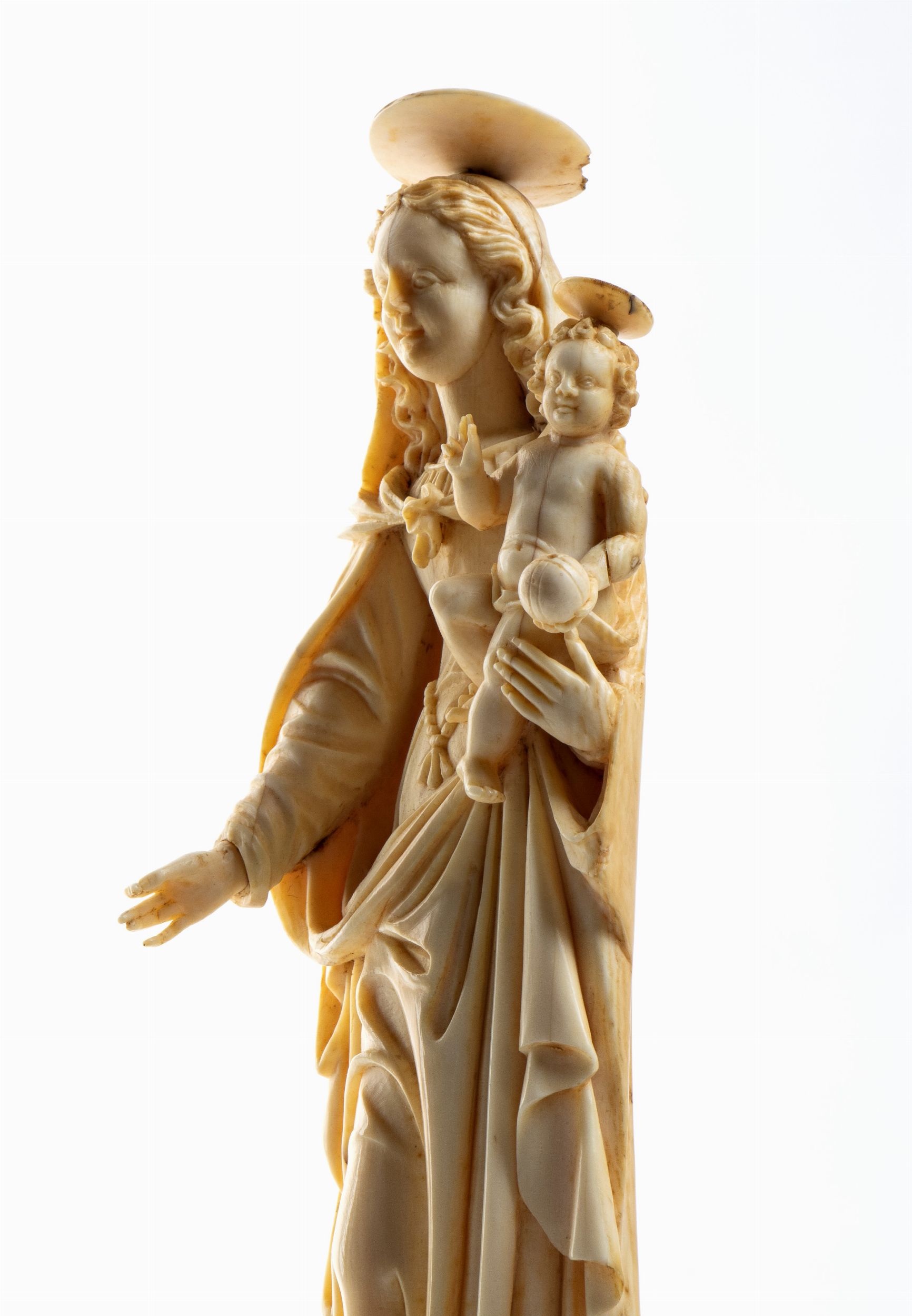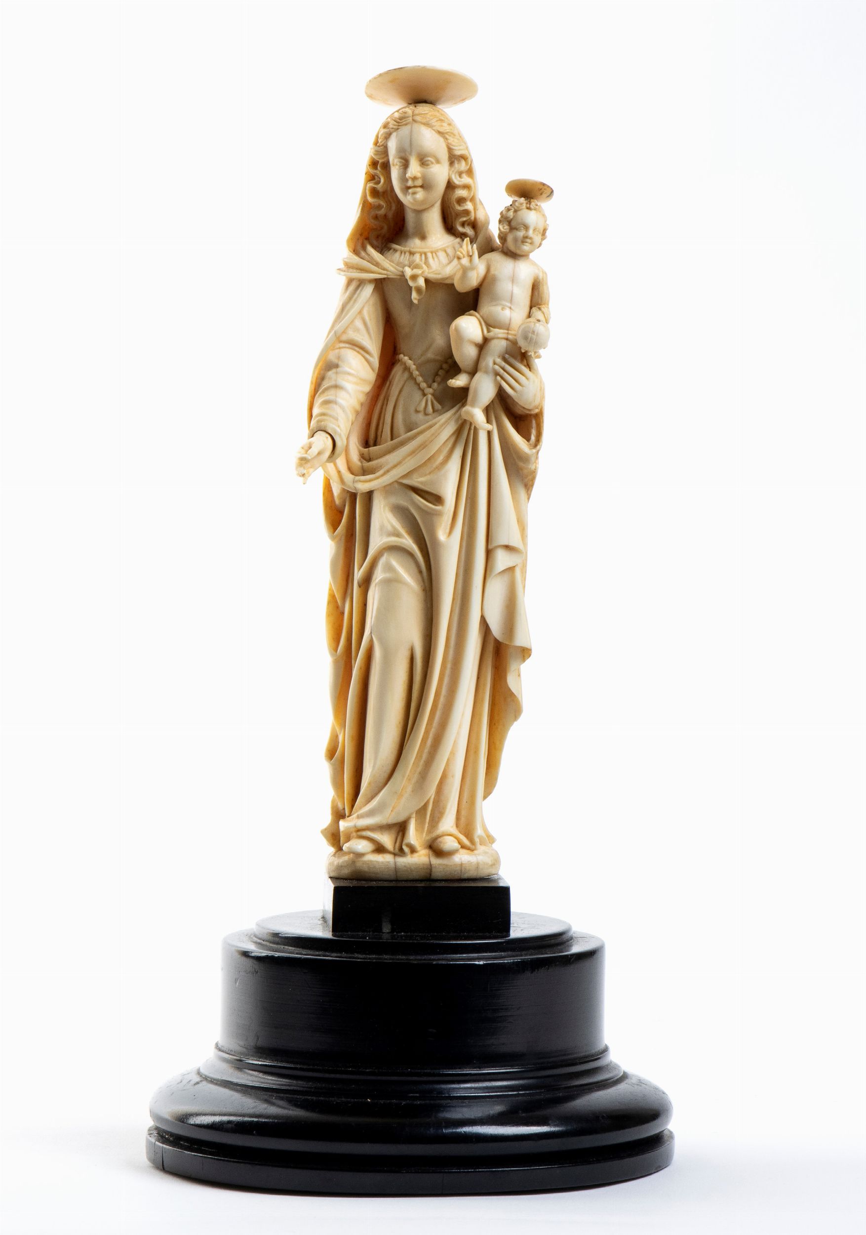 L’opera, scolpita a tutto tondo in avorio di elefante (Loxodonta africana) raffigura una Madonna stante con il Bambino posto sul braccio; il figlio è raffigurato benedicente con il Il globo crucigero (Globus cruciger) nella mano sinistra; la testa e gli occhi della Vergine e del Salvatore sono leggermente ruotati per guardare davanti a se.