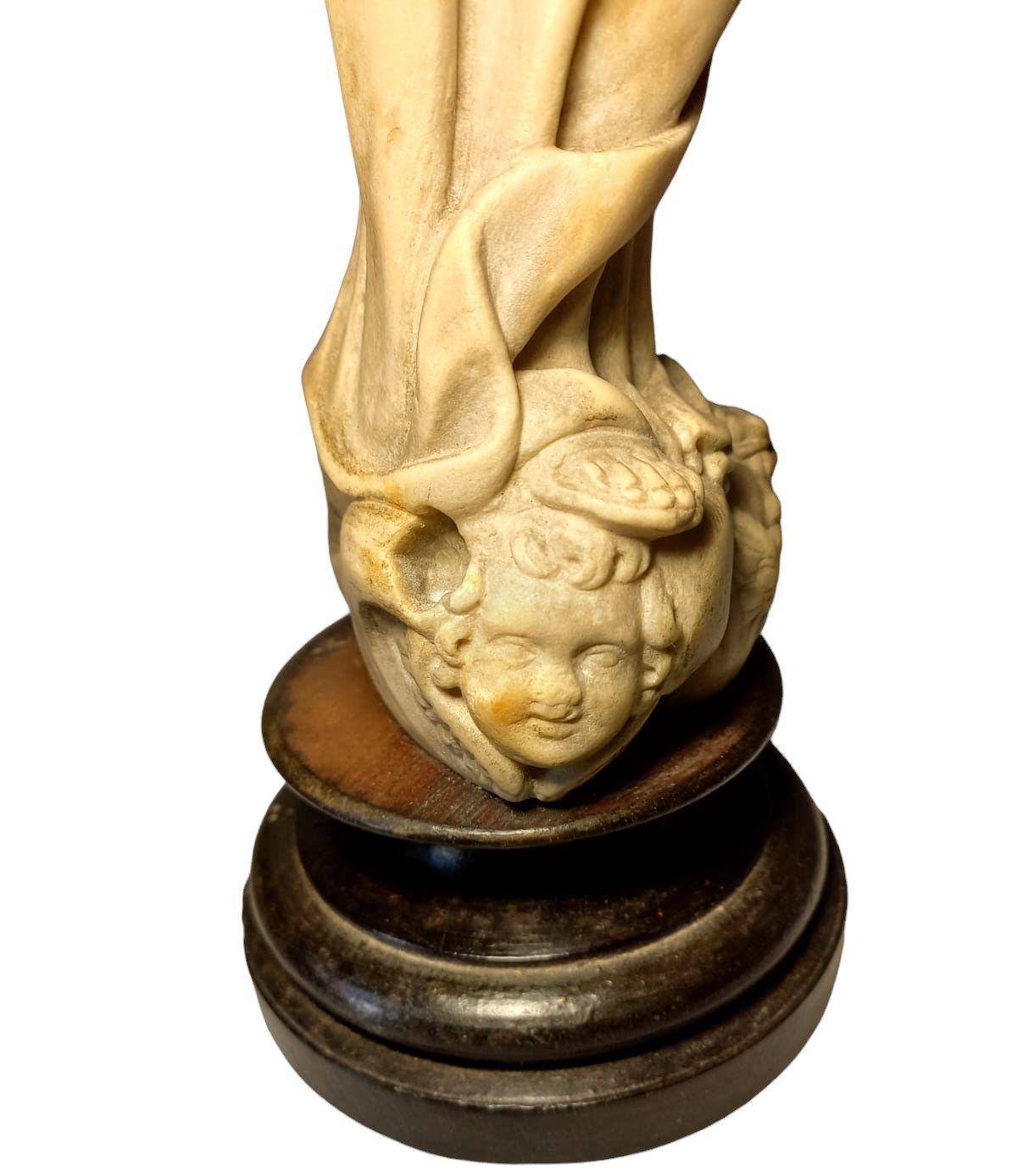 La figura della Vergine Immacolata scolpita a tutto tondo in marmo poggia su una base di nuvole e teste di cherubini e rappresenta la Madonna in estasi con le mani incrociate poggiate sul petto e lo sguardo rivolto verso l'alto.