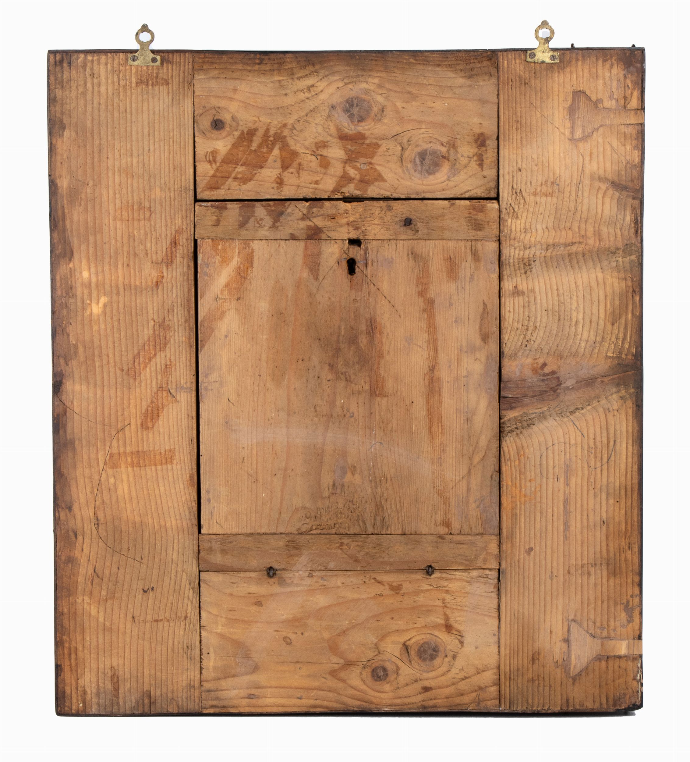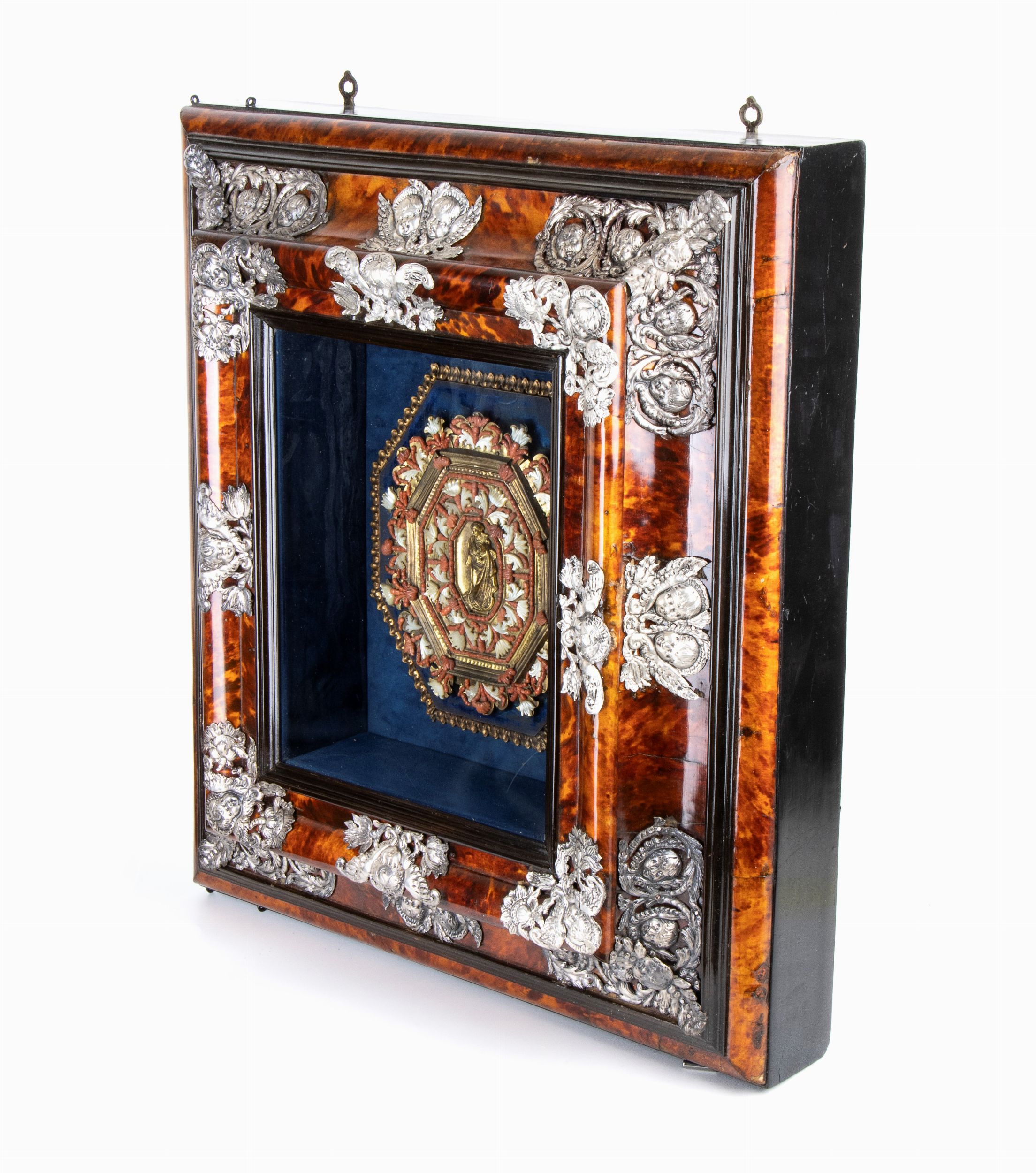 La ricca composizione è posta su una lamina di rame dorato punzonato e viene incentrata intorno alla figura devozionale dell'Immacolata posta sulla mezzaluna e raffigurata con le mani congiunte sul petto.