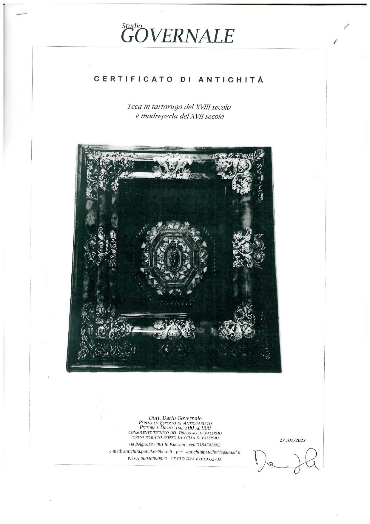 Racchiuso in una teca di forma rettangolare (probabilmente più tarda), interamente lastronata in tartaruga (Cheloniidae spp.) con applicazioni in lamina d'argento raffiguranti putti alati, troviamo un capezzale di forma ottagonale oblunga.