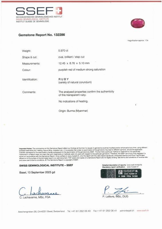 ANELLO A FASCIA CON RUBINO BIRMANO E DIAMANTI in oro giallo 18kt, al centro un rubino birmano taglio ovale (smontato) di ct 5.97, con fascia traforata impreziosita da diamanti taglio brillante per ct 1.20 circa, punzoni 750 e del fabbricante, mis. 12/52, gr. 11. Corredato di certificati SSEF del 13/09/2023 e IGN del 05/07/2023 attestante l'origine della pietra e l'assenza di trattamenti termici.