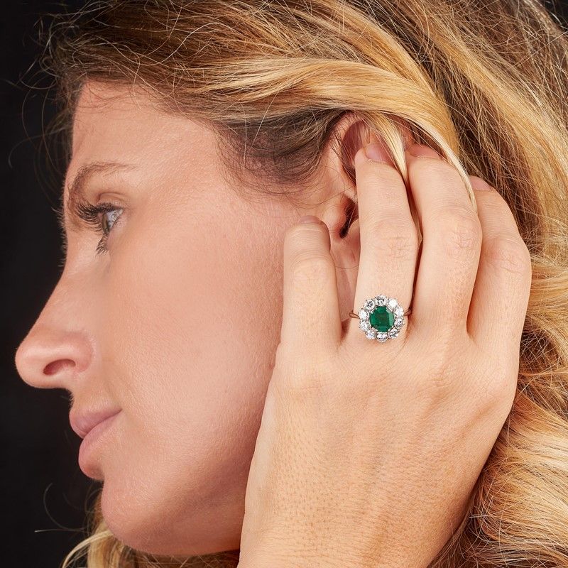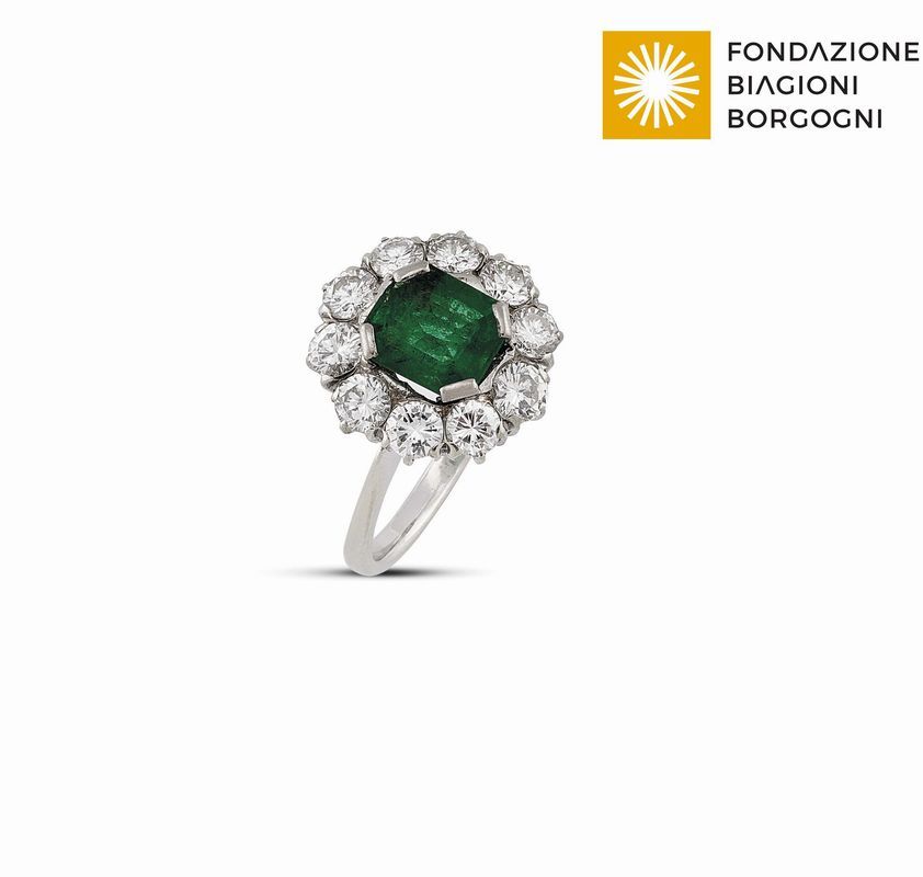 ANELLO A MARGHERITA CON SMERALDO E DIAMANTI in oro bianco 18kt, impreziosito al centro da uno smeraldo taglio ottagonale di ct 1.30 circa, circondato da una fila di diamanti taglio brillante per ct 1.80 circa, mis. 14/54, gr. 3