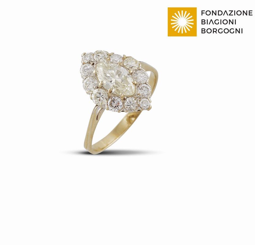 in oro bianco 18kt, impreziosito al centro da un diamante taglio navette di ct 0.90 circa, circondato da una fila di diamanti taglio brillante per ct 0.80 circa, mis. 15/55, gr. 2
